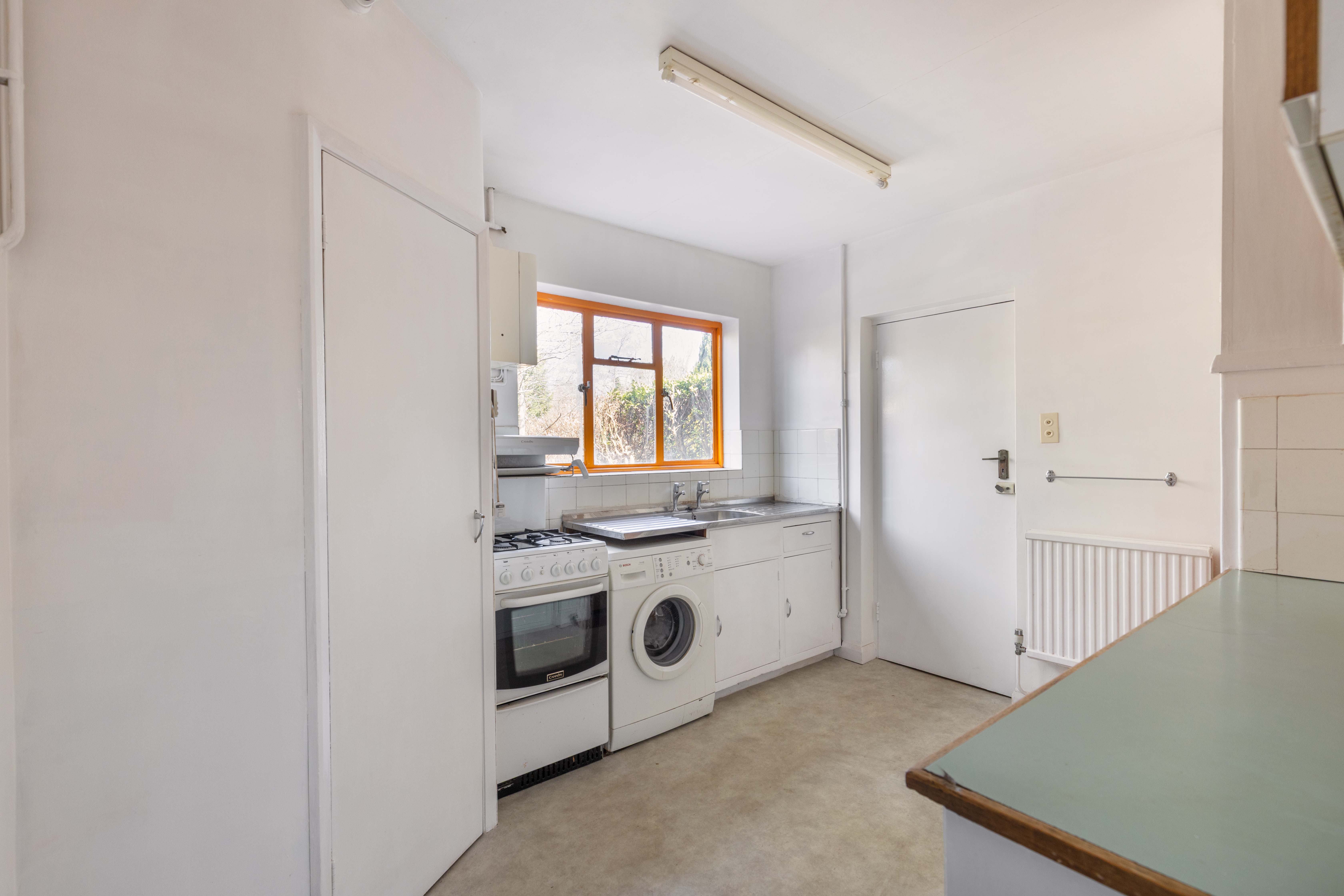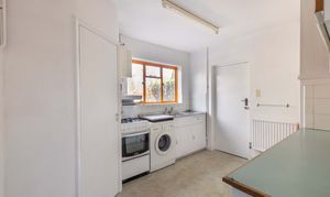 To the rear of the property is the kitchen, with a window overlooking the rear garden and fitted with a selection of original kitchen cupboards, a freestanding cooker and washing machine. Adjacent is a small workshop, which also provides access to the rear garden and the integrated garage. A separate WC completes the accommodation on this floor.
