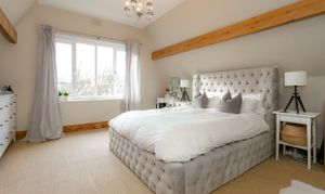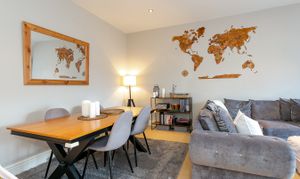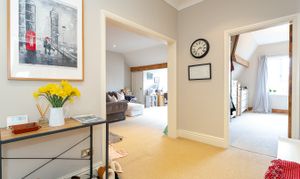 Accessed via secure entry, the apartment's front door opens into a spacious reception hall. Branching off to the front there is a lovely living room with an exposed beam and two useful storage cupboards. To the rear elevation there is a modern fitted breakfast kitchen with a number of storage units, integrated appliances and travertine tiled flooring. There is a very well proportioned principal bedroom complete with a stylish, travertine tiled shower room, a second double bedroom with storage cupboard and a partially tiled house bathroom with an array of eaves storage space.