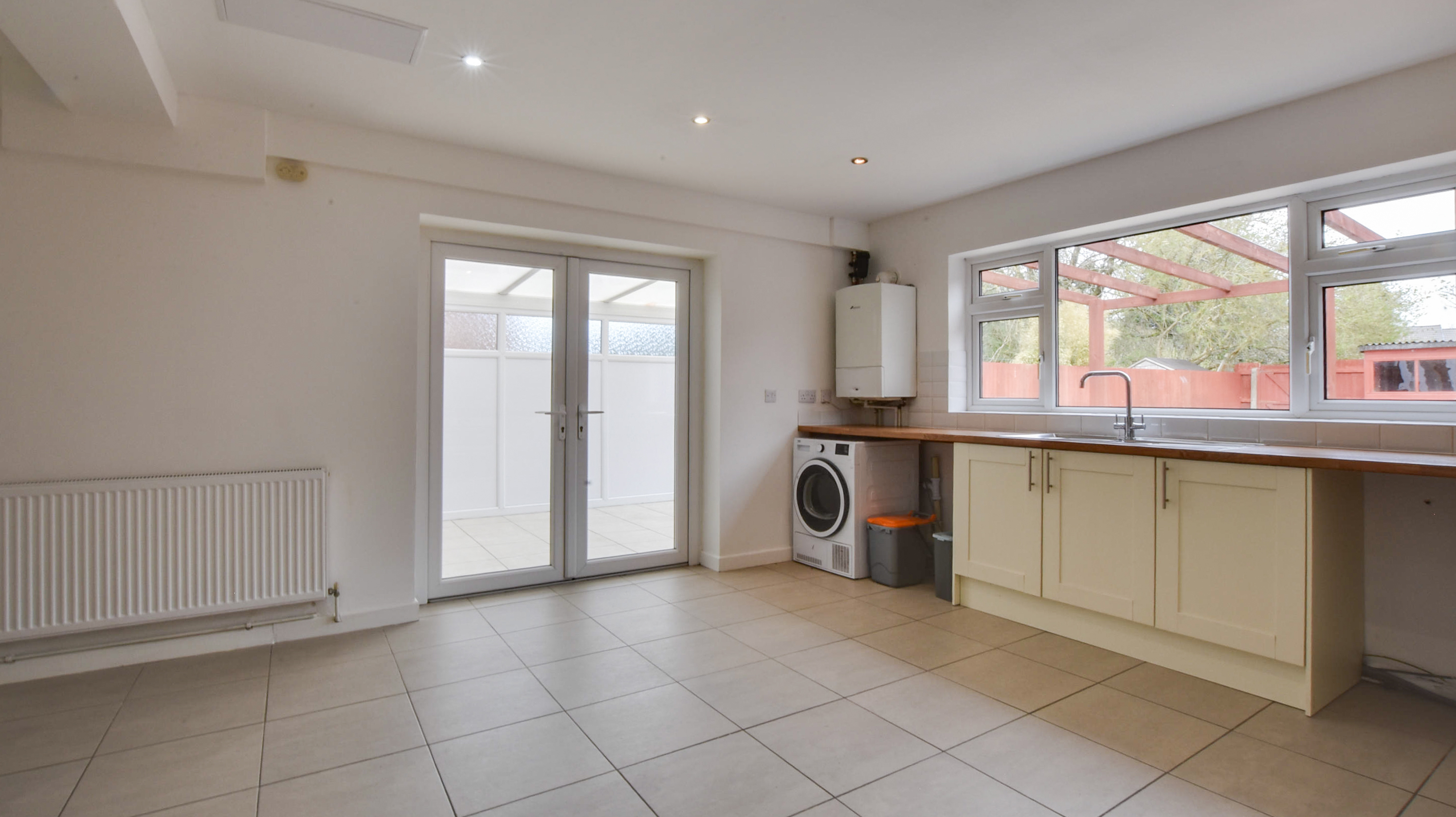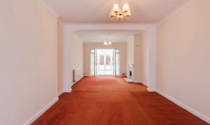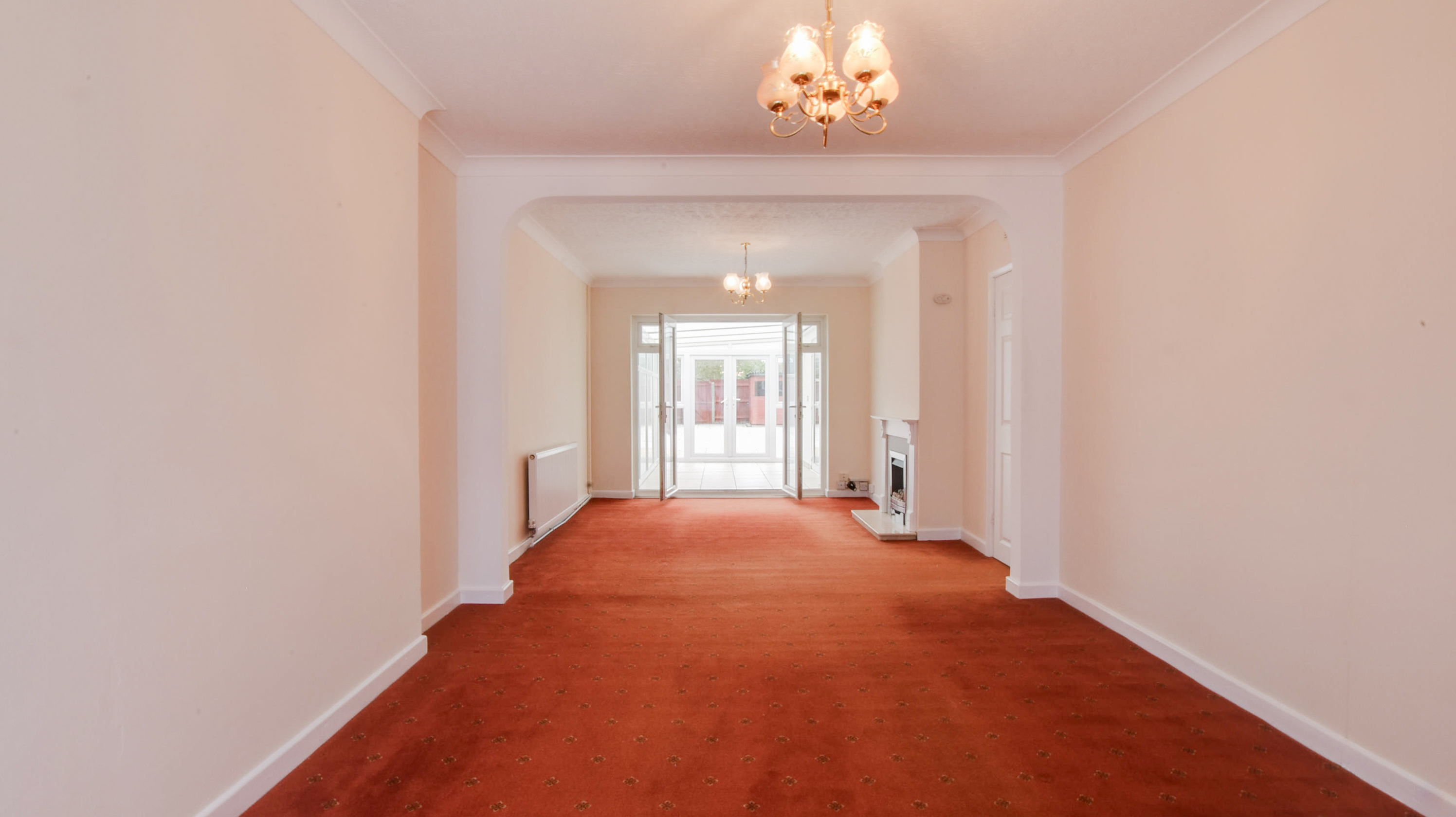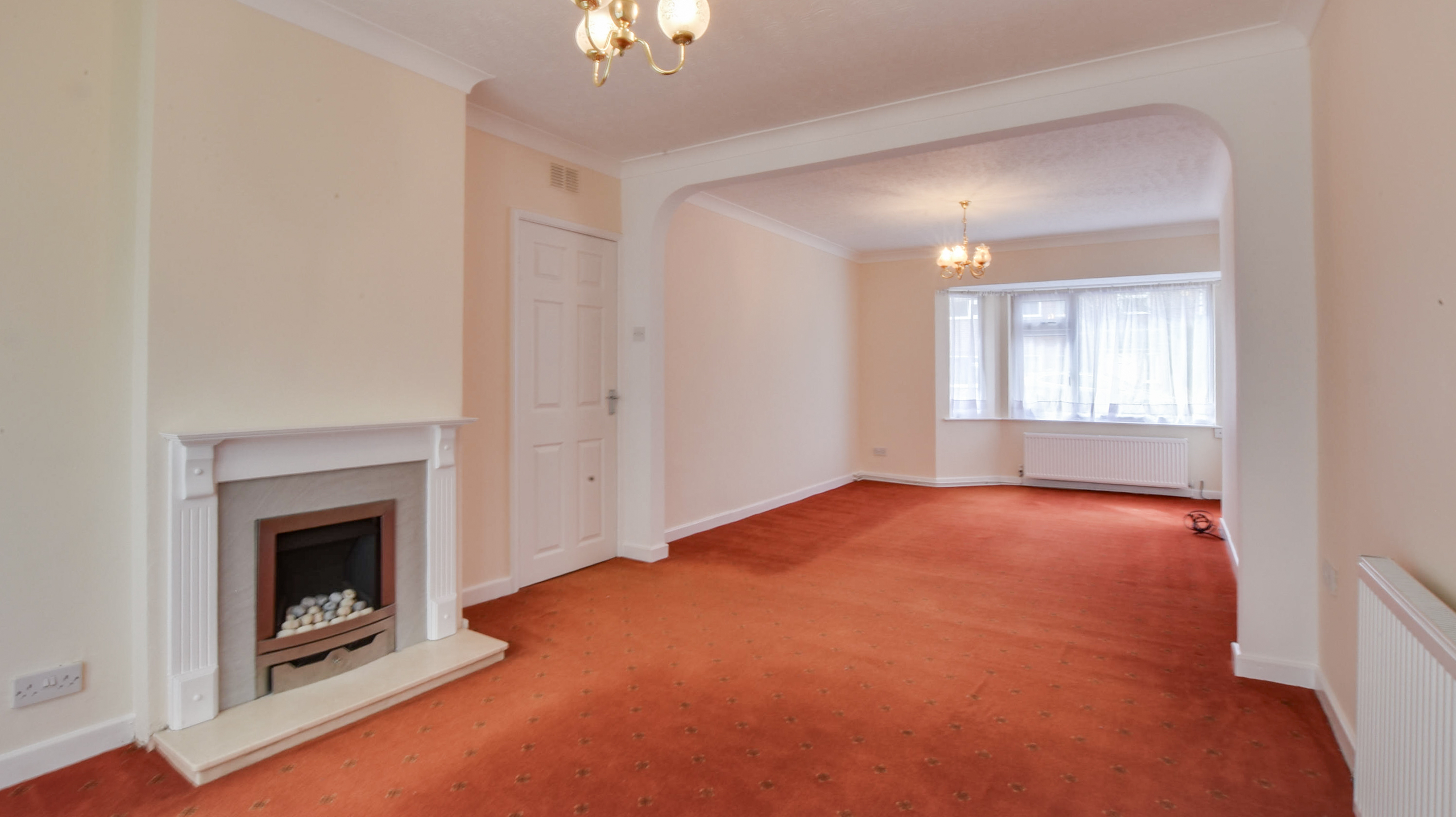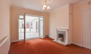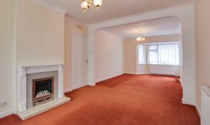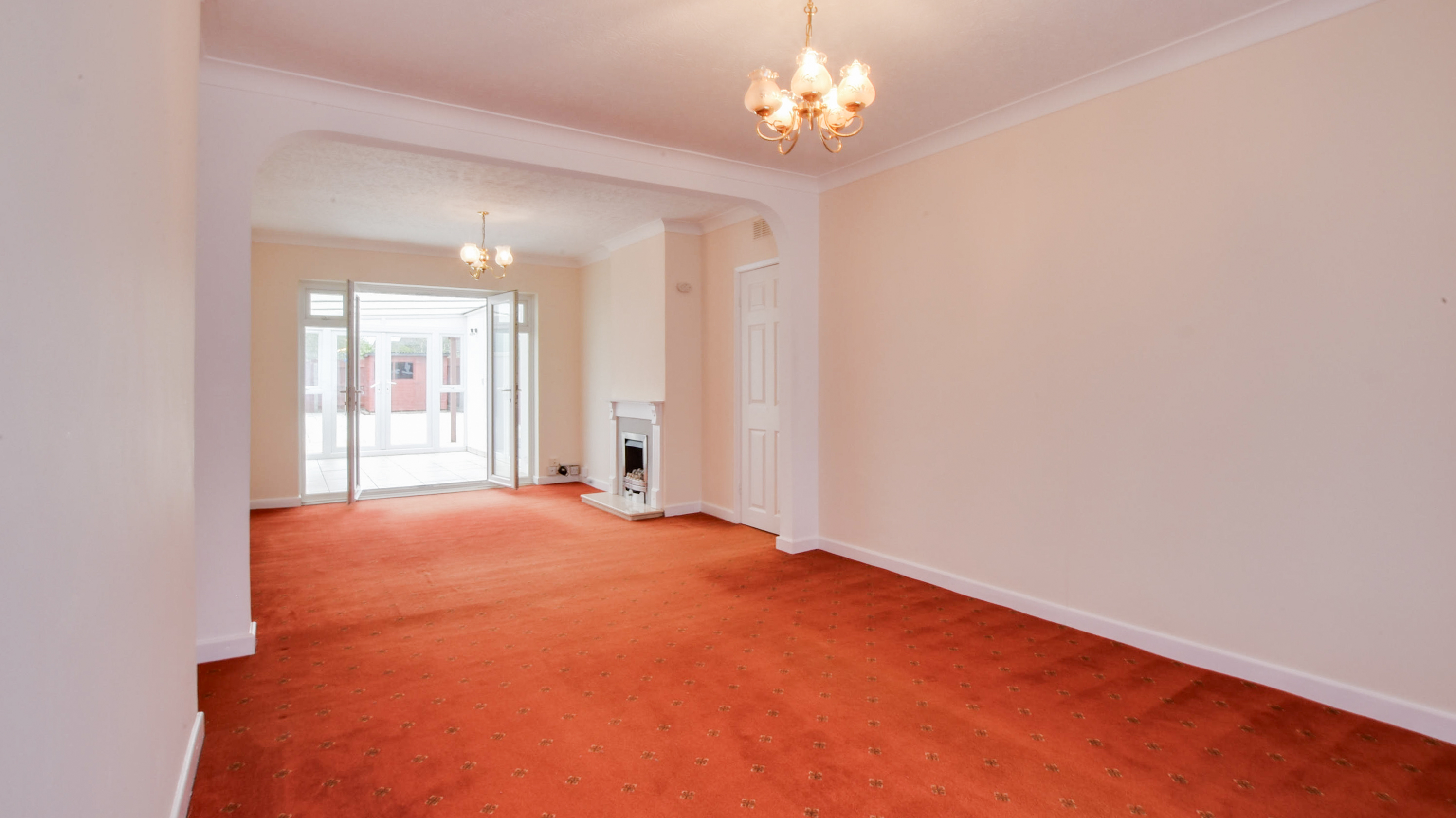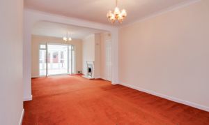 This spacious through lounge diner has access to the conservatory via French doors. With a window to the front, carpet, gas fire with surround and two radiators.