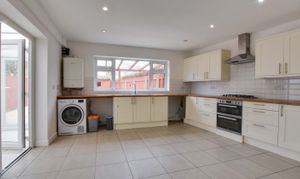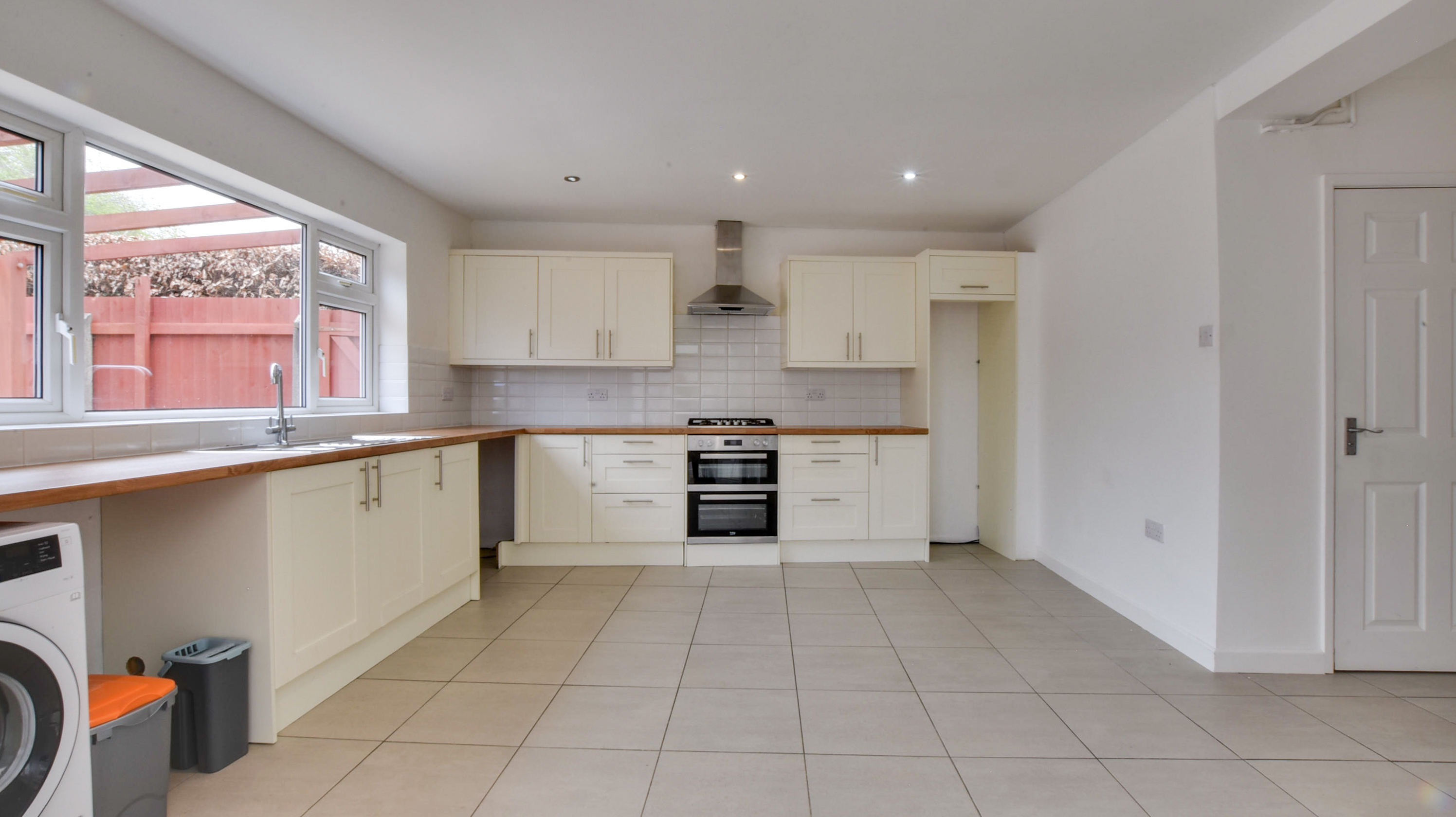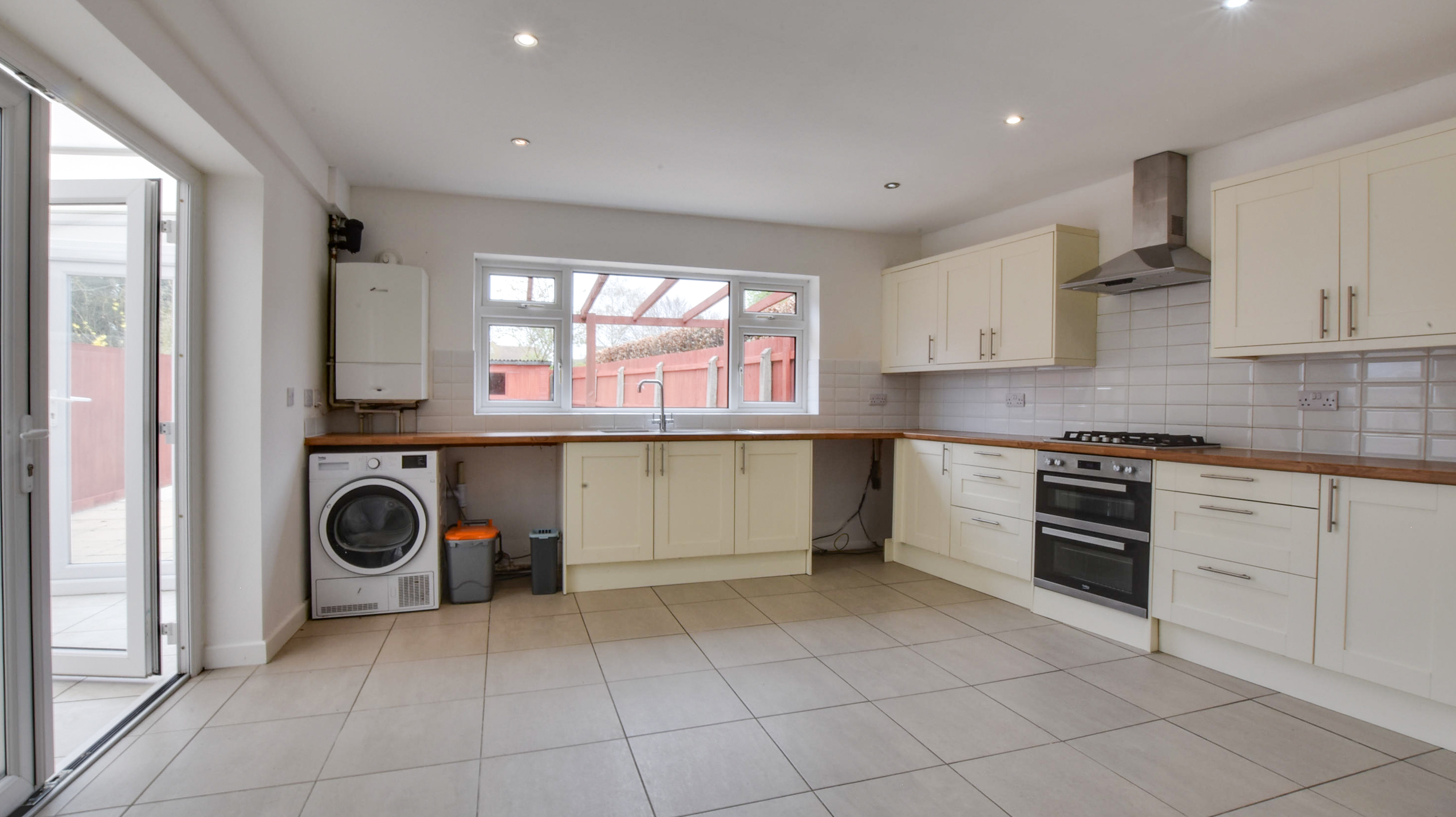 A practical kitchen with a mix of wall and base units, sink and drainer unit with mixer tap, part tiled walls, space for appliances such as fridge freezer, washing machine, dishwasher. Built in oven and hob with extractor fan over and tiled splashbacks. Ceiling spotlights, tiled flooring radiator, boiler and a double glazed window overlooking the rear garden