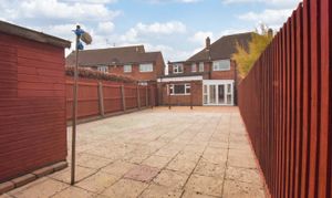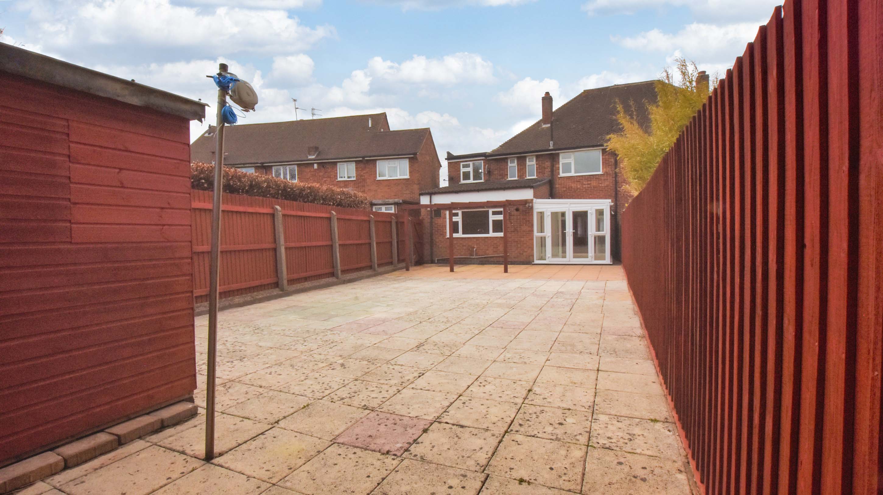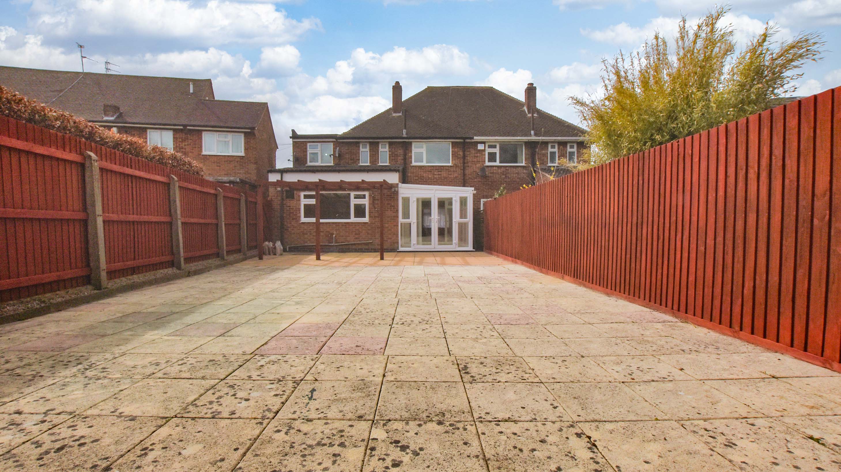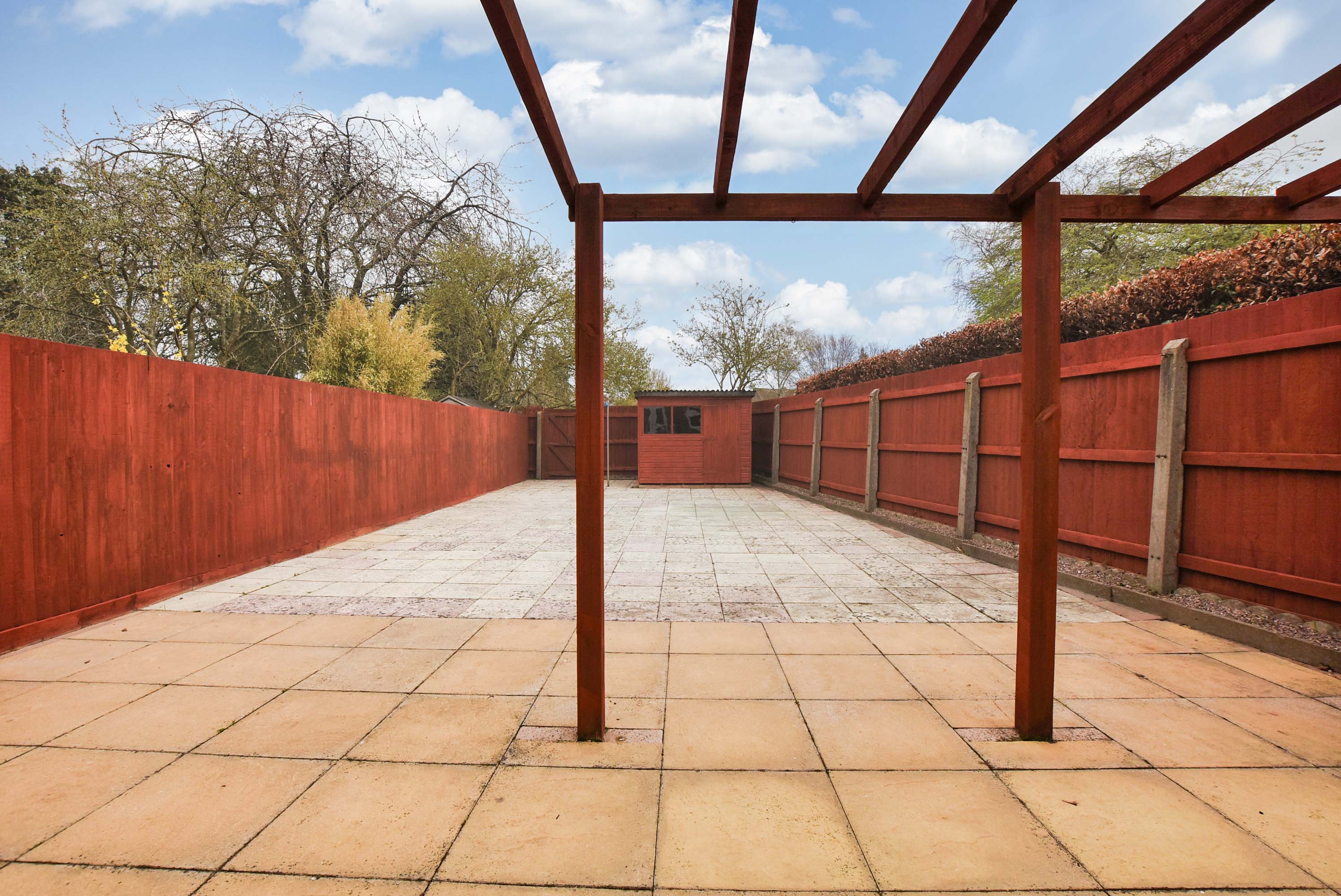 Low maintenance slabbed patio rear garden with a pergola, shed, fully fenced surround and gated rear and side access.