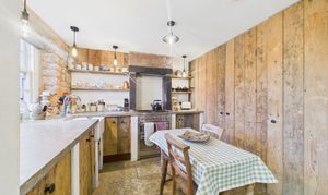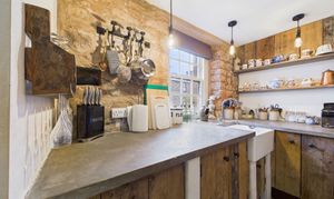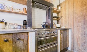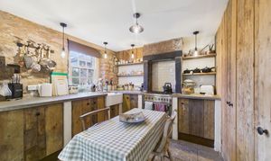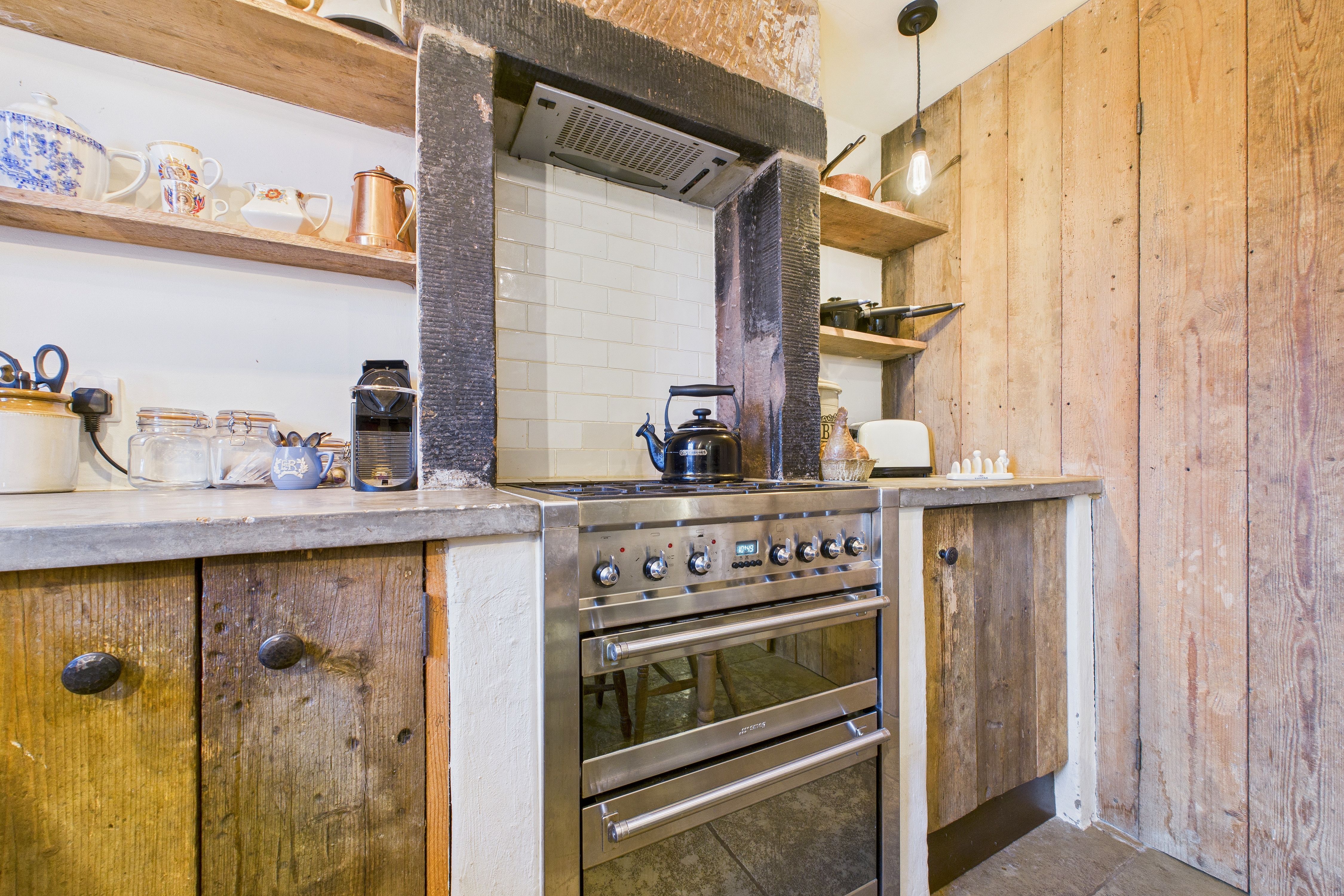 - The kitchen has a range of bespoke wooden cabinets which add to the rustic charm