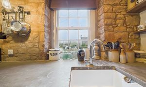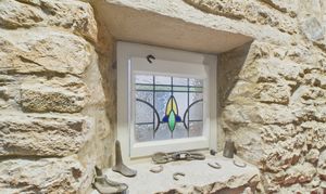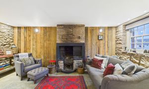 The ground floor reveals an inviting open plan layout, thoughtfully designed to create a sociable and welcoming space, perfect for relaxed evenings. The lounge is truly the heart of the home, where a striking open fire takes centre stage, complete with the original bread oven as a delightful nod to the cottage’s heritage. The neutral décor accentuates the natural beauty of the stonework, while underfloor heating ensures comfort throughout the seasons.