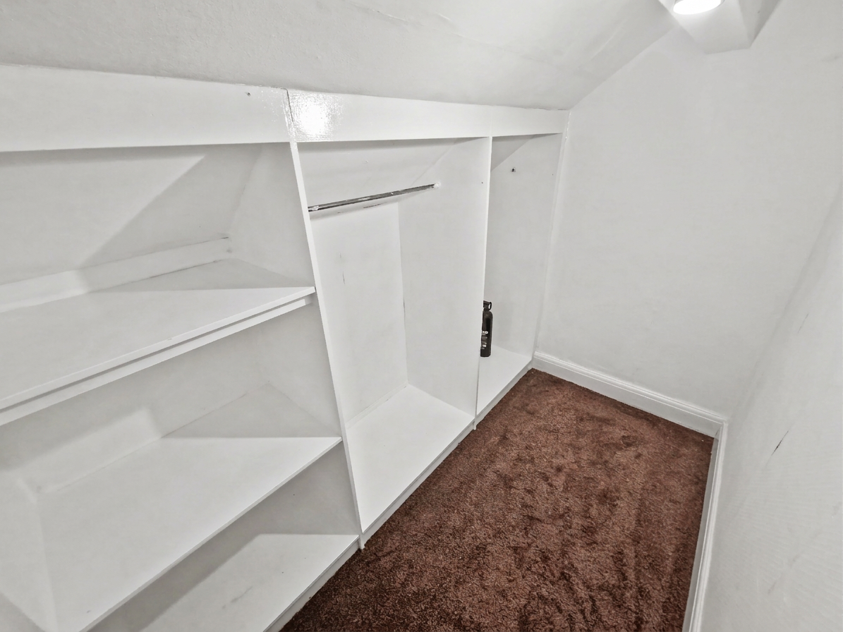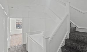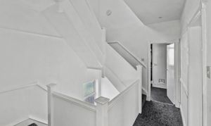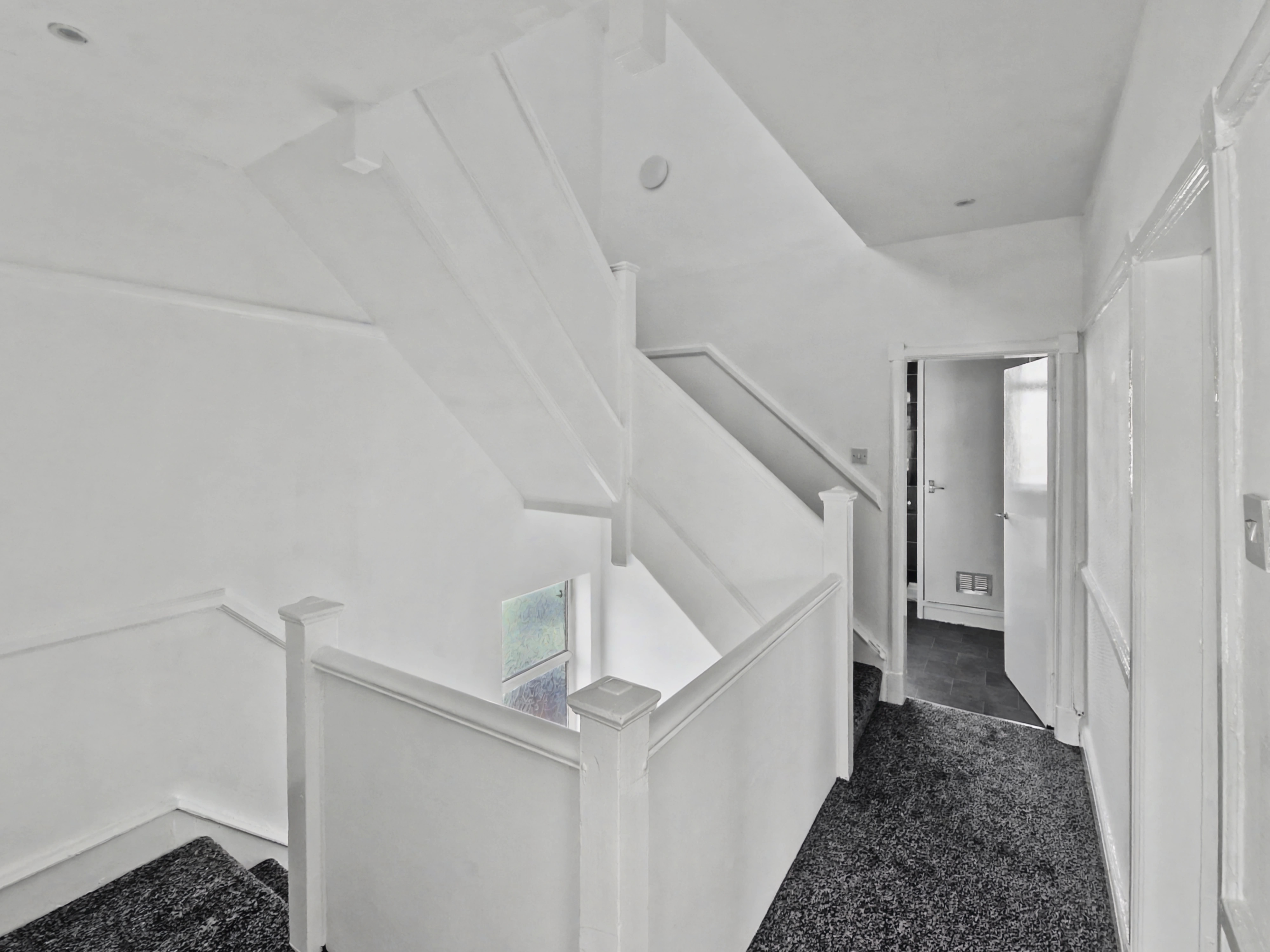 A further staircase leads to the second-floor landing, which provides access to a fire escape door opening onto a balcony. The second floor offers two additional large double bedrooms, one to the front and one to the rear, along with a useful storage room that could serve as a walk-in wardrobe.