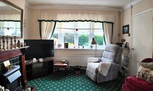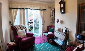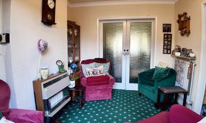 The property opens via a small front porch into a hallway that leads to two separate reception rooms, divided by a pair of glass sliding doors. The rear reception opens through patio doors onto the garden, creating a bright and inviting living space.