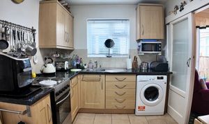 The fitted kitchen includes an additional side porch, offering extra storage or access, while the low-maintenance garden features a storage shed and driveway for convenience.