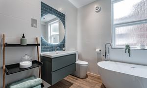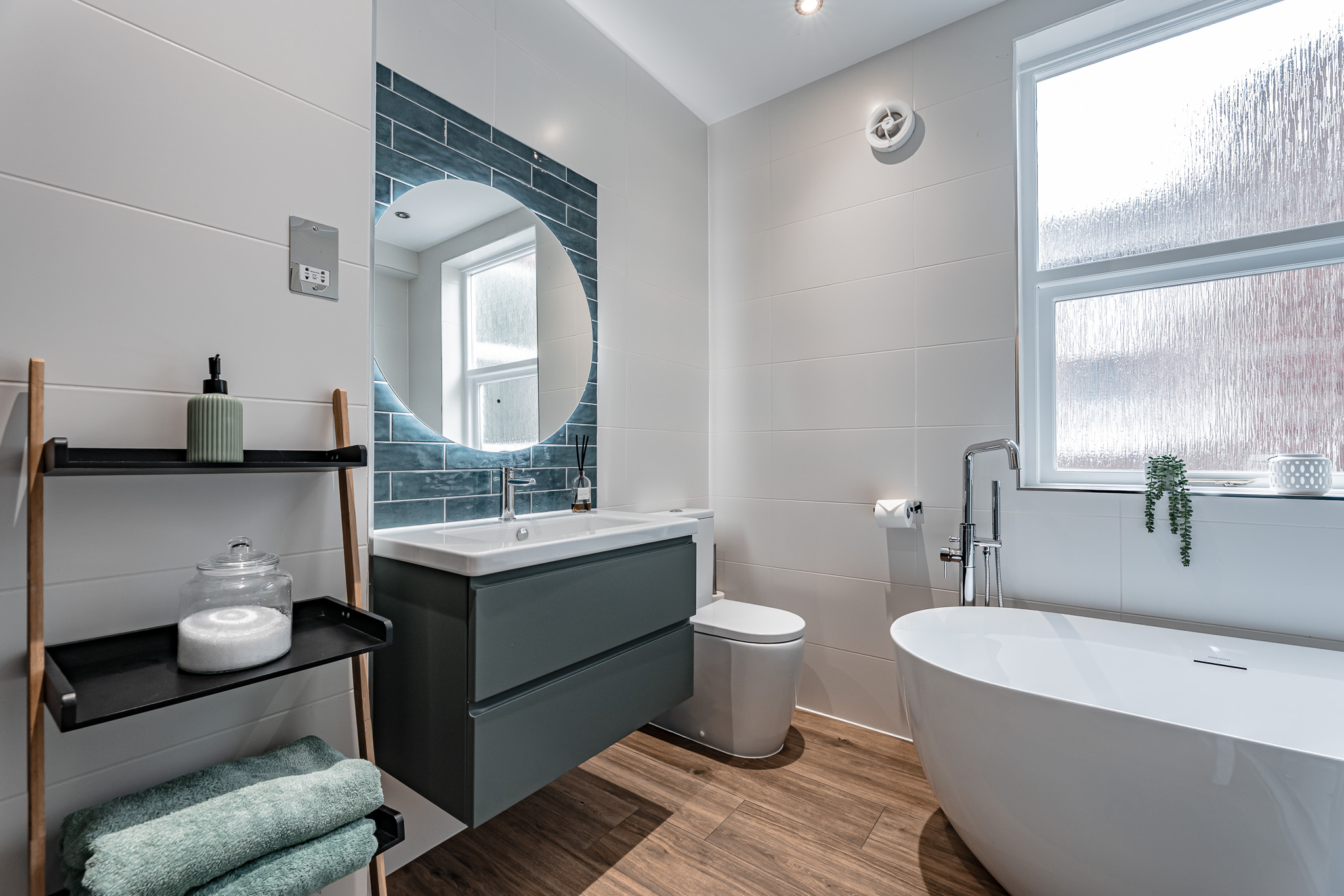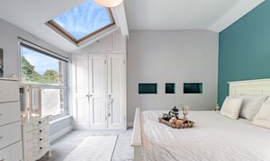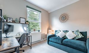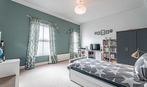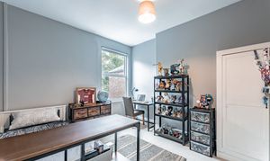 On the first floor, the home continues to impress. The rear bedroom, currently used as an study, enjoys views over the garden, ideal for working from home. A stylish family bathroom features a freestanding bathtub and a walk-in tiled shower, adding a touch of luxury. Two further bedrooms on this floor are generously sized, with the front-facing room offering abundant natural light through twin windows and ample floor space.
