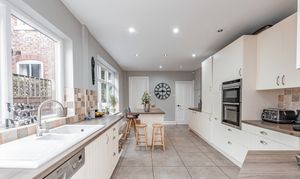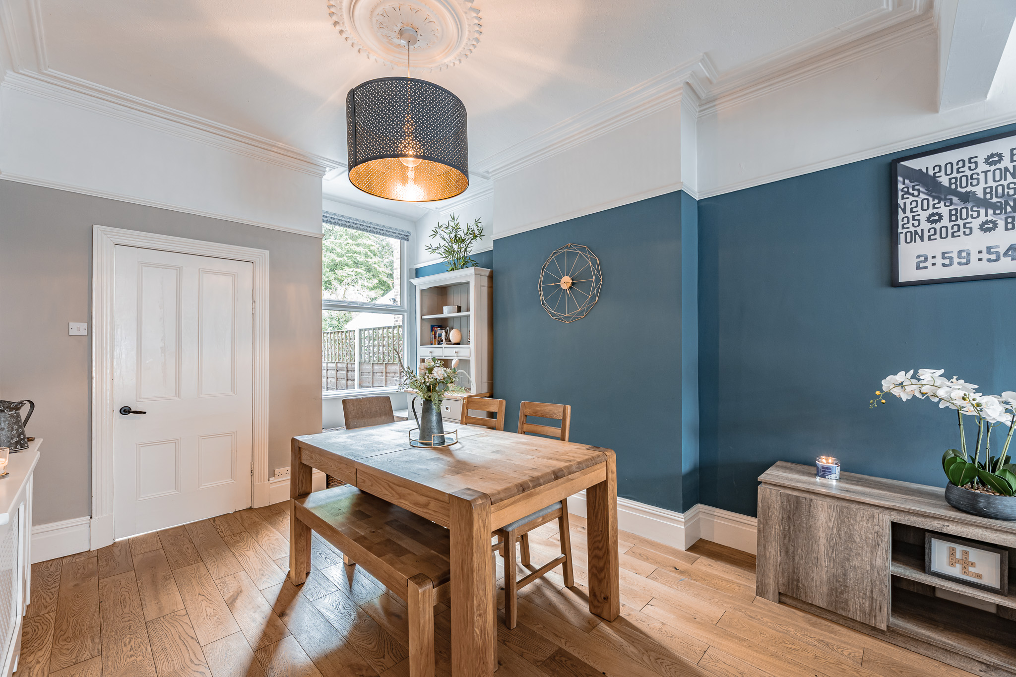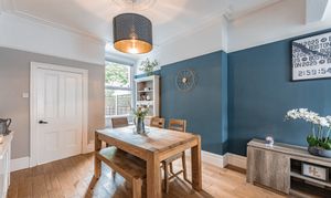 The ground floor boasts an open-plan lounge and dining area, where a large bay window floods the space with natural light. An electric fire creates a cosy focal point in the lounge, while the adjoining dining area is ideal for everyday family meals or relaxed Sunday roasts. A step leads down to the well-equipped kitchen, where tiled floors and a breakfast bar provide a stylish yet practical setting for casual dining. Modern Neff appliances including two ovens (one a combi), a gas hob, full-size dishwasher, and fridge-freezer, ensure this kitchen is as functional as it is inviting.