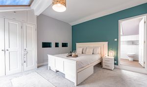 The second floor is home to a peaceful and beautifully finished principal suite. This light-filled retreat features plush carpeting, built-in wardrobes, and eaves storage. The ensuite bathroom, complete with skylight, bath with overhead shower, and modern fittings, provides both practicality and comfort.