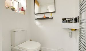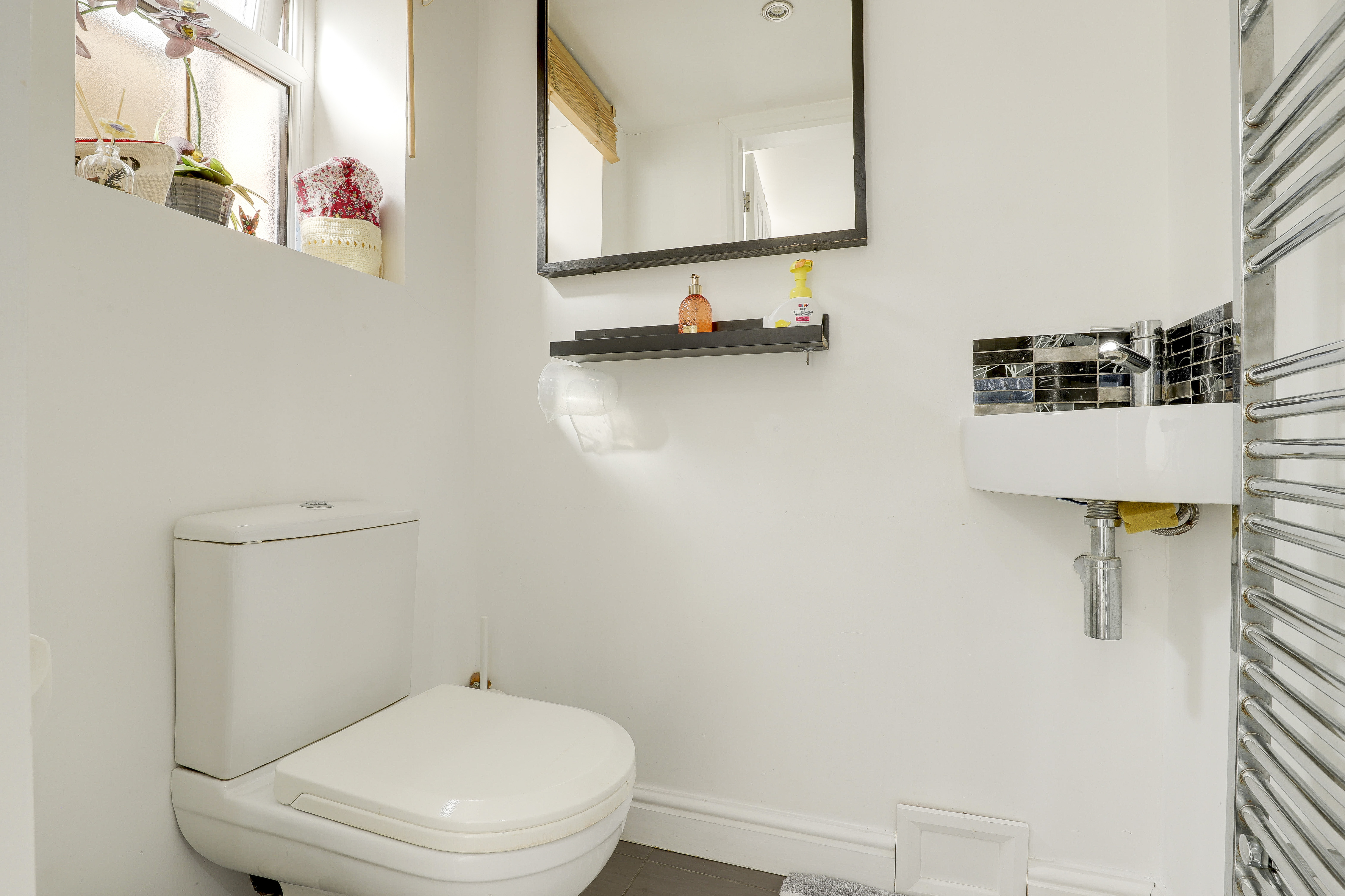 This space has a UPVC double glazed obscure window to the rear elevation, a low level flush W/C, a wall-mounted wash basin with a tiled splashback, a chrome heated towel rail, a singular recessed spotlight, and tiled flooring.