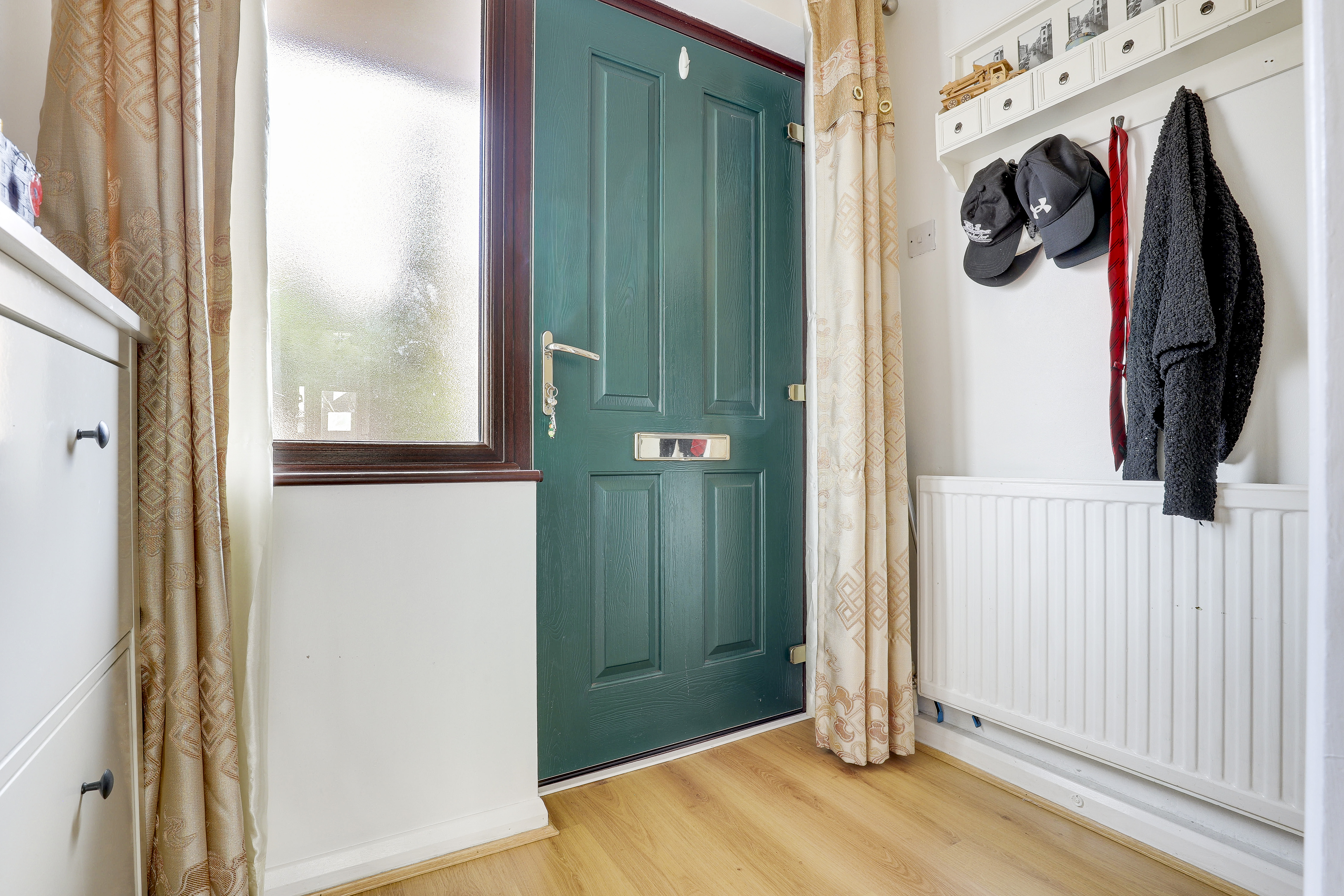 The entrance hall has wood-effect flooring, carpeted stairs, a radiator, an obscure double glazed window to the front elevation, coving to the ceiling, and a door providing access into the accommodation.