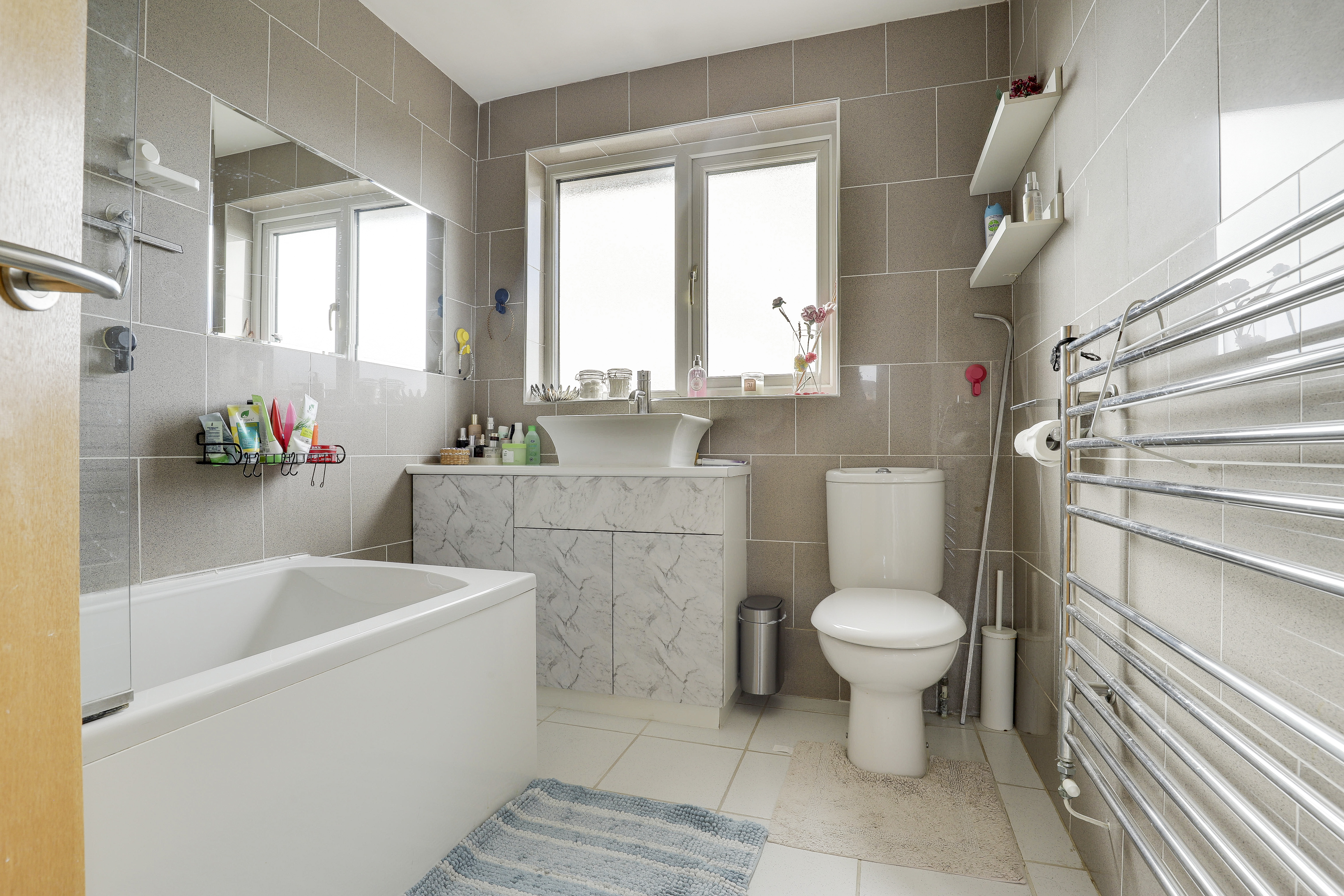 The bathroom has a UPVC double glazed obscure window to the rear elevation, a low level flush W/C, a counter-top wash basin, a panelled bath with a handheld shower fixture and shower screen, a chrome heated towel rail, floor-to-ceiling tiling, and tiled flooring,