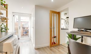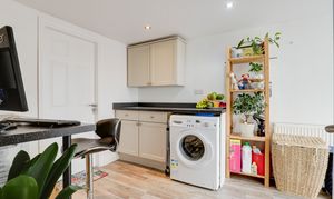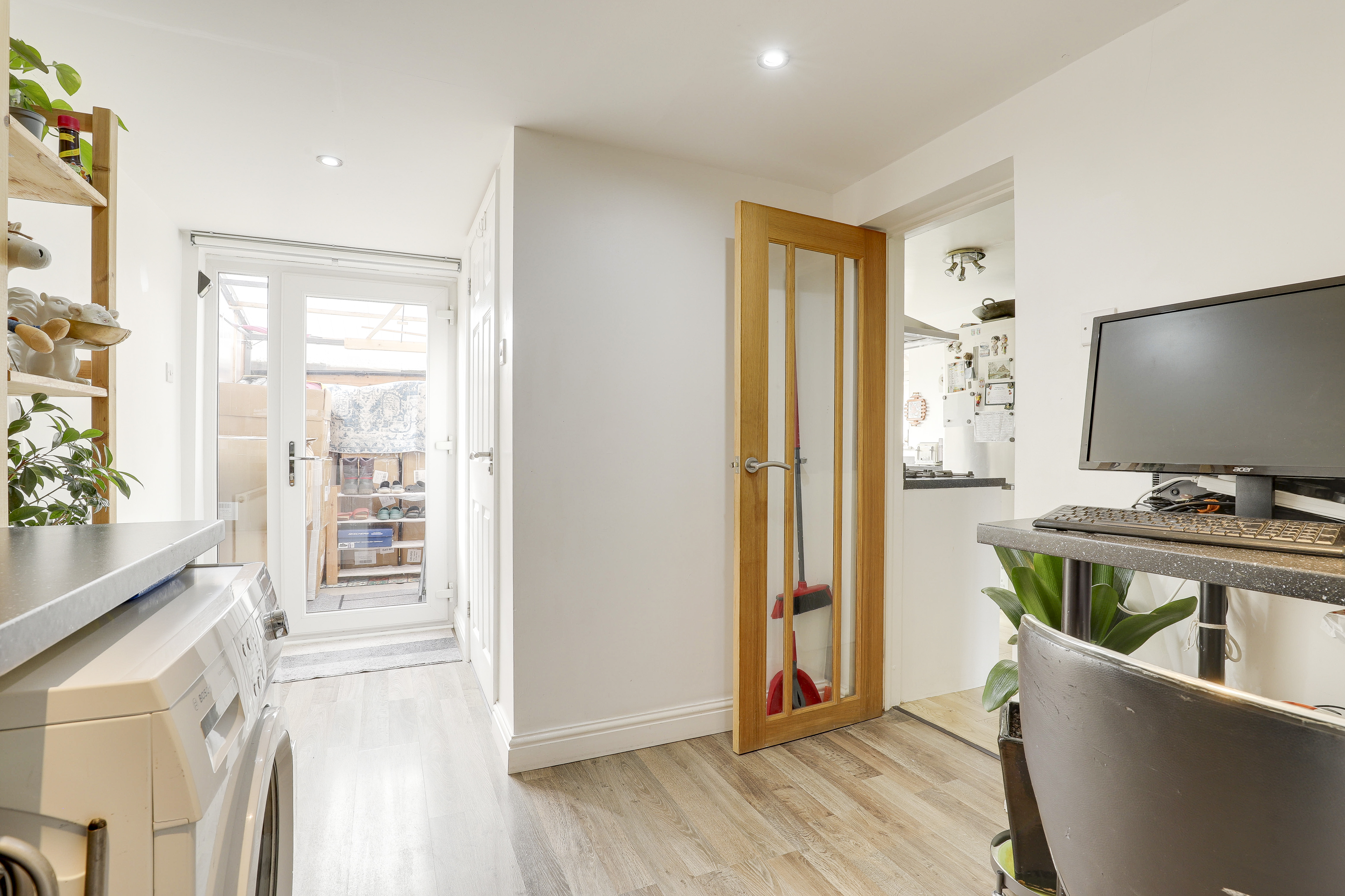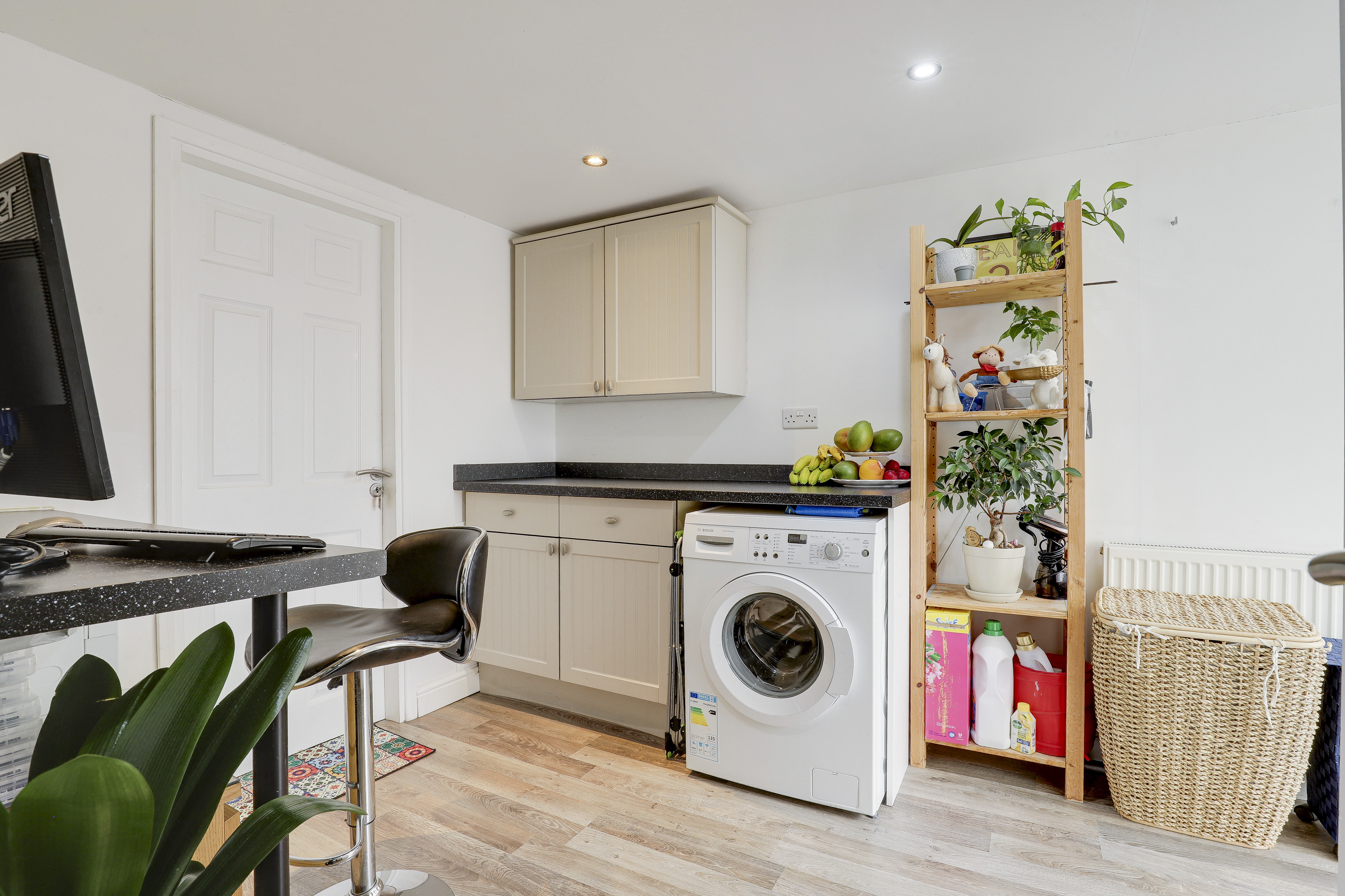 The utility room has fitted base and wall unites with a worktop, space and plumbing for a washing machine, space for a tumble dryer, a radiator, recessed spotlights, and a door opening to the rear garden.