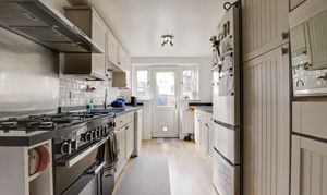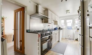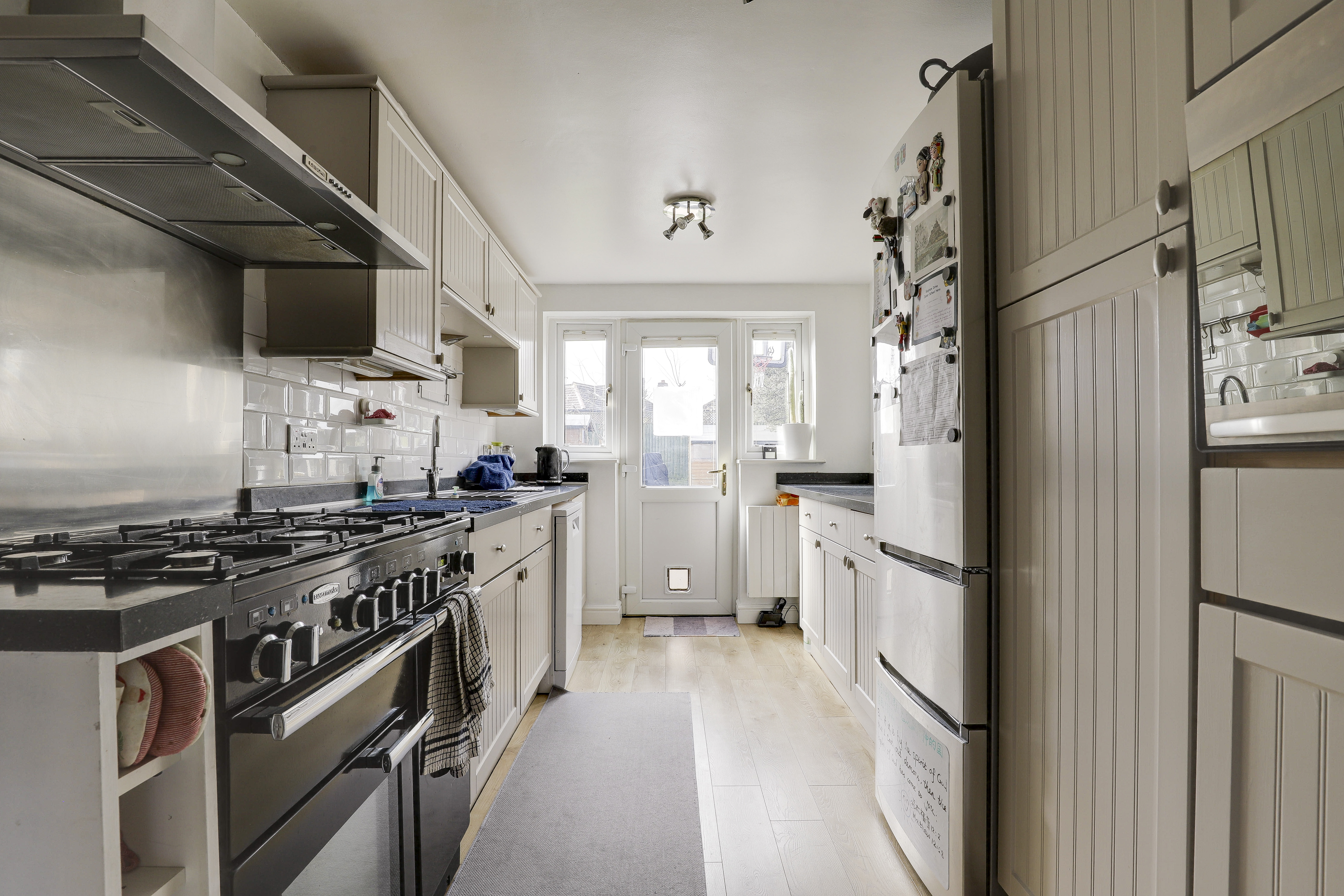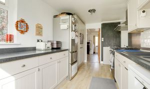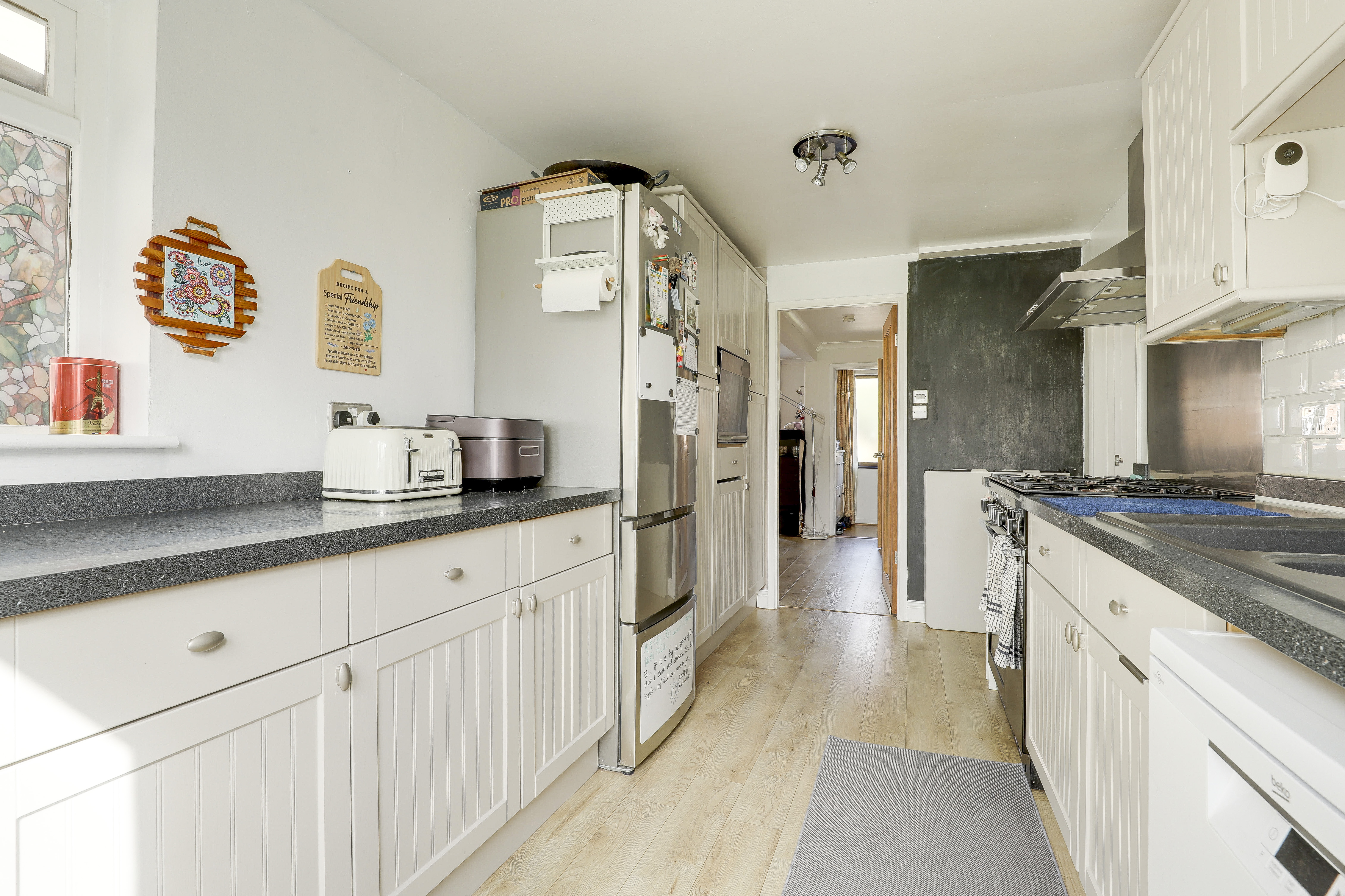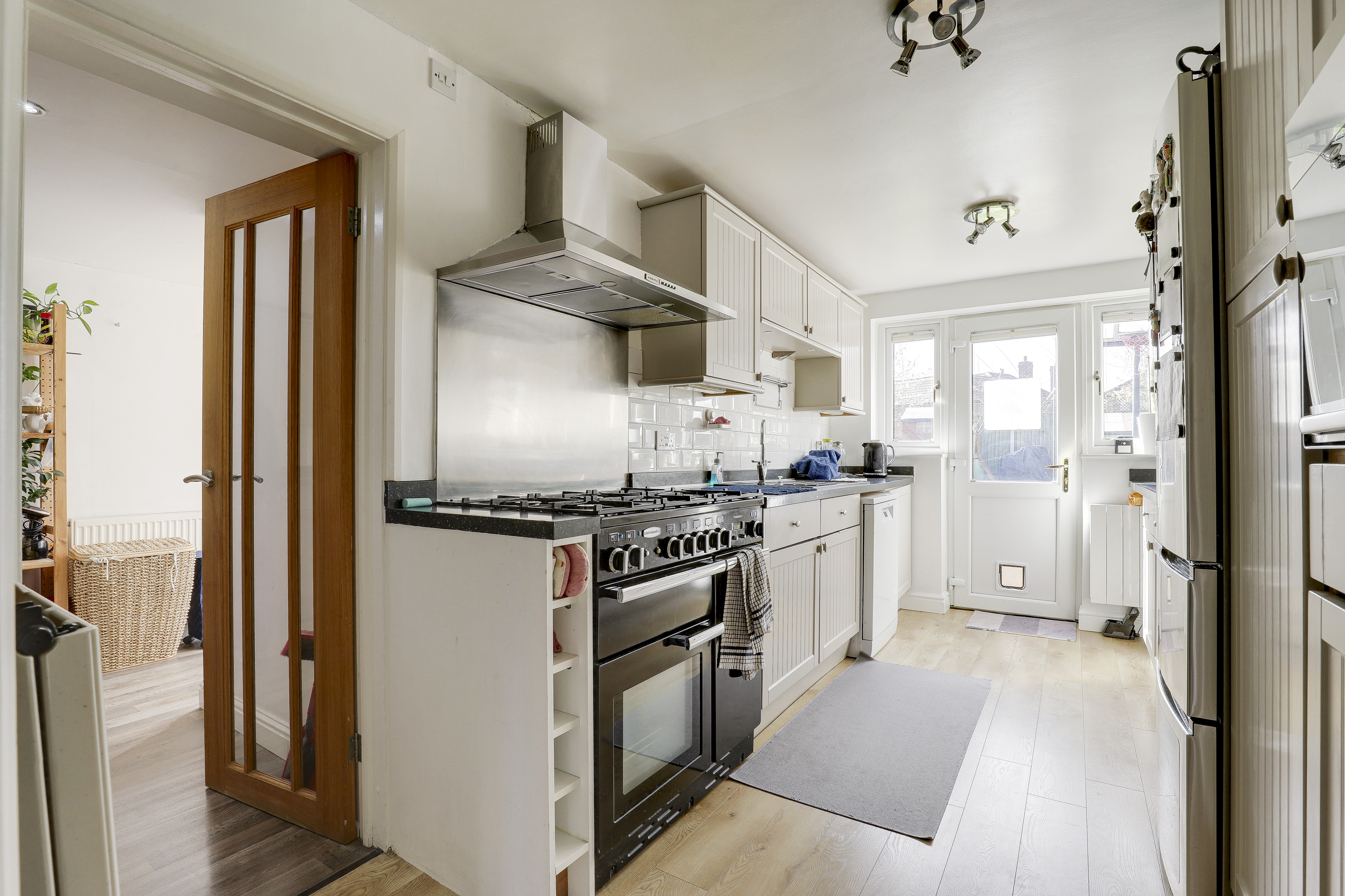 The kitchen has a range of fitted base and wall units with worktops, a sink and half with a swan neck mixer tap and drainer, a range cooker and extractor fan, an integrated oven, space for a fridge freezer, space and plumbing for a dishwasher, tiled splashback, wood-effect flooring, UPVC double glazed windows to the side and rear elevation, and a door opening to the rear garden.