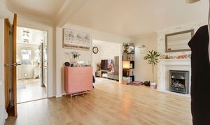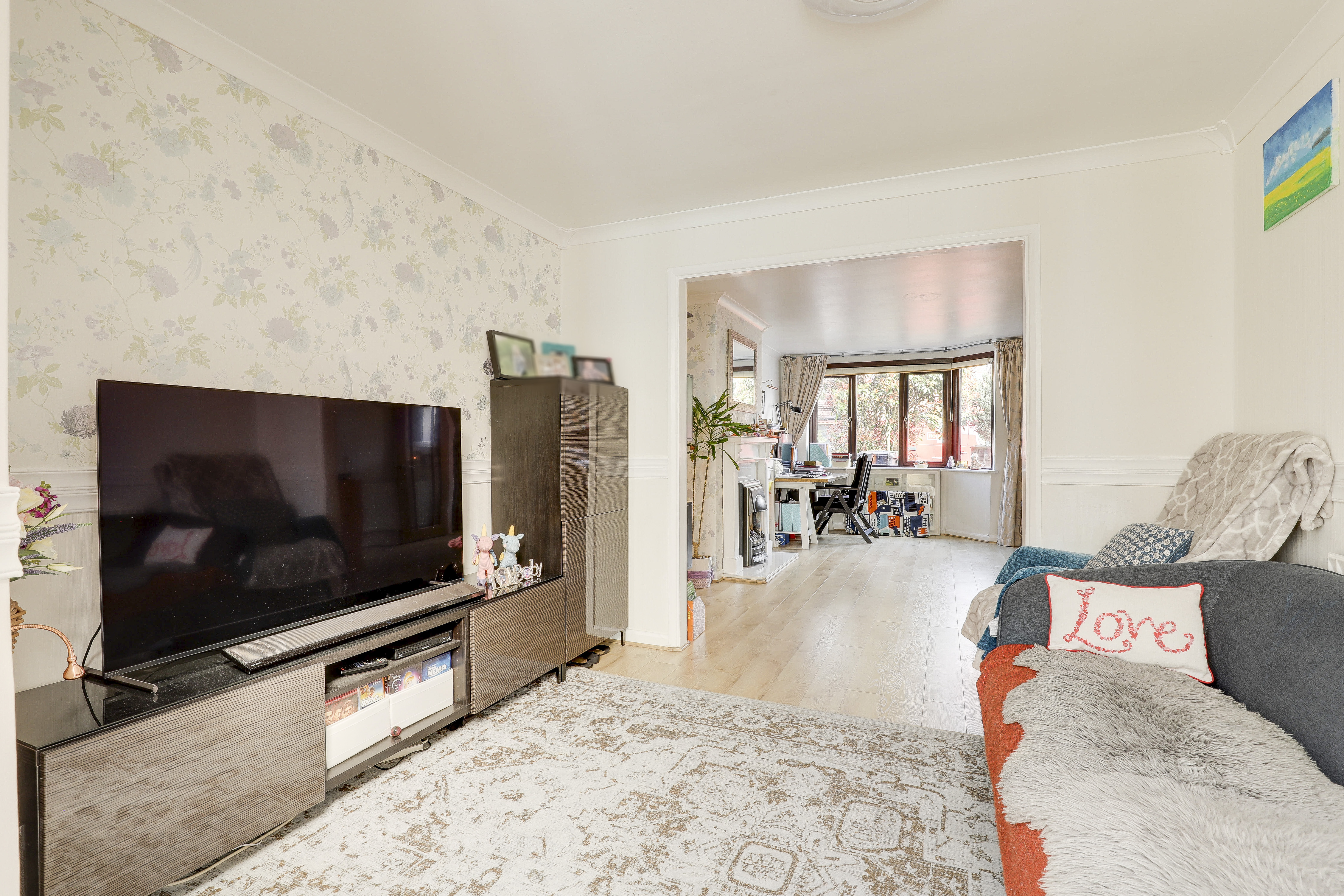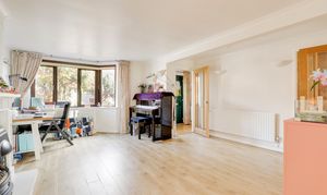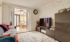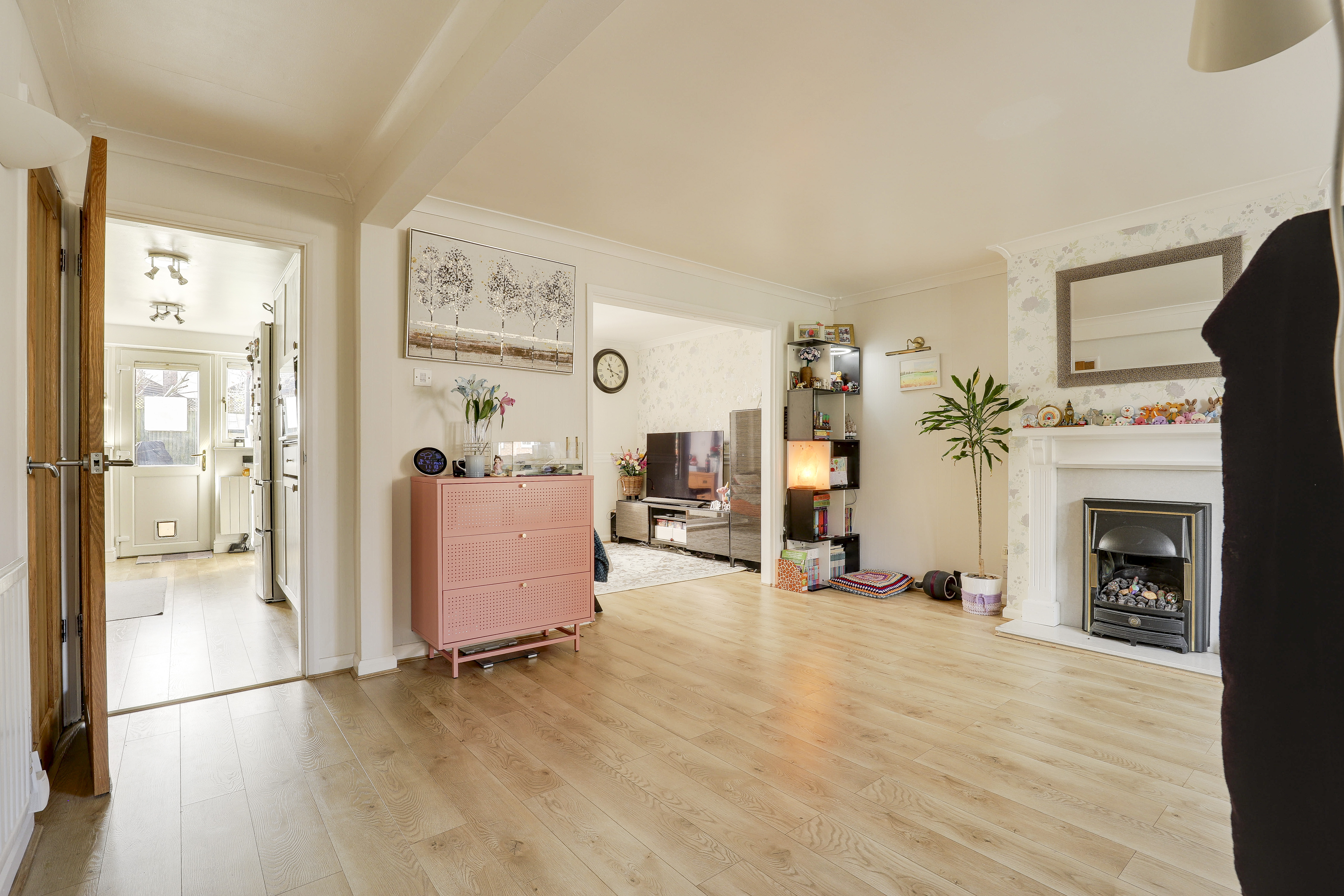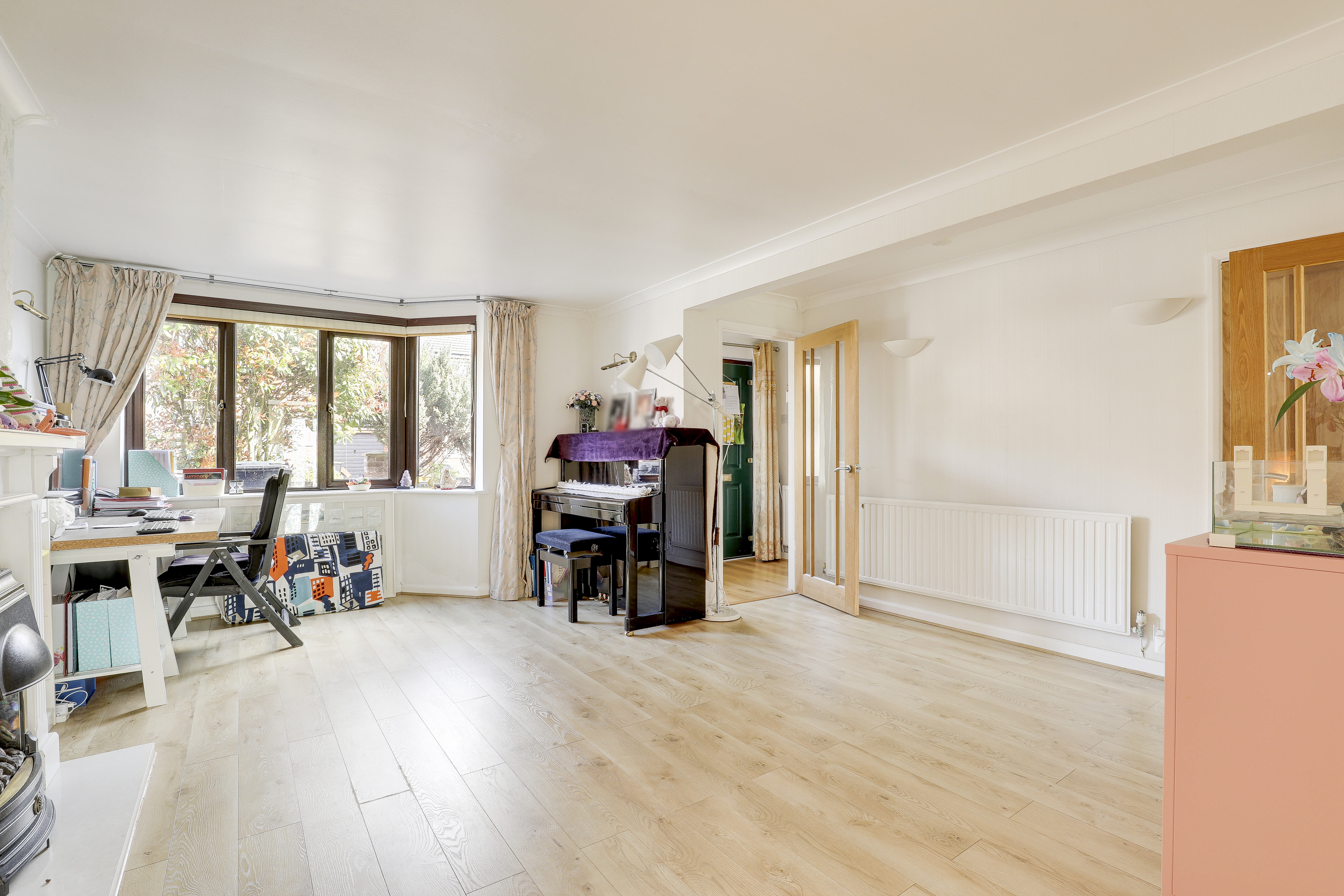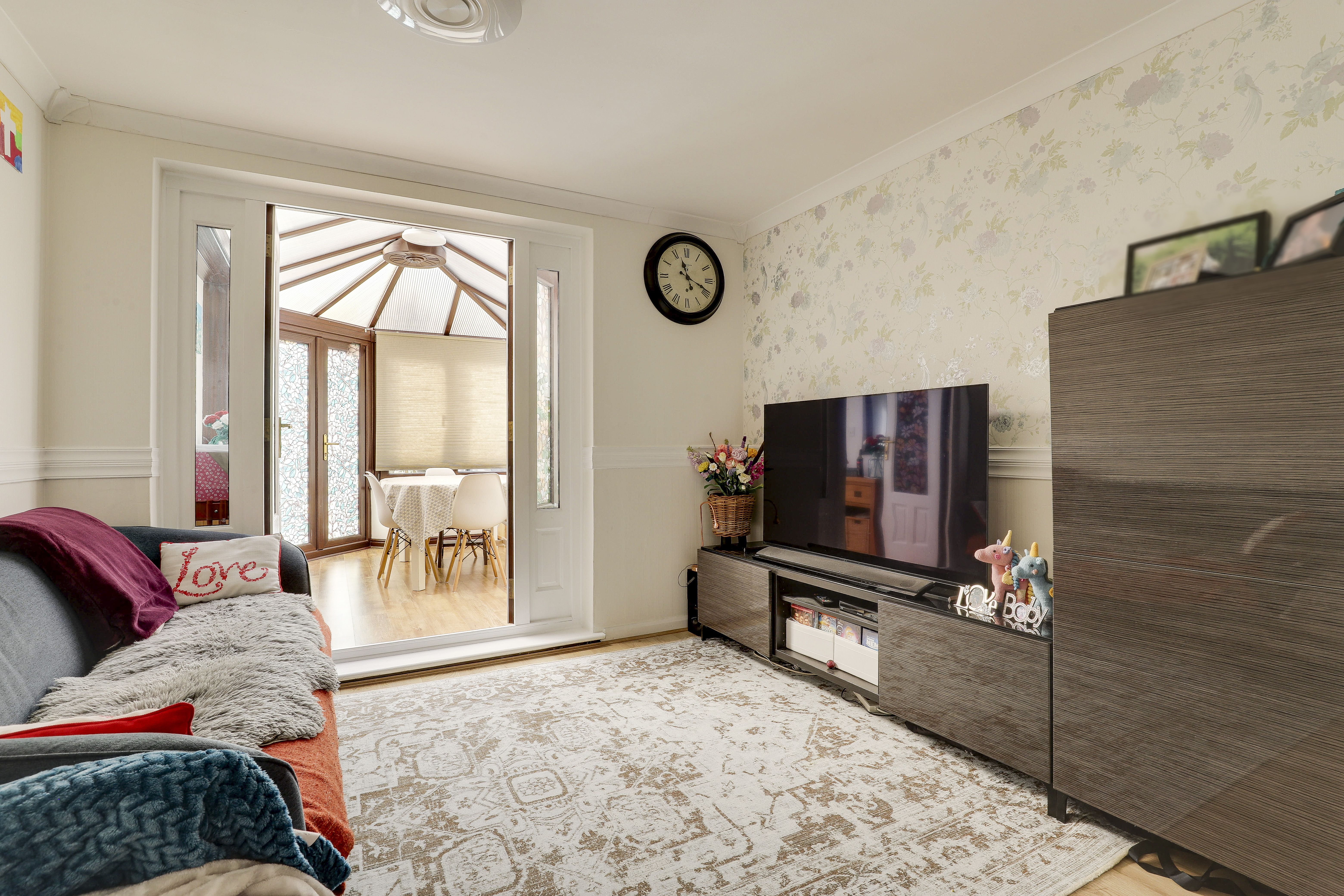 The family room has wooden framed UPVC double glazed windows to the front elevation, a feature fire place, a radiator, coving to the ceiling, wood-effect flooring, and opening access into the living room.