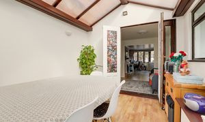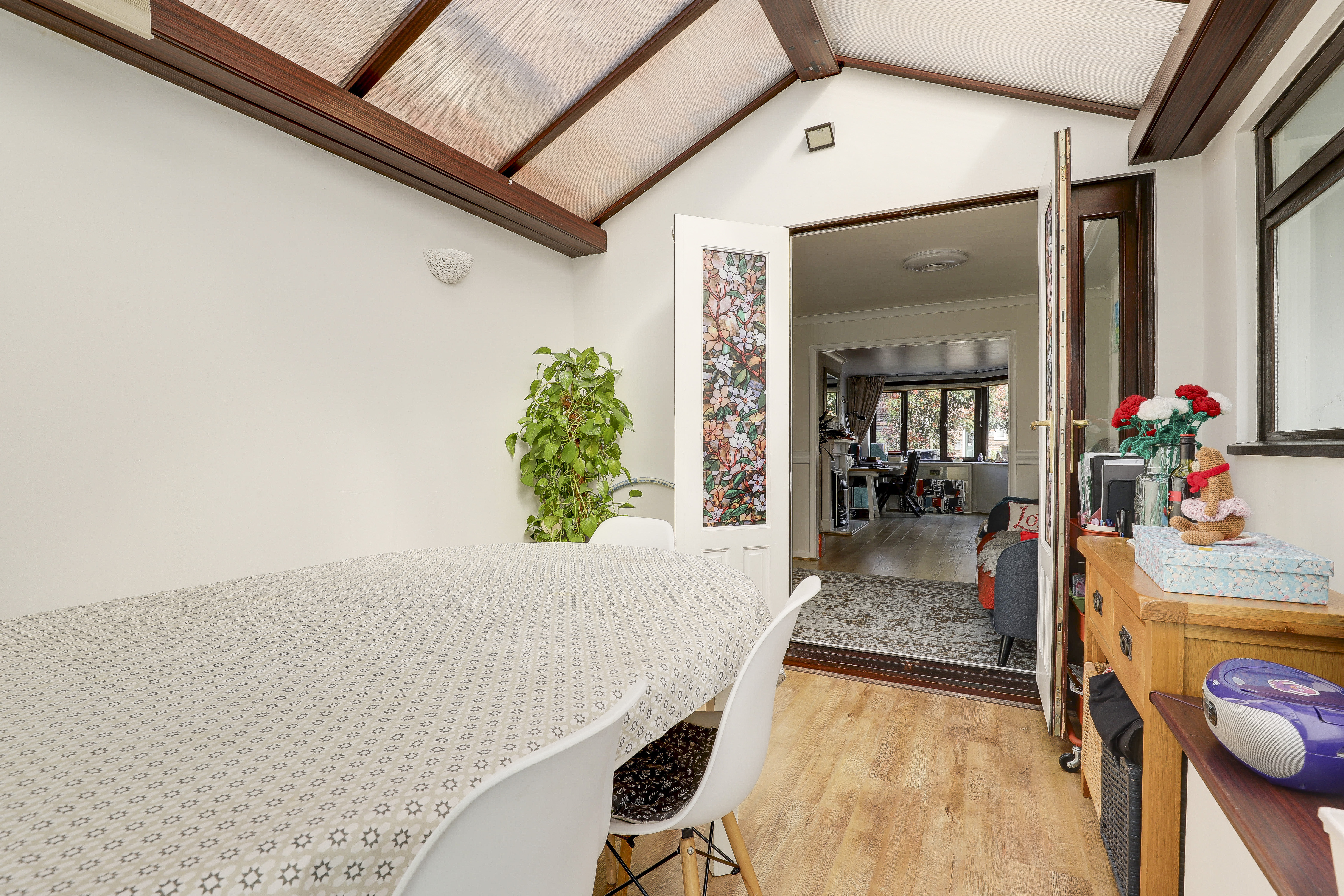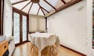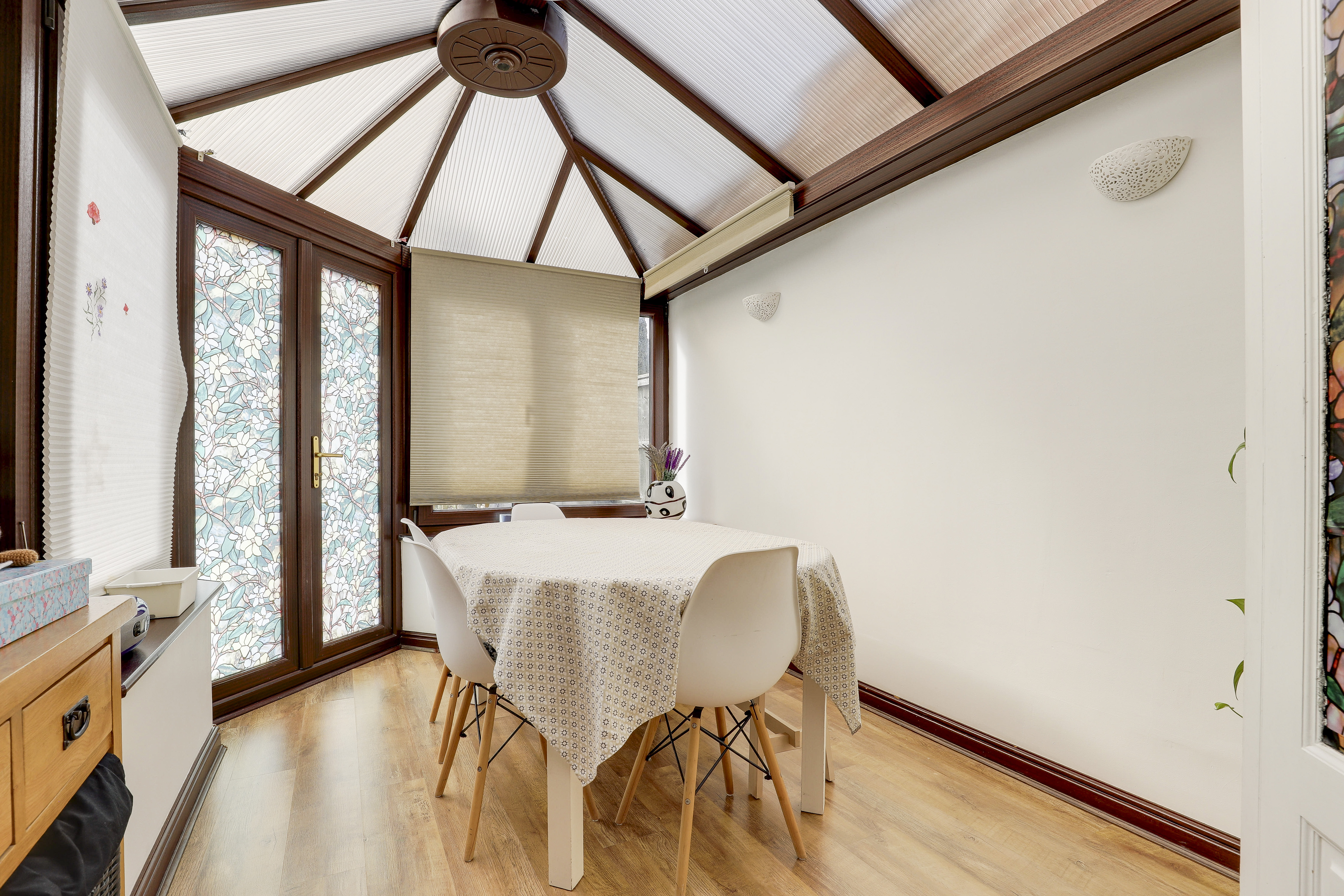 The conservatory has wood-effect flooring, wooden framed UPVC double glazed windows, and French doors opening to the rear garden.