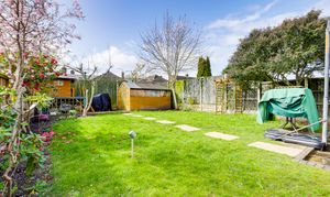 To the rear of the property is a south facing enclosed rear garden with a patio area, a lawn, three sheds, planted borders, and a fence panelled boundary.