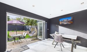 On the ground floor, the welcoming entry leads into a bright living room, while to the rear is a spacious kitchen/diner with direct access to the garden via bifold doors. A convenient WC and built-in storage add to the practicality of the layout. Upstairs, the main bedroom is generously sized, complemented by a second double bedroom which also benefits from built-in storage. The stylish family bathroom featuring a three-piece suite has been finished with modern tiling to a high standard.