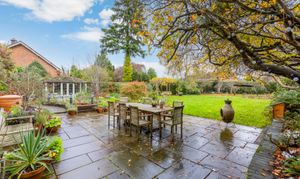 The property sits on a generous 0.4-acre plot. The rear garden is a standout feature—beautifully maintained, with a patio area, well-kept lawn, mature hedges, shrubs, a summer house, and a greenhouse.
