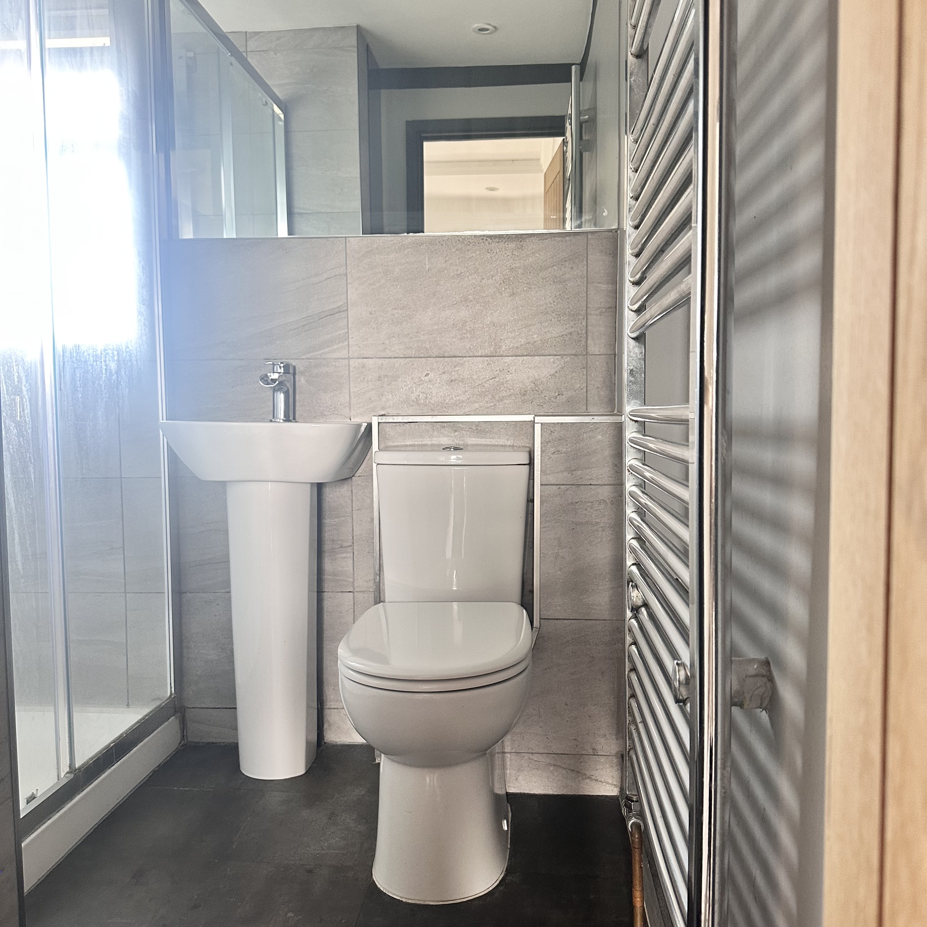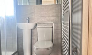 Further highlights include a chic bathroom with modern fixtures, a spacious walk-in shower, and a heated towel rail for added comfort.