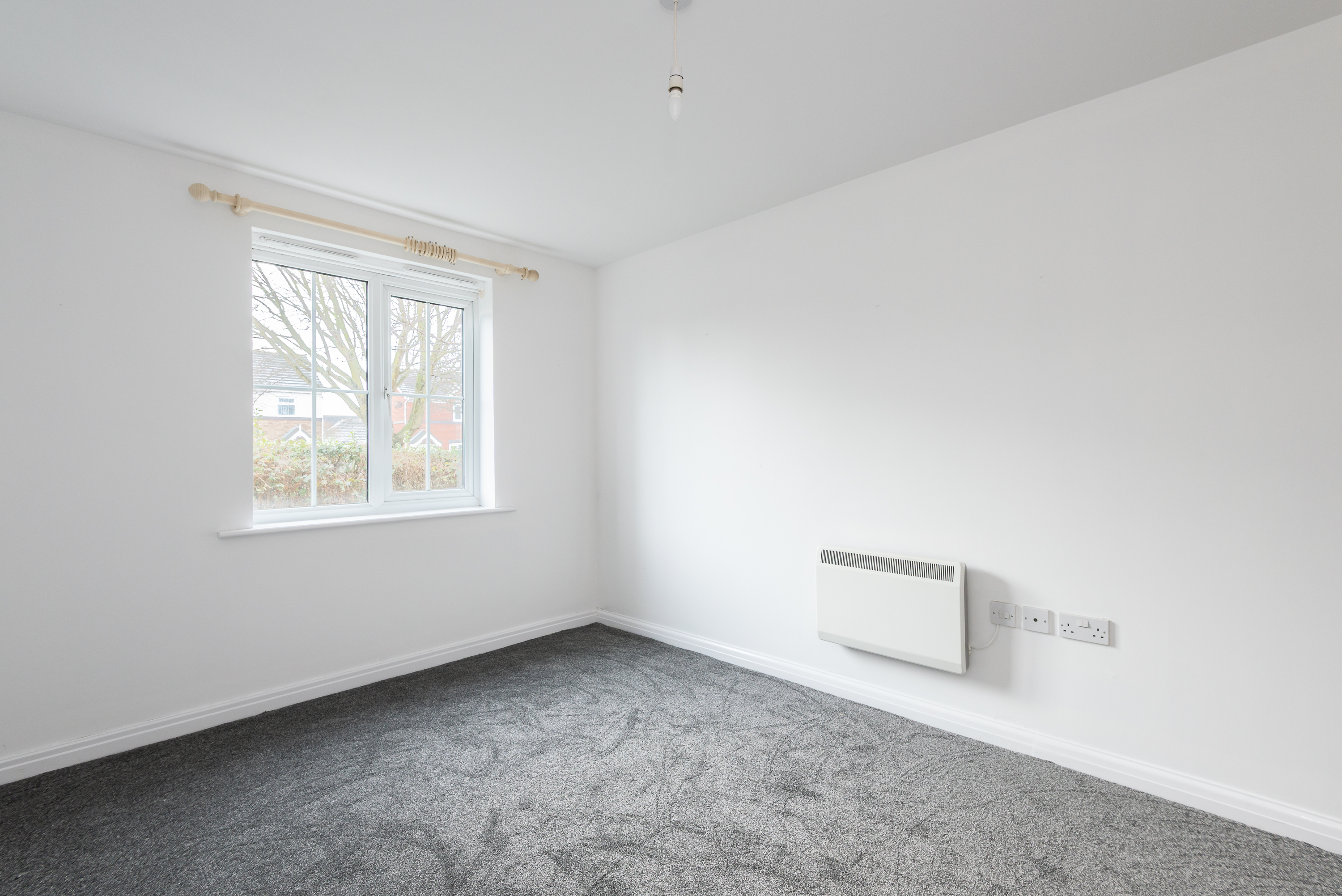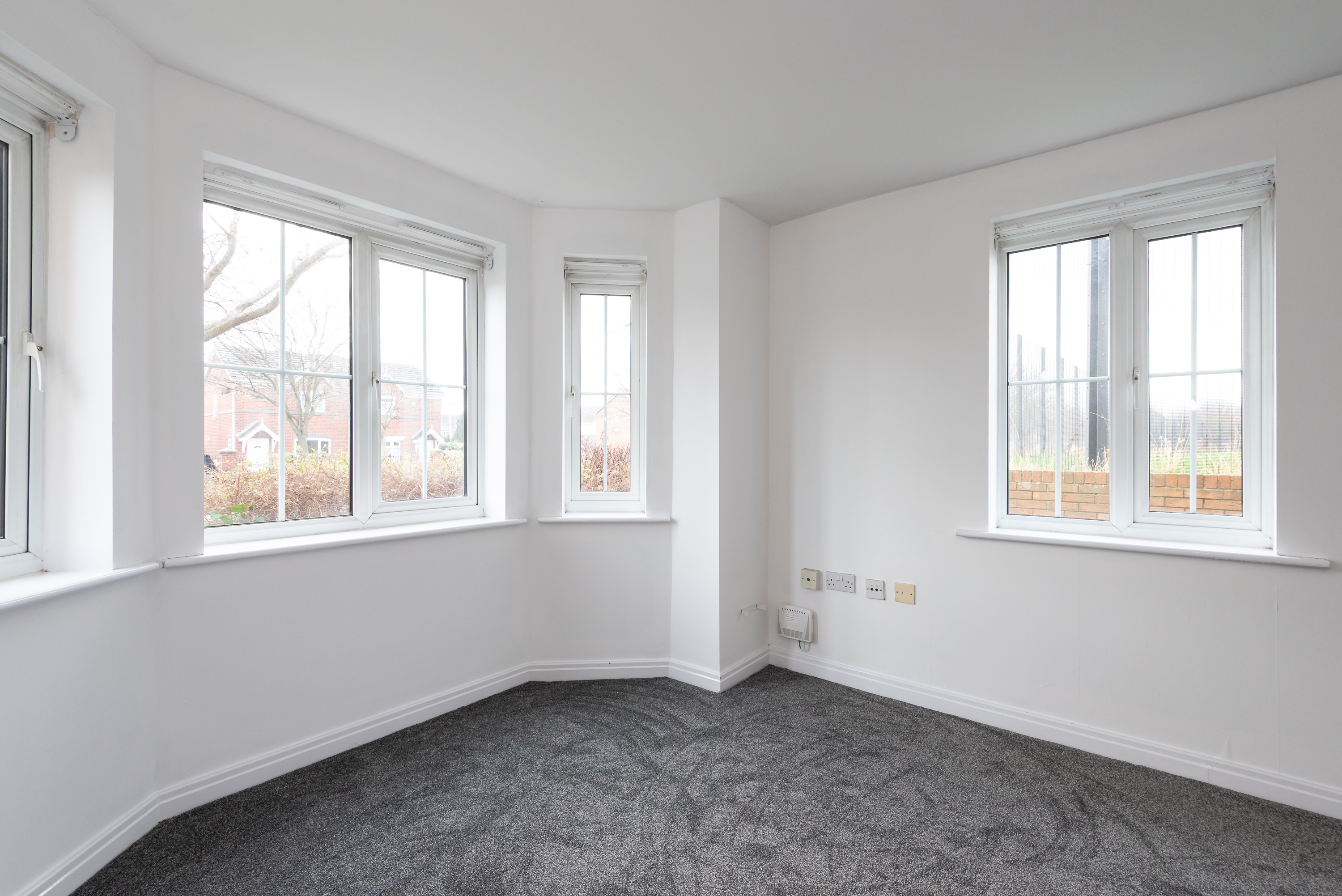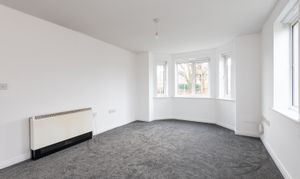 With carpet, multiple windows including a bay window, and radiator.