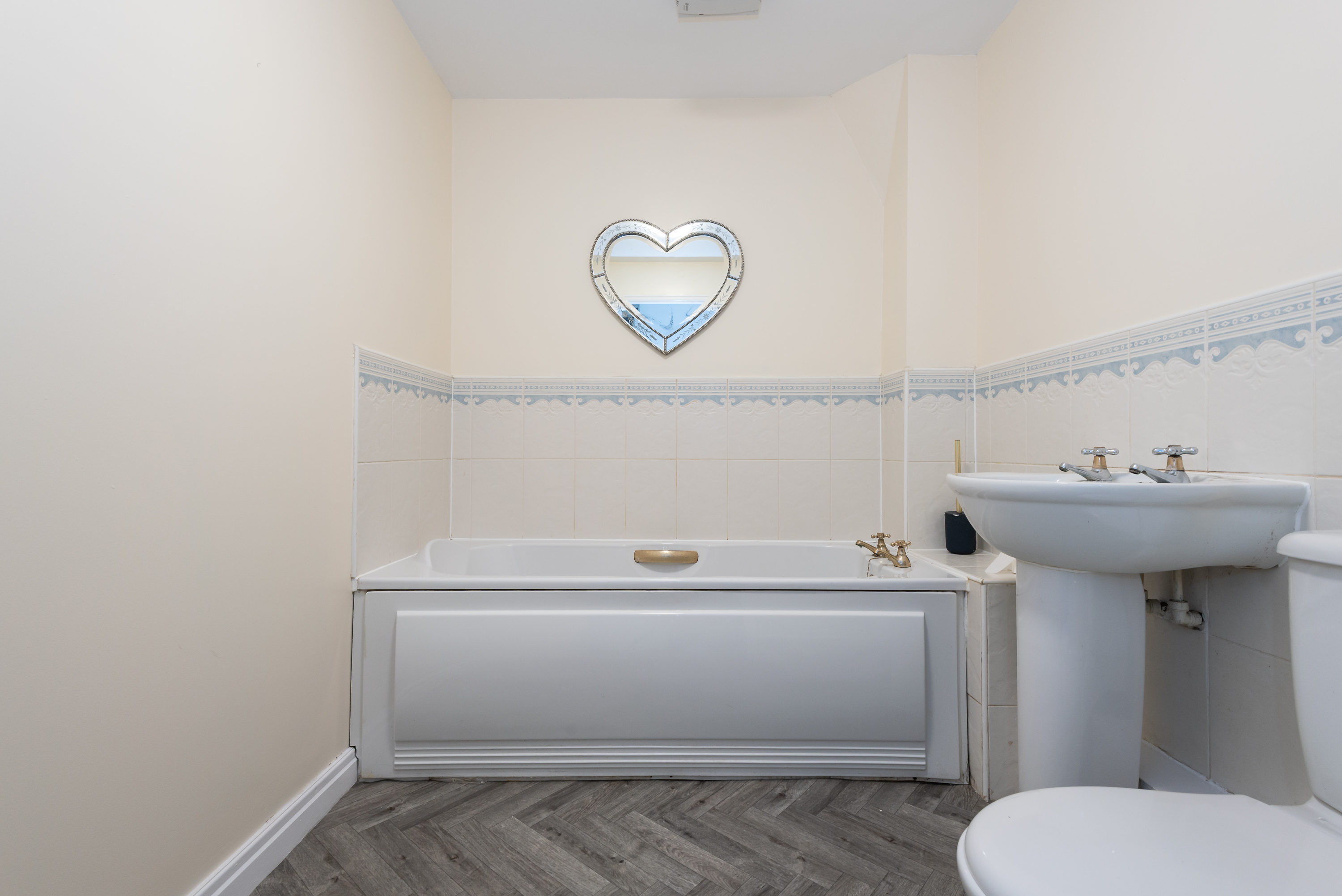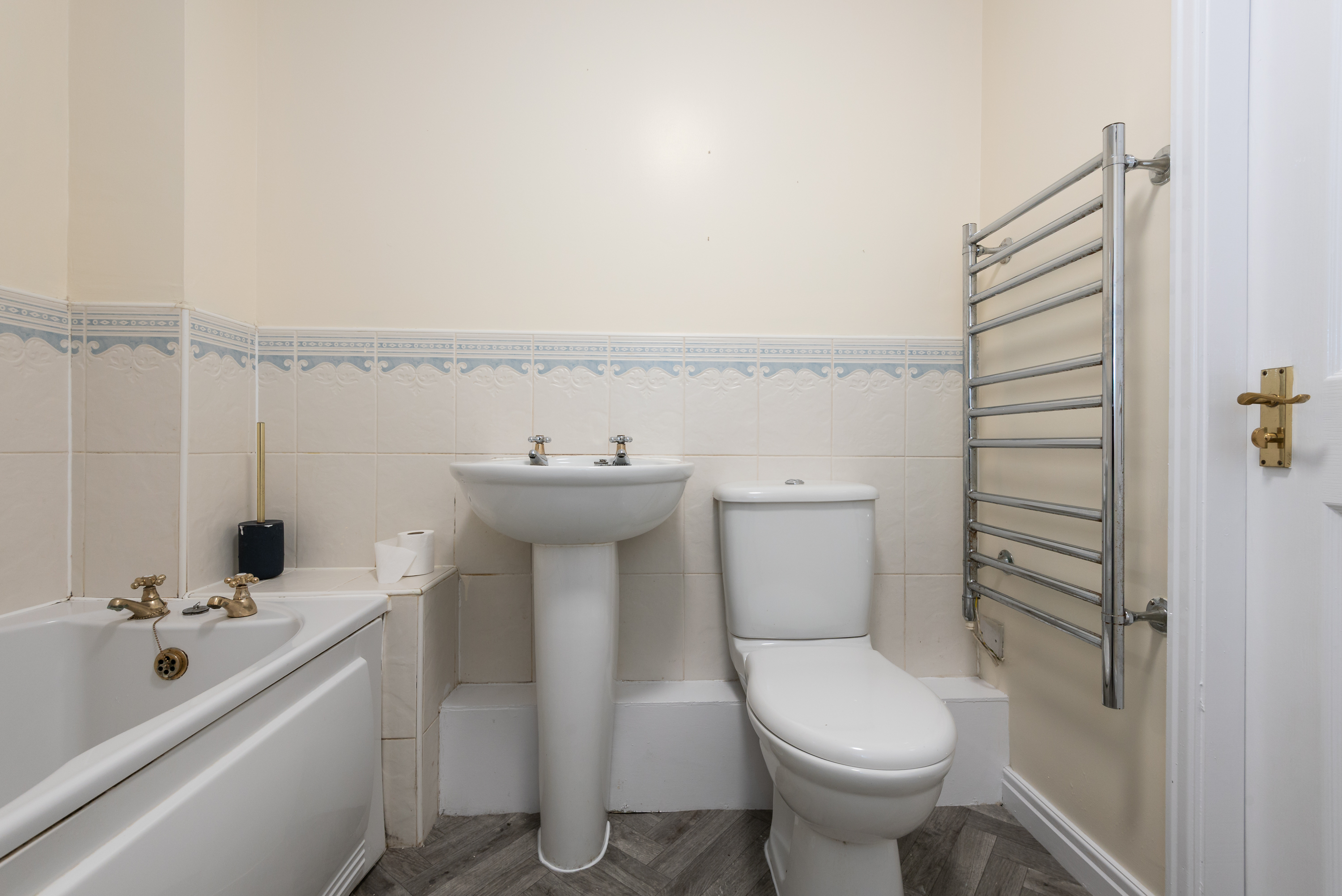 With laminate flooring, toilet, wash basin on pedestal, bath with tiled surround, and towel radiator.