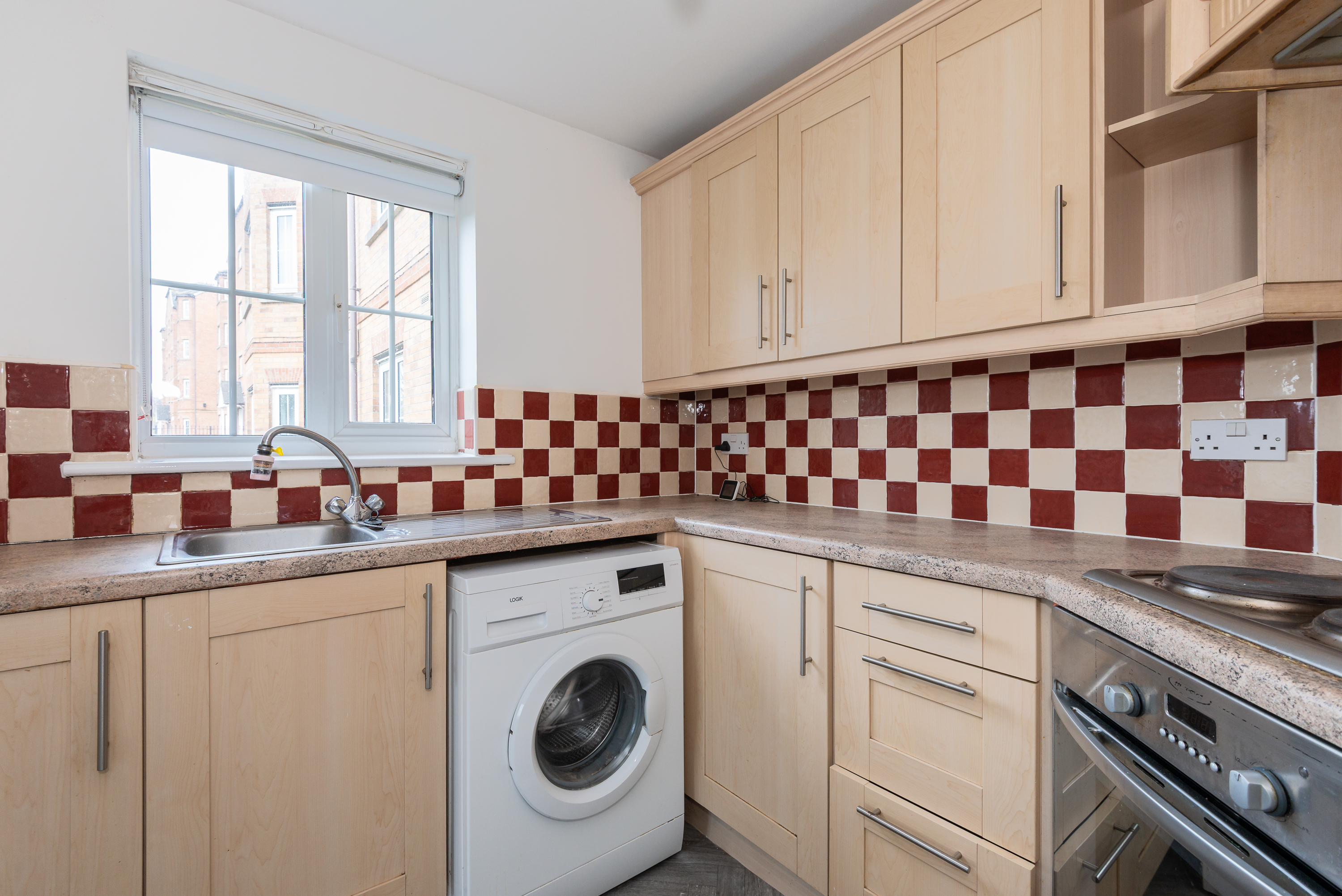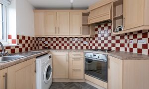 With laminate flooring, kitchen units, integrated oven, hob and extractor, stainless steel sink and tap, tiled splashback, plumbing for washing machine, and window.