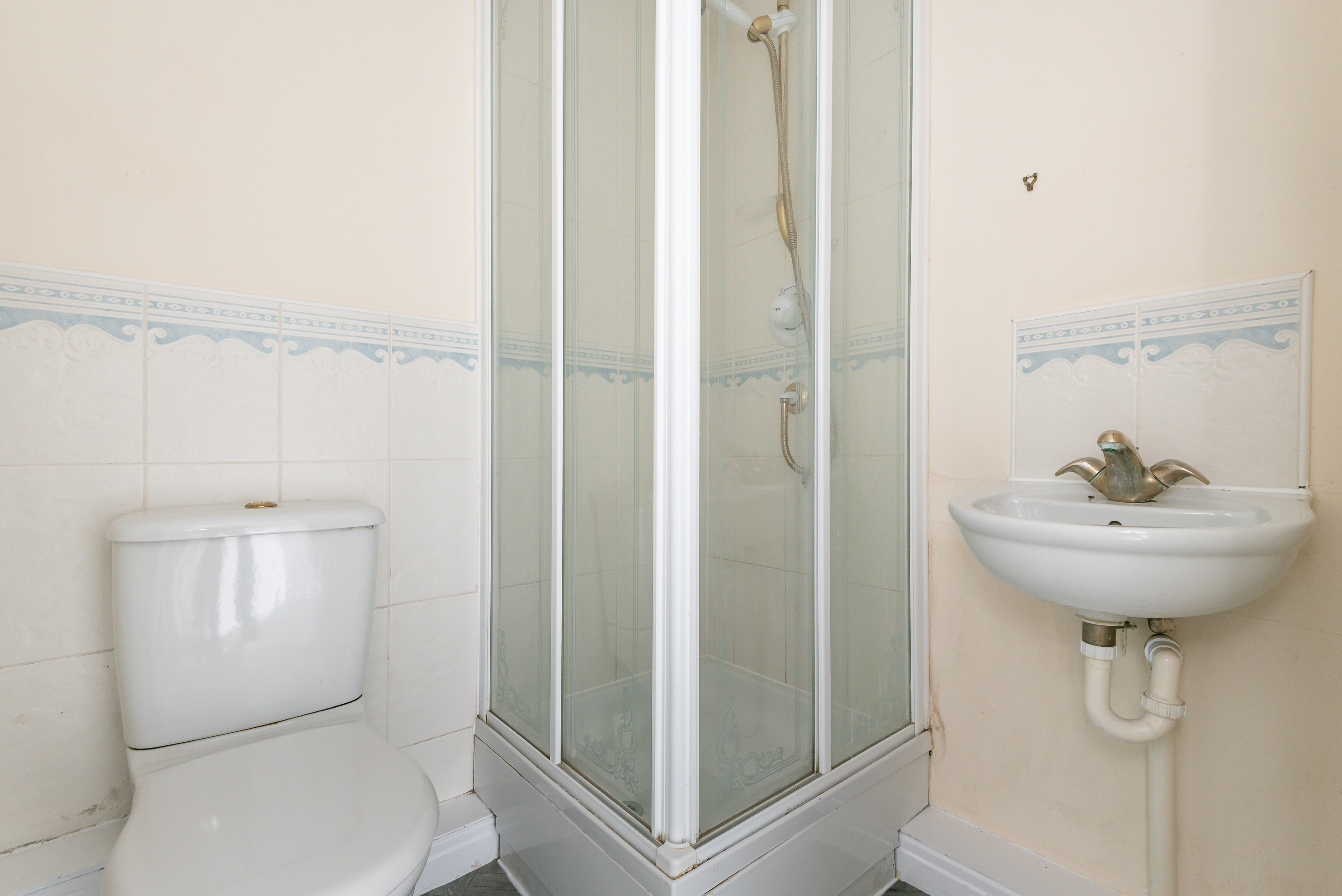 With tiled floor, toilet, shower cubicle, wash basin, partly tiled surround, and radiator.