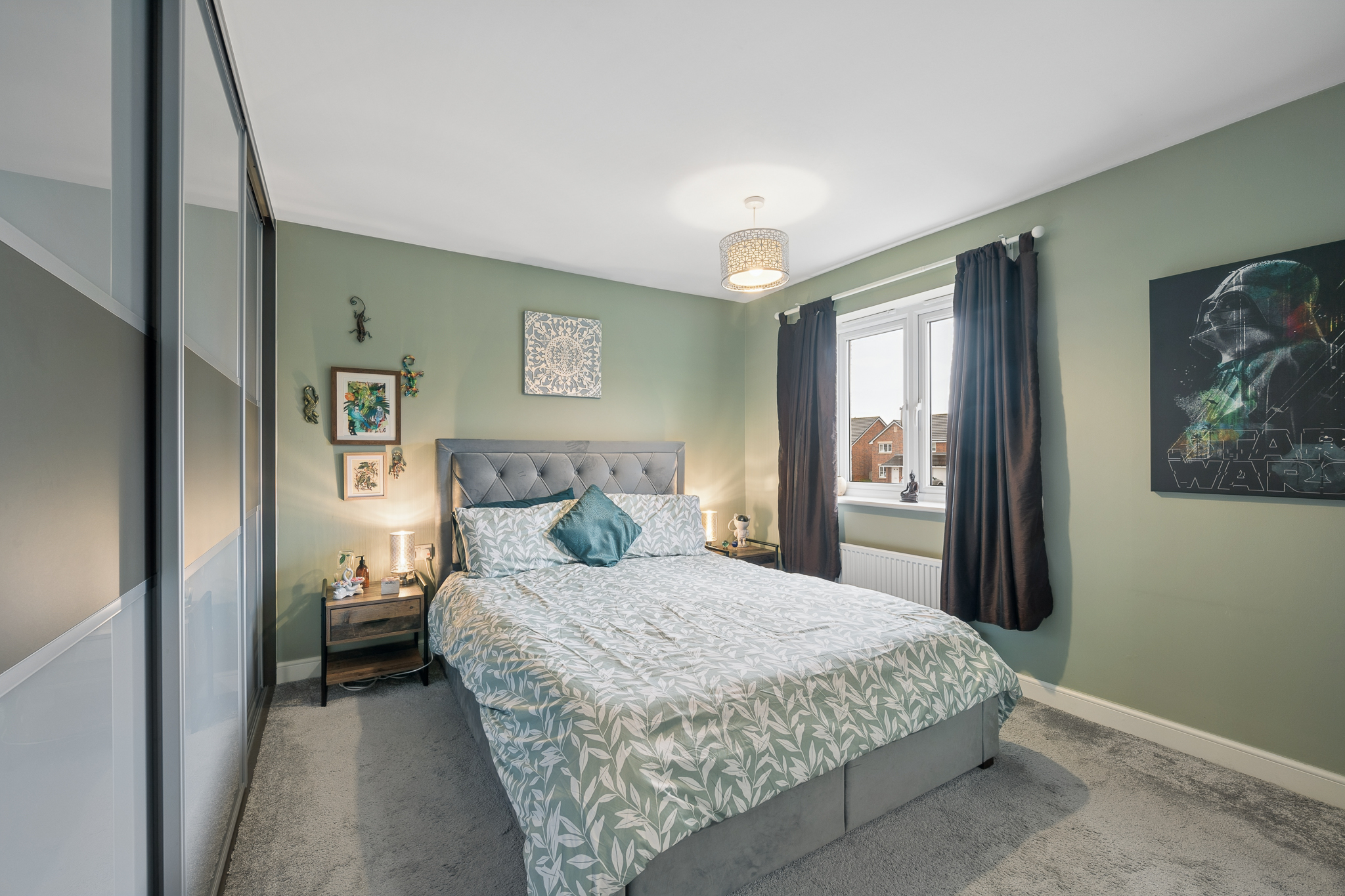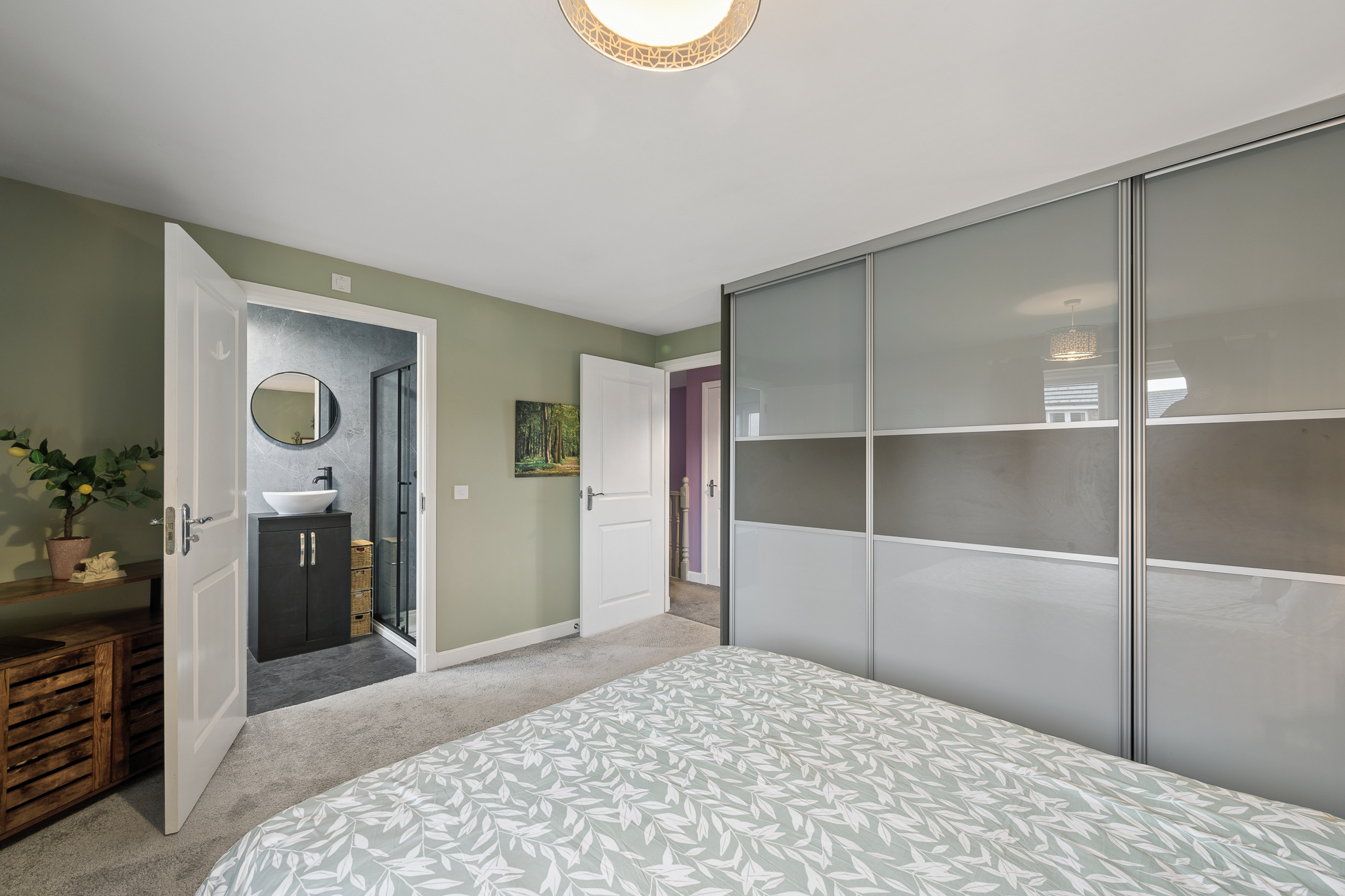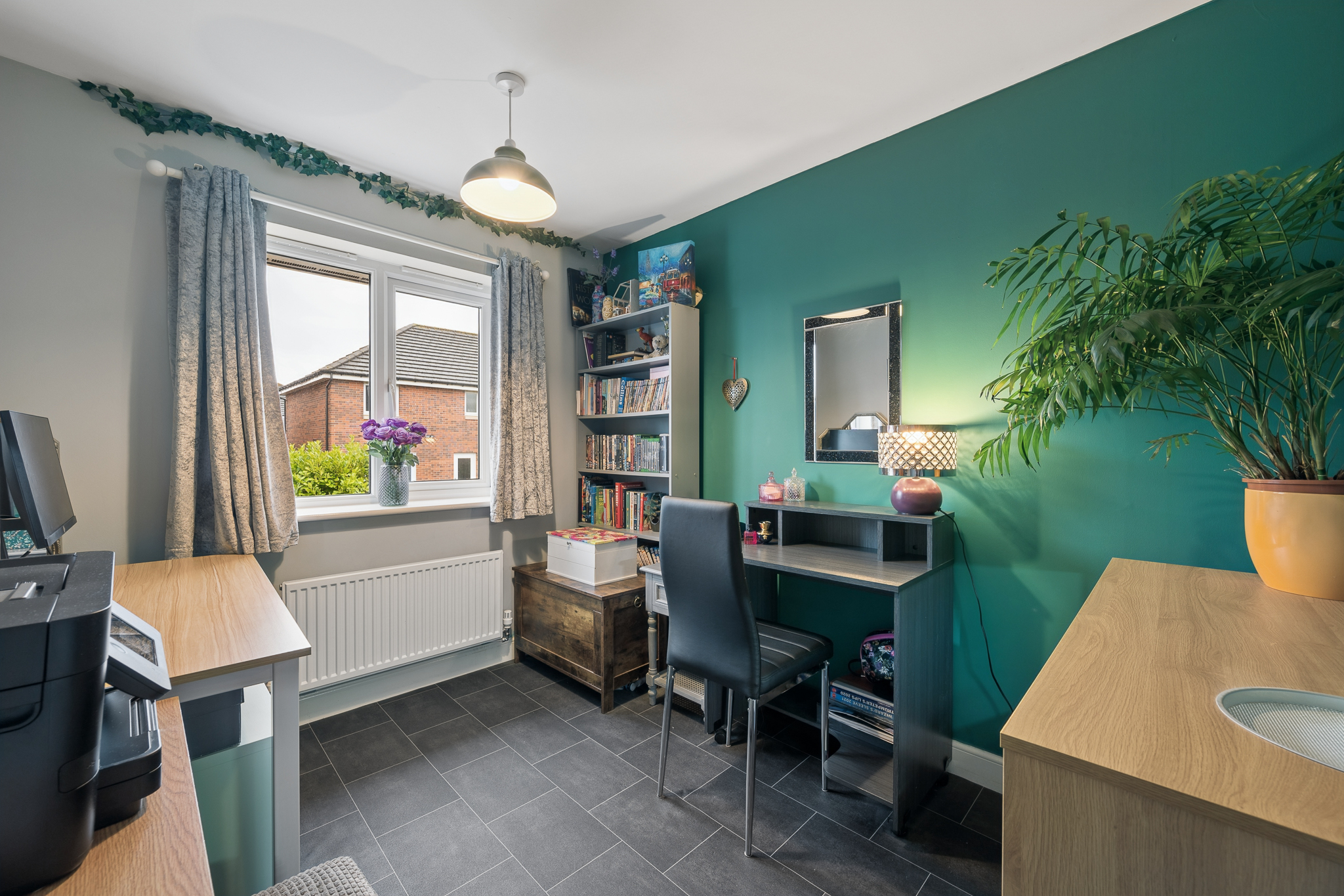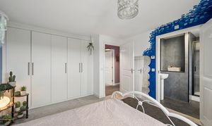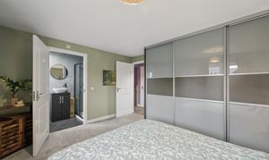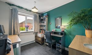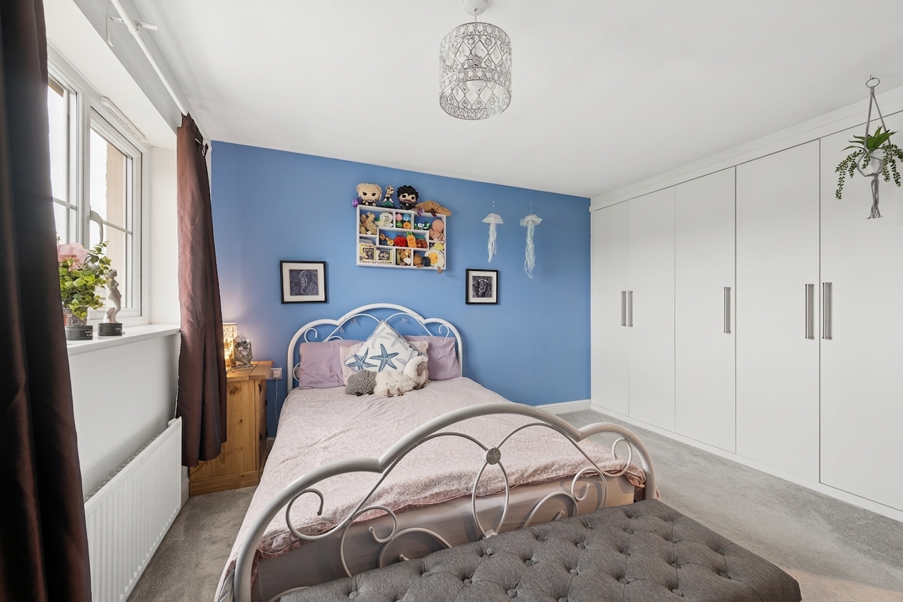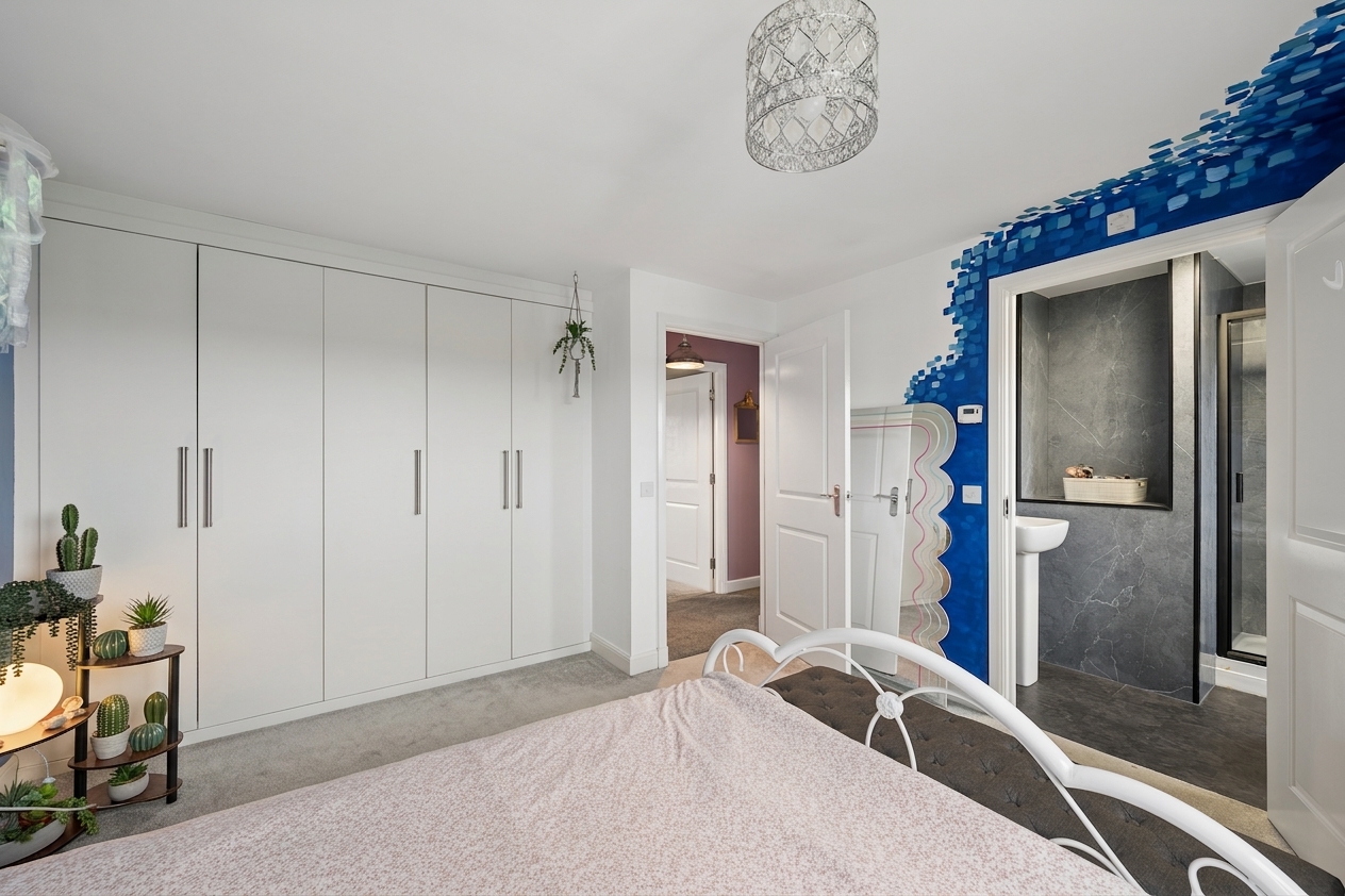 Upstairs, the property offers five well proportioned bedrooms. The principal bedroom is positioned to the rear of the home and comfortably accommodates a super king size bed with bedside cabinets. This room benefits from fitted wardrobes and a private ensuite shower room finished with wet wall tiling. Bedroom two, located to the front of the property, also benefits from fitted wardrobes and its own ensuite shower room, providing excellent flexibility for family living. Bedrooms three and four are generous double rooms with space for beds, bedside cabinets and wardrobes. Bedroom five is another versatile room, currently used as a home office but easily capable of accommodating a double bed if required.