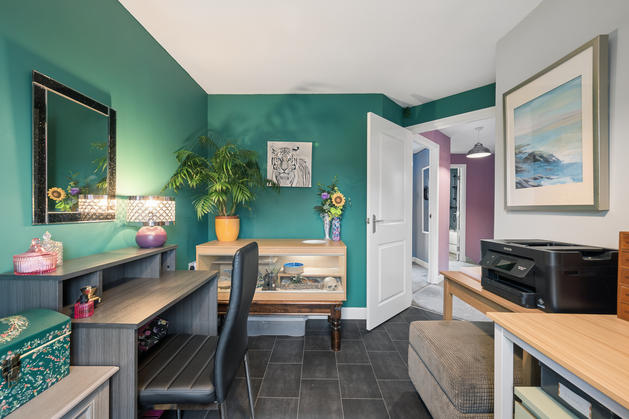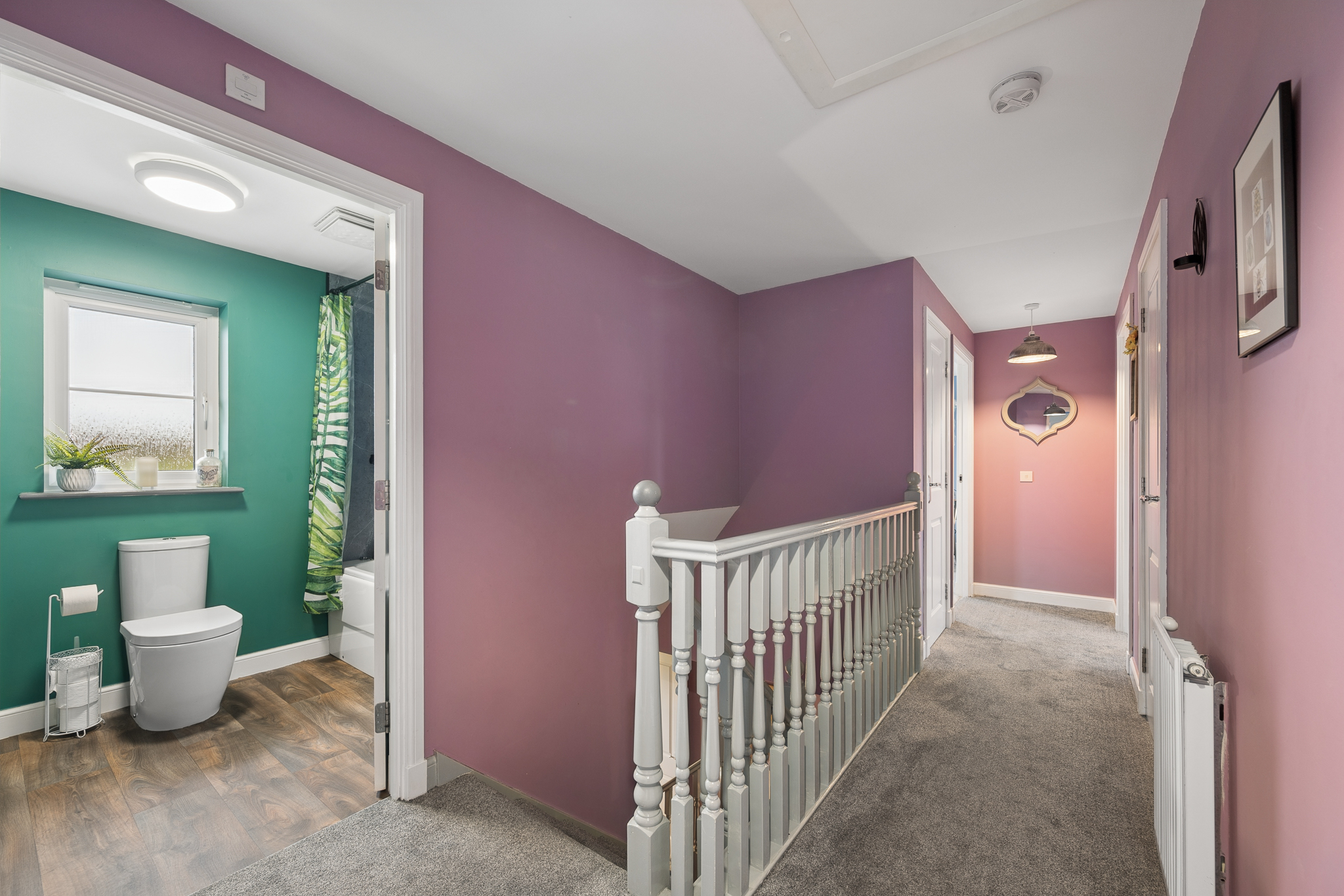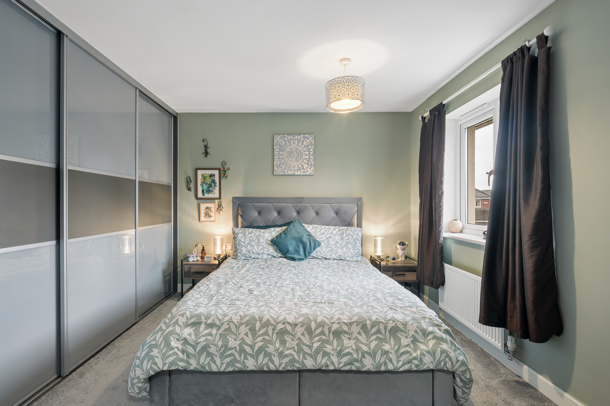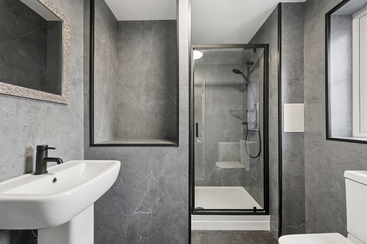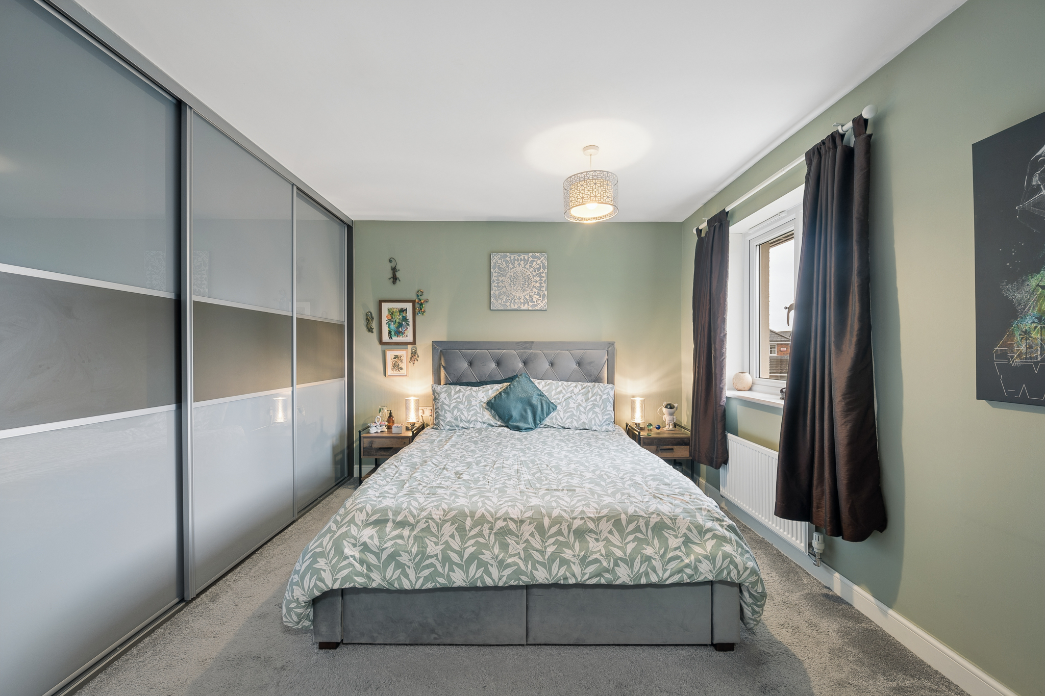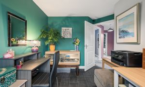 Upstairs, the property offers five well proportioned bedrooms. The principal bedroom is positioned to the rear of the home and comfortably accommodates a super king size bed with bedside cabinets. This room benefits from fitted wardrobes and a private ensuite shower room finished with wet wall tiling. Bedroom two, located to the front of the property, also benefits from fitted wardrobes and its own ensuite shower room, providing excellent flexibility for family living. Bedrooms three and four are generous double rooms with space for beds, bedside cabinets and wardrobes. Bedroom five is another versatile room, currently used as a home office but easily capable of accommodating a double bed if required.