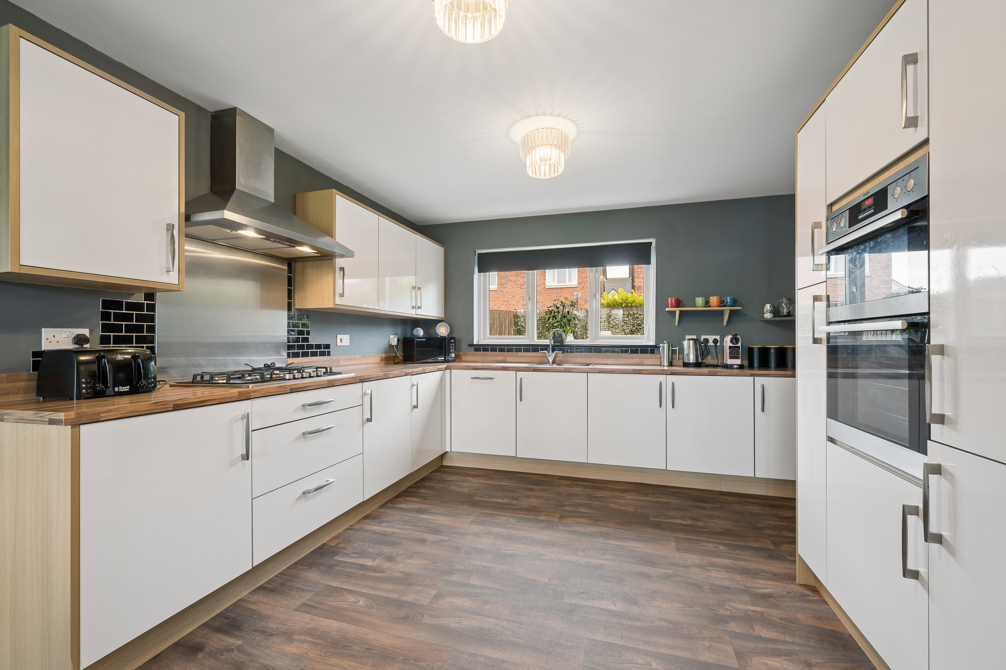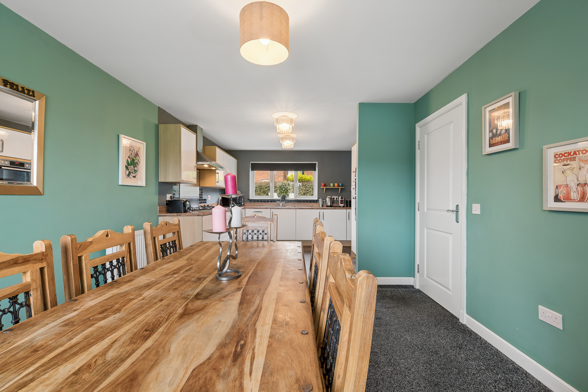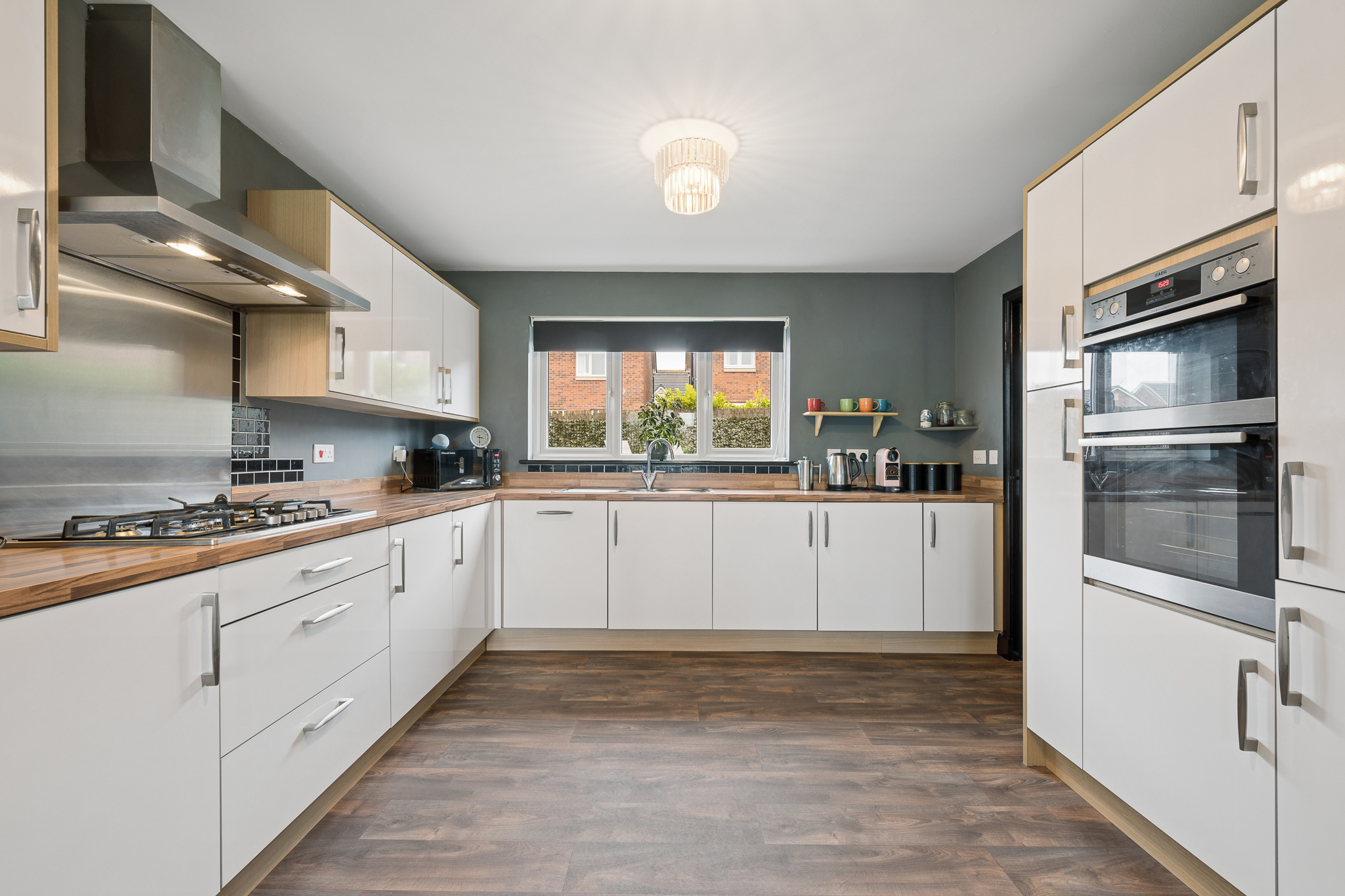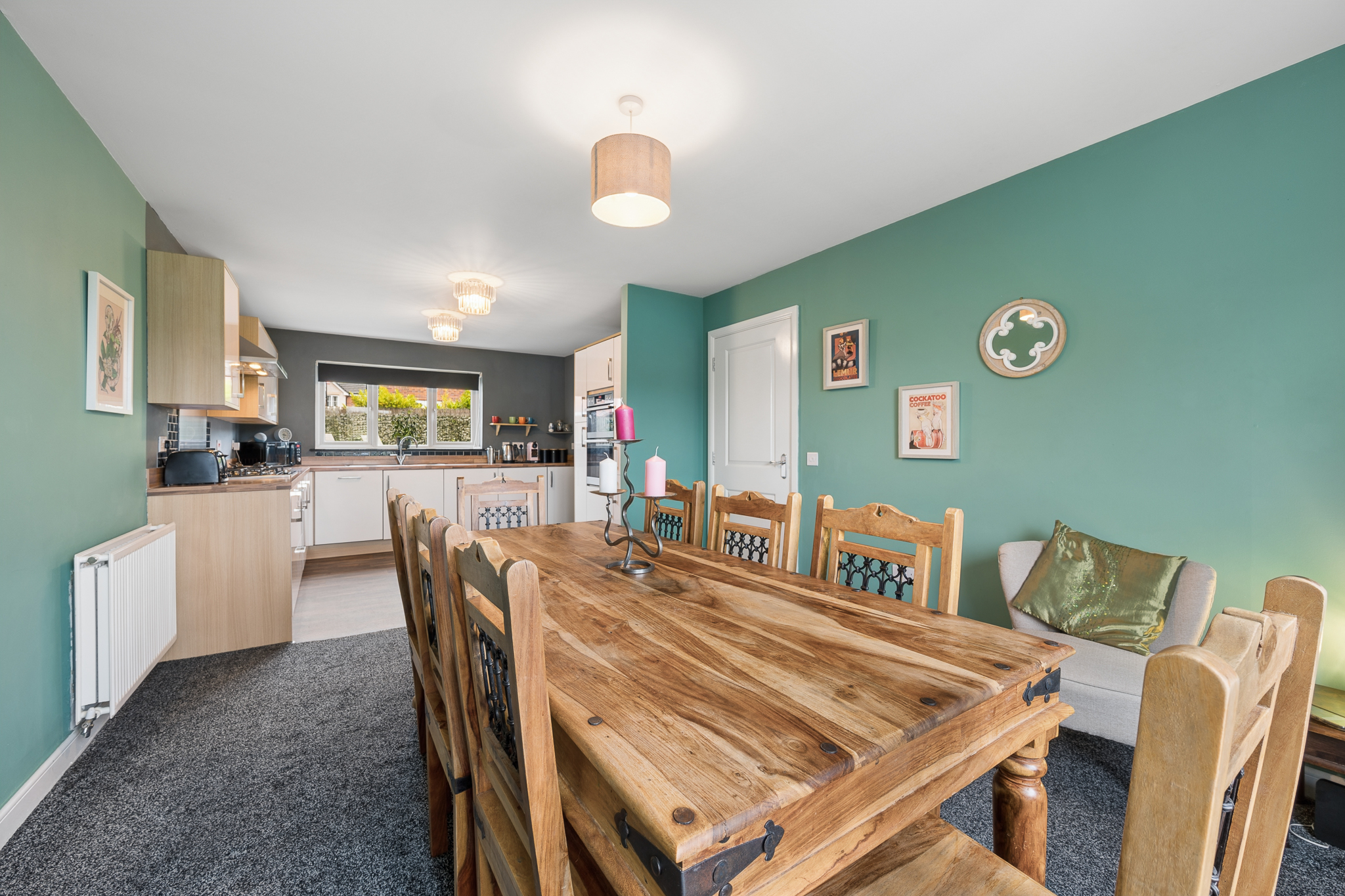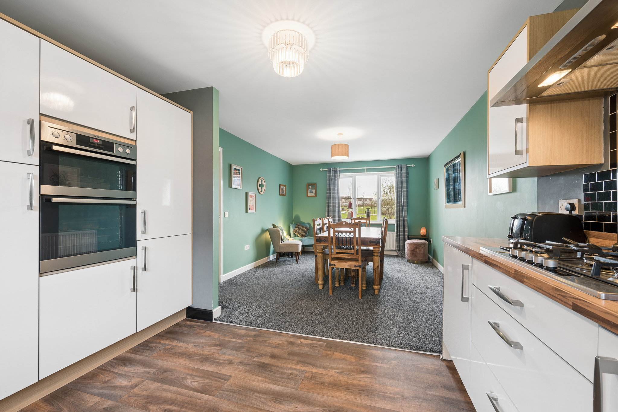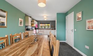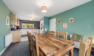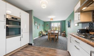 To the left hand side of the hallway is the impressive open plan kitchen and dining area, which spans the full length of the property. The dining area comfortably accommodates a table for six to eight people, making it ideal for hosting and entertaining. The kitchen is fitted with white gloss cabinetry, splashback tiling and a range of integrated appliances including a fridge freezer, oven, grill, dishwasher and a five point gas hob. A large window overlooks the rear garden, while the adjoining utility room provides space for a washing machine and tumble dryer along with direct access to the garden.