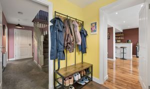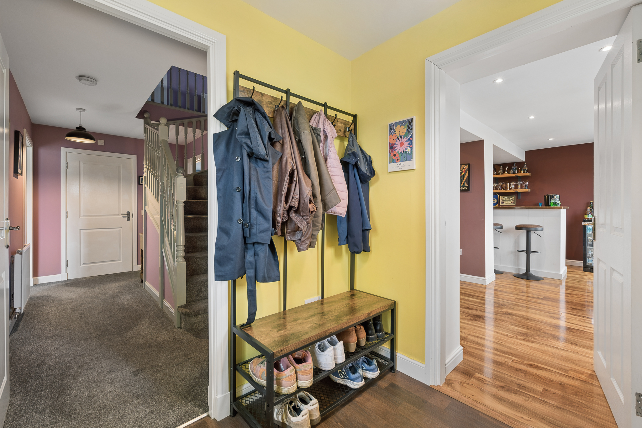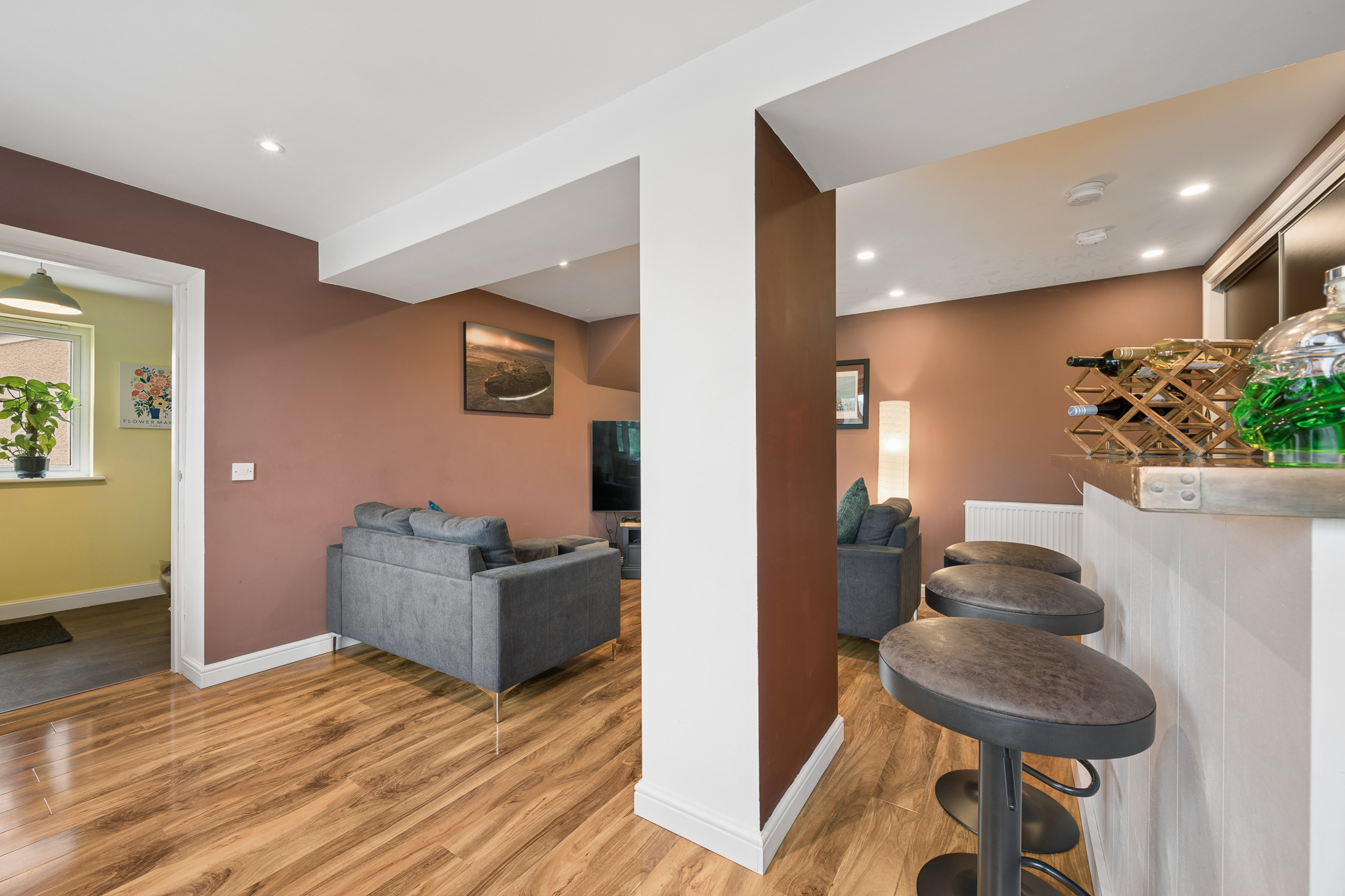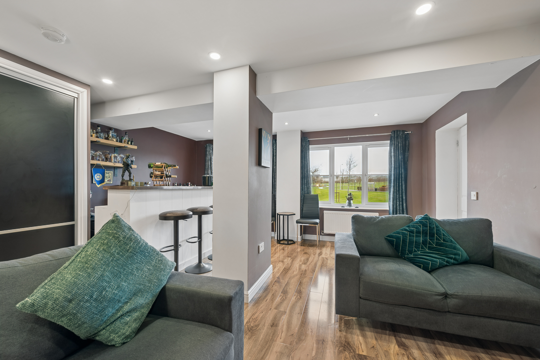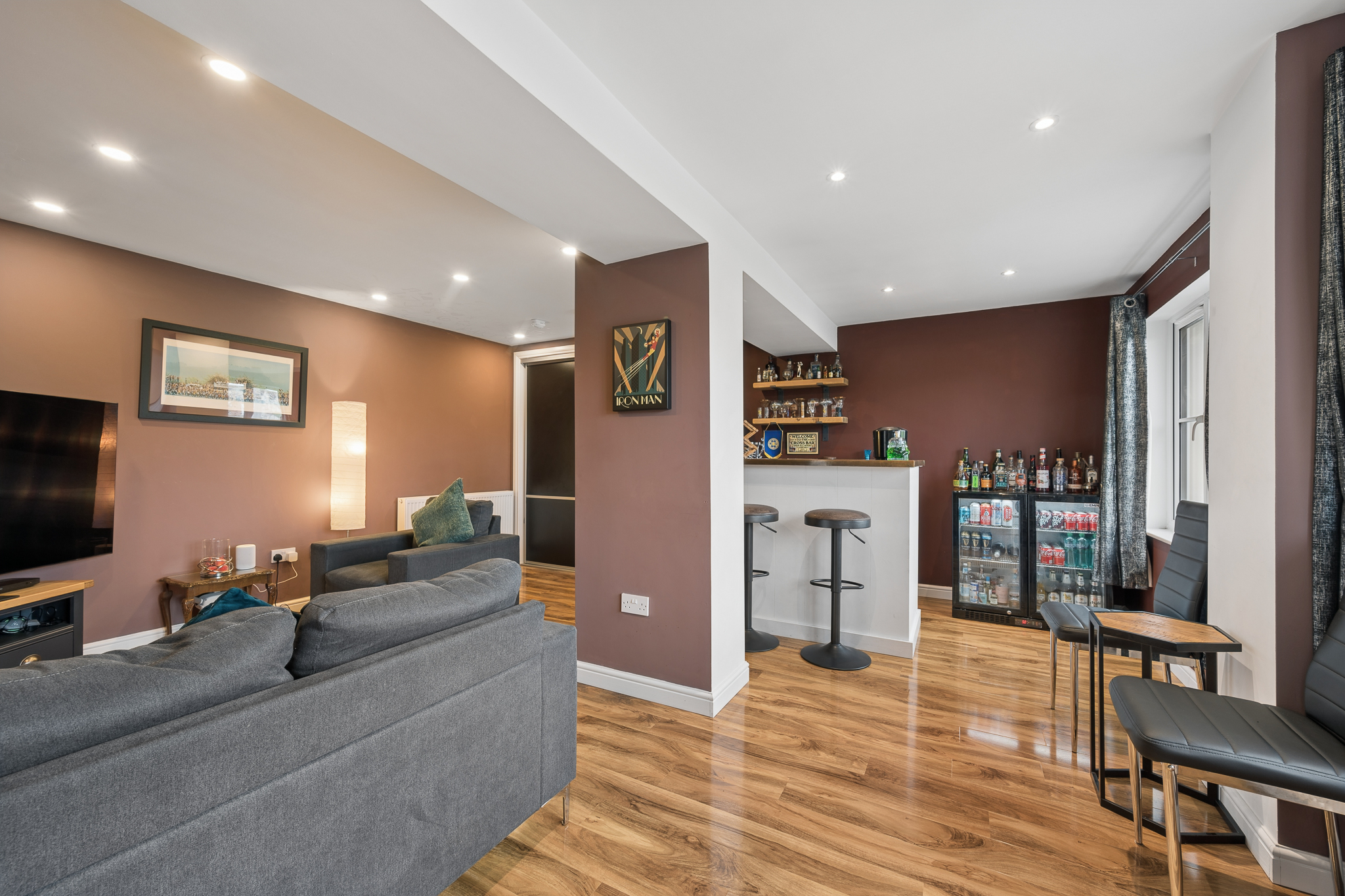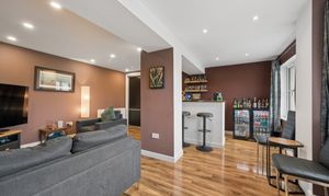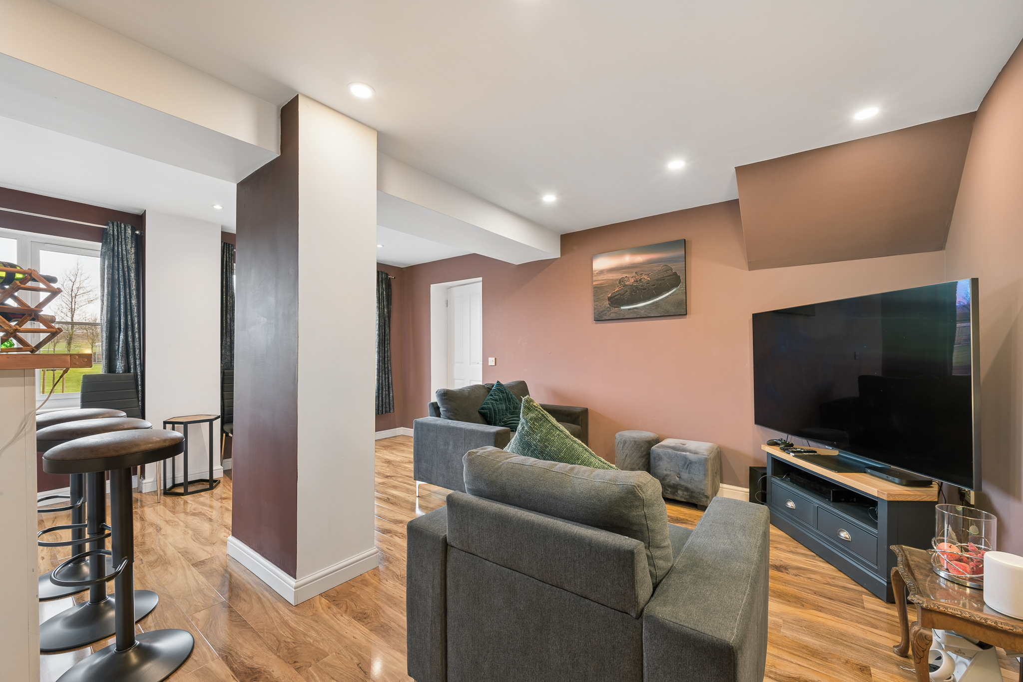 Upon entering, you are welcomed into a bright and spacious hallway with ample room for coats and everyday storage. Positioned to the right hand side is the double garage conversion, currently arranged as a bar area and second lounge. This highly flexible space can be adapted to suit a variety of needs including a family room, home office, gym or additional living accommodation. The room also benefits from useful built in storage.