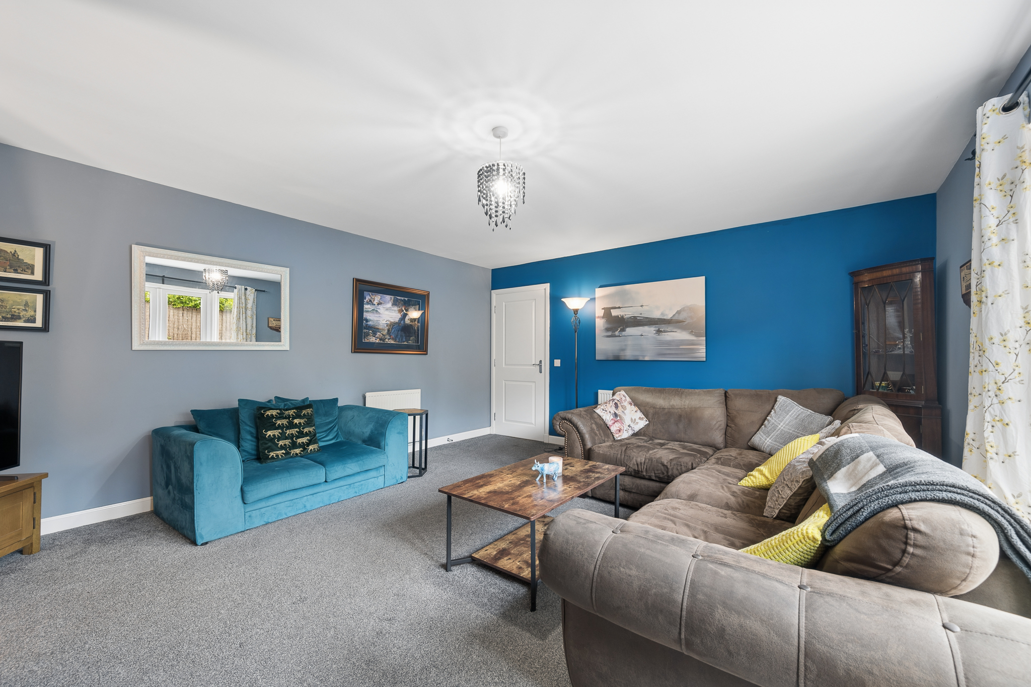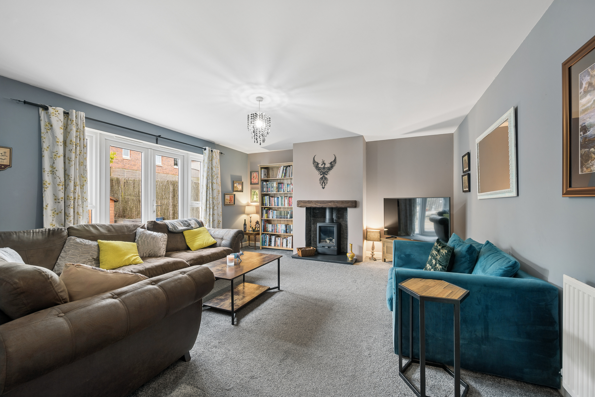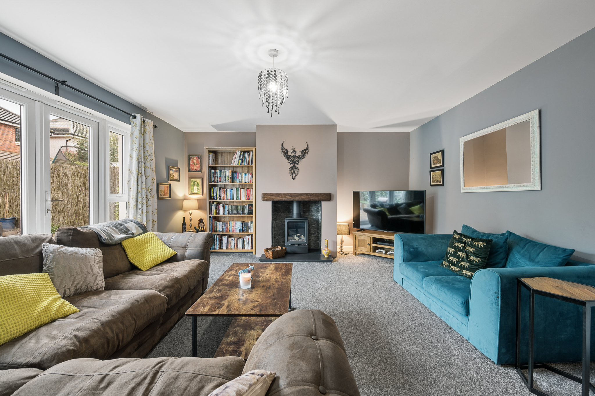 Located at the rear of the property is the main lounge, a generous and comfortable space featuring a gas fireplace and double patio doors opening directly onto the south facing garden. This room easily accommodates two large sofas and a media wall, creating a relaxing environment for everyday living.