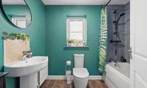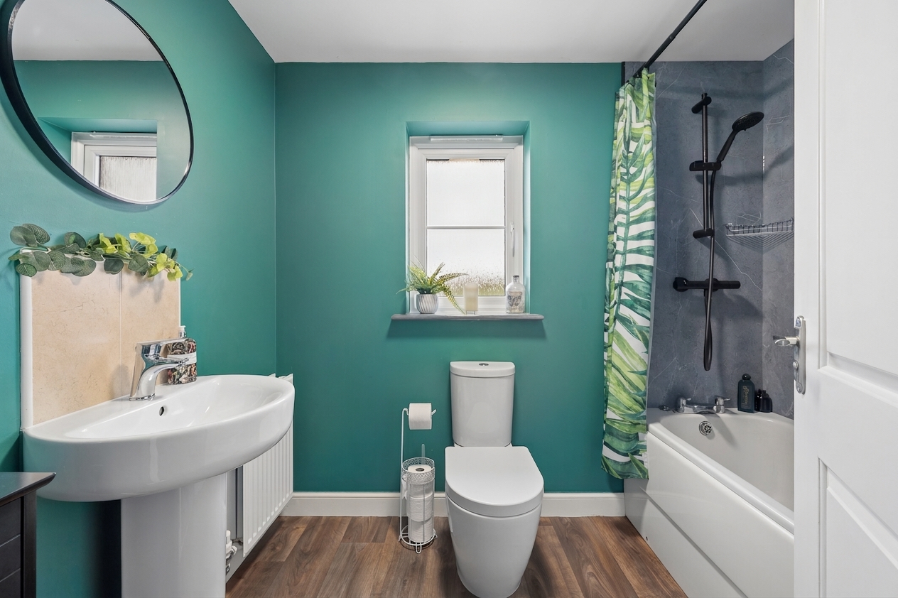 The main family bathroom is centrally located and comprises a three piece suite including a bathtub with overhead shower, finished in neutral tones.