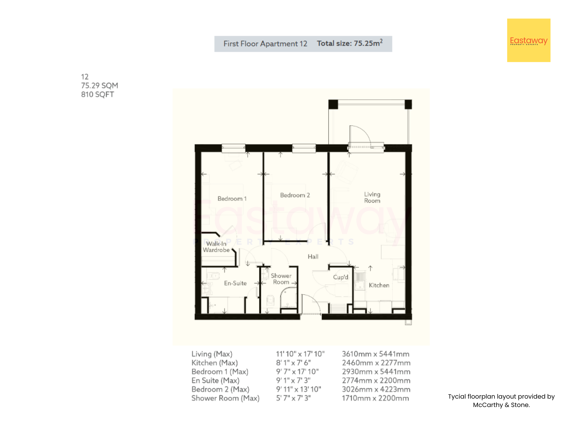 Floorplans and room dimensions are provided for guidance only. Measurements are maximum dimensions and layouts shown are typical designs provided by McCarthy & Stone. Individual apartments may vary.