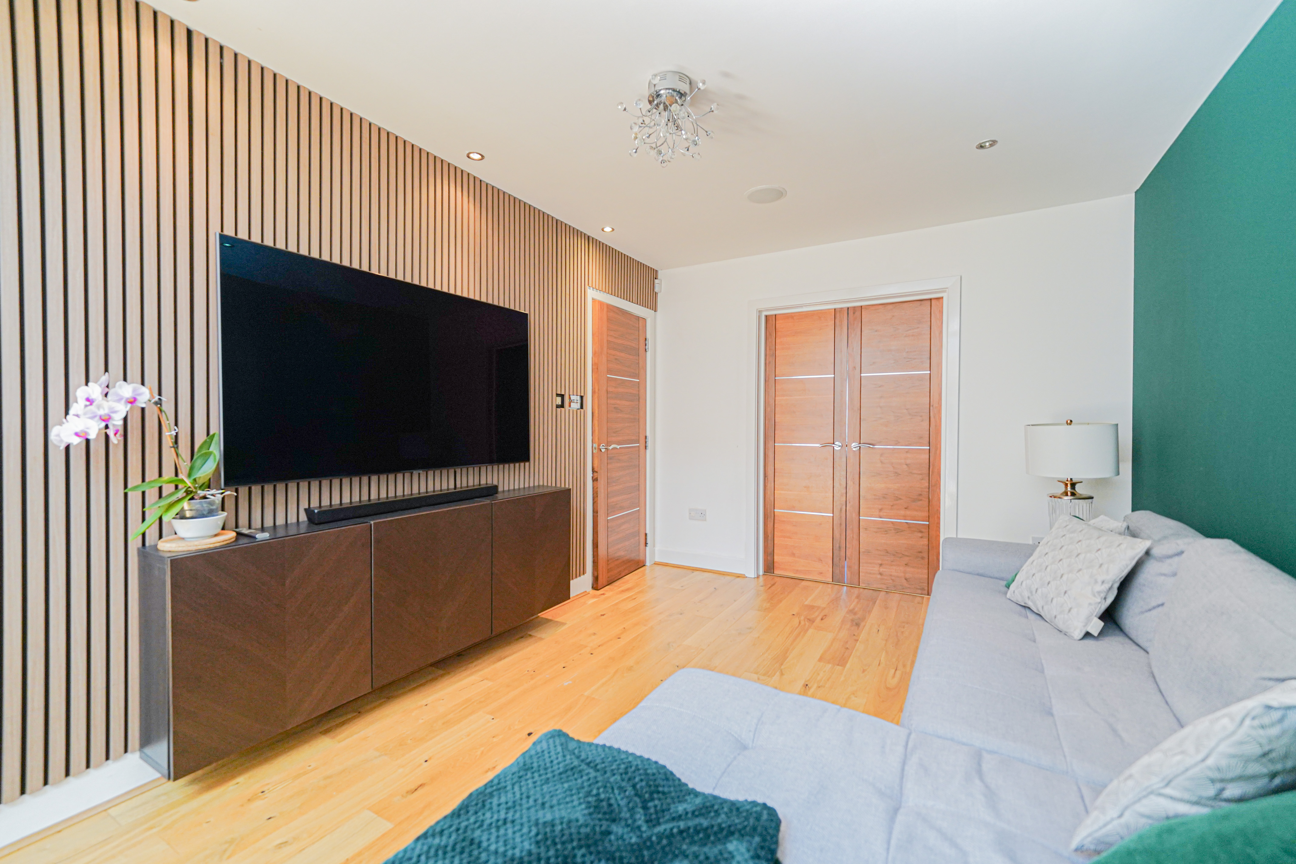 Connected to the kitchen is a spacious dining room that seamlessly flows into an additional family room with a media wall, providing the perfect space for entertaining guests or relaxing with family. To the front of the property, there is a delightful living room that offers a cosy retreat.