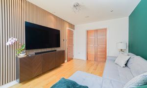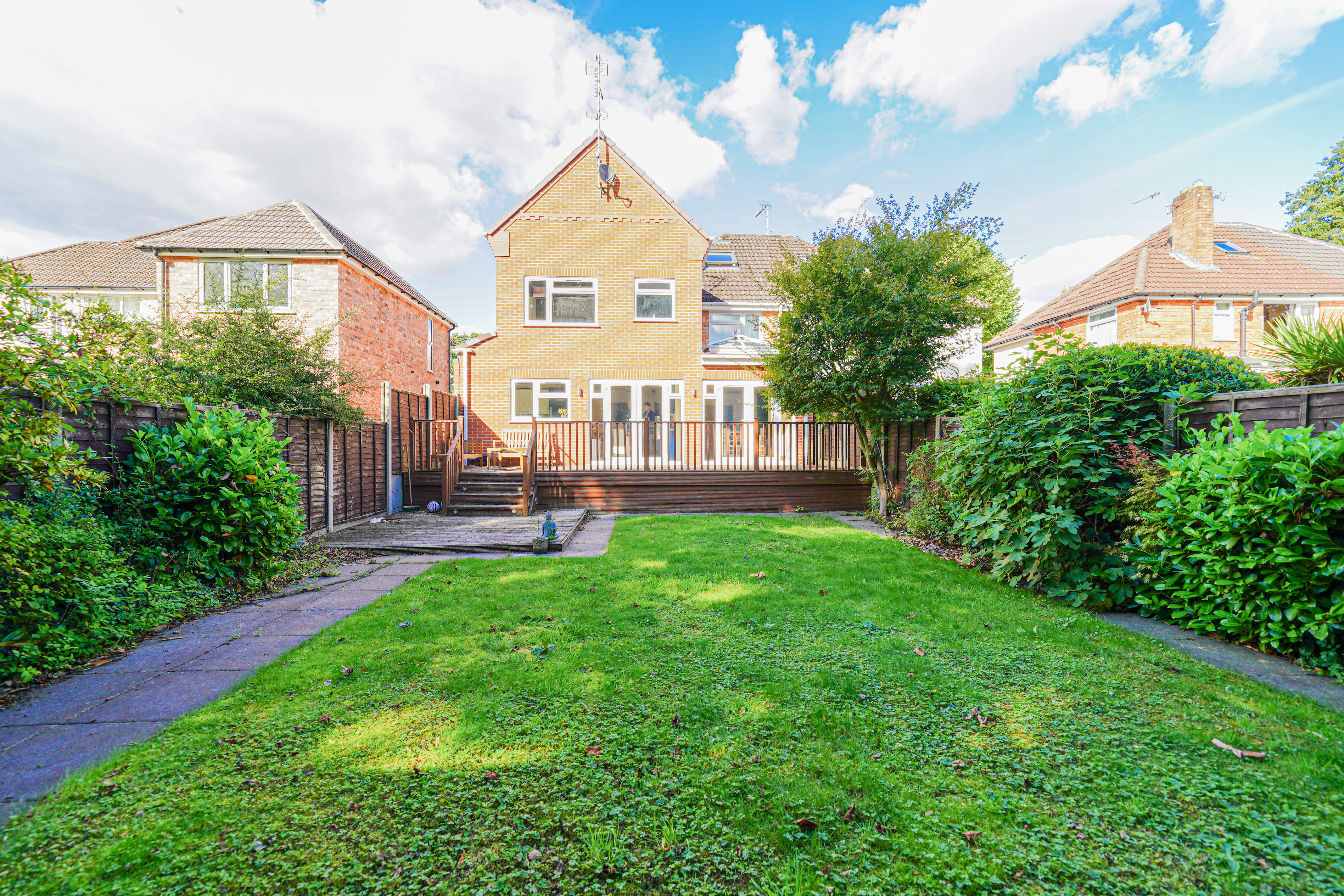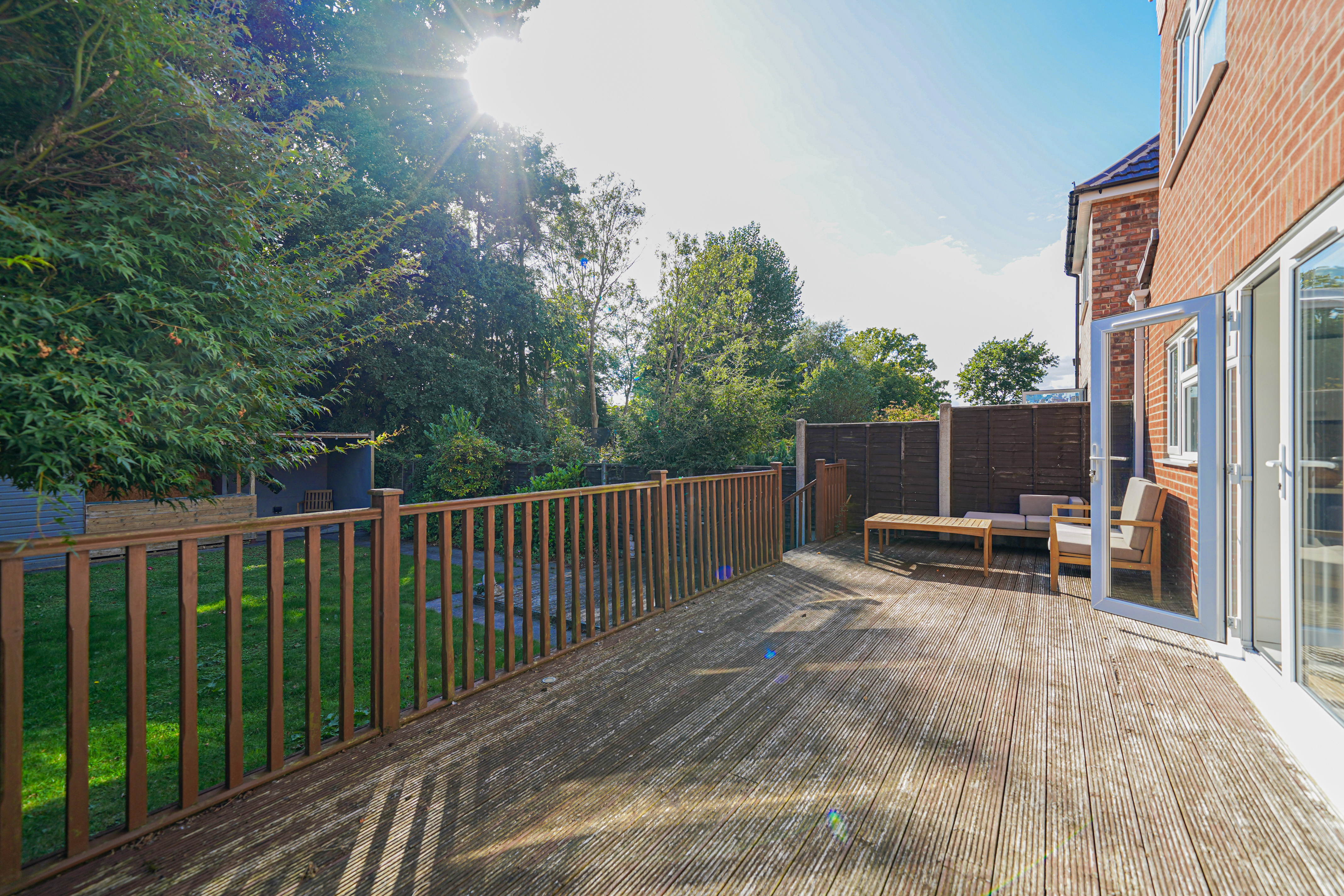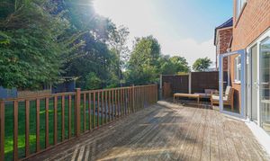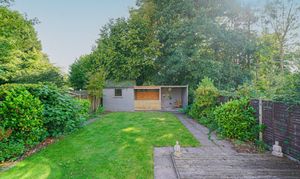 Outside, the garden offers a peaceful retreat with an expansive decked seating area perfect for al fresco dining and entertaining. There is also a large lawn section, along with a shed and bar at the end of the garden, providing additional space for relaxation and recreation.