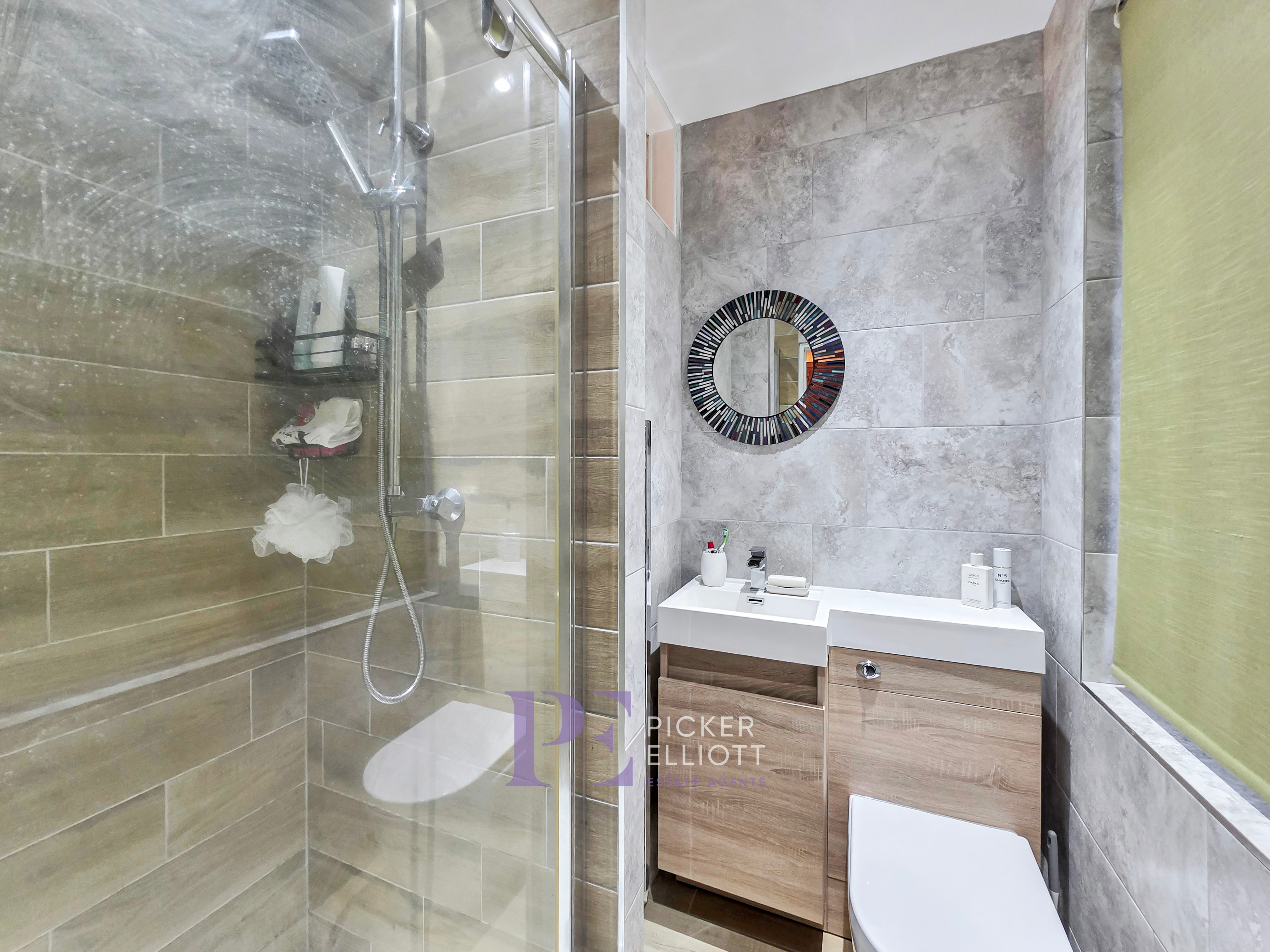 Contemporary en-suite with enclosed low level flush WC, vanity sink unit, closed tiled shower cubicle with rain effect shower head, fully tiled in surrounding four walls, tiled flooring, chrome heated towel rail radiator, inset spotlights, extractor fan, and opaque double glazed window.