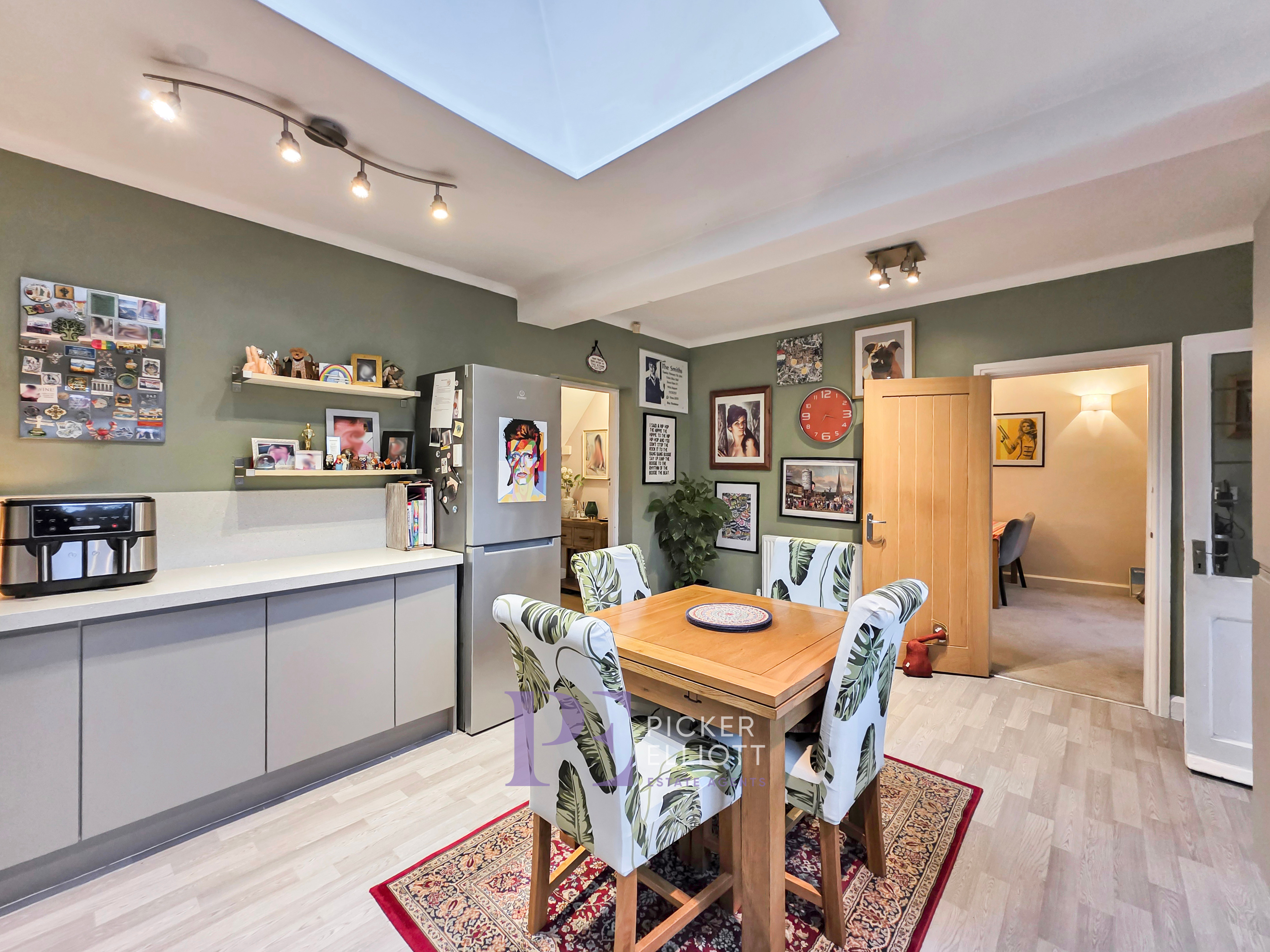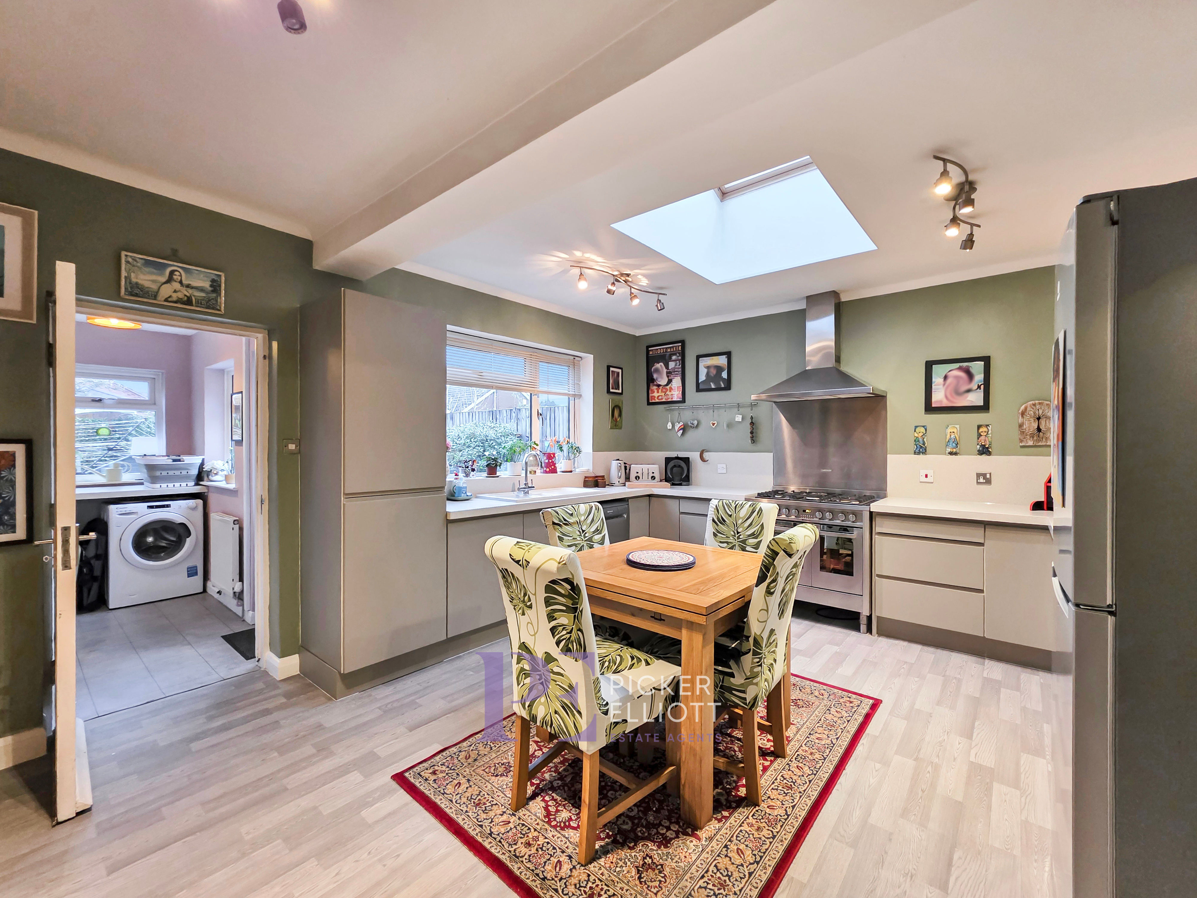 Kitchen with an excellent range of contemporary base units, Square Edge Work top Services, five ring gas range cooker, extractor fan, inset one and a half ceramic sink with mixer tap, space for dishwasher, fridge freezer. Radiator, Skylight window, with an additional double glazed window to rear, door to utility room.