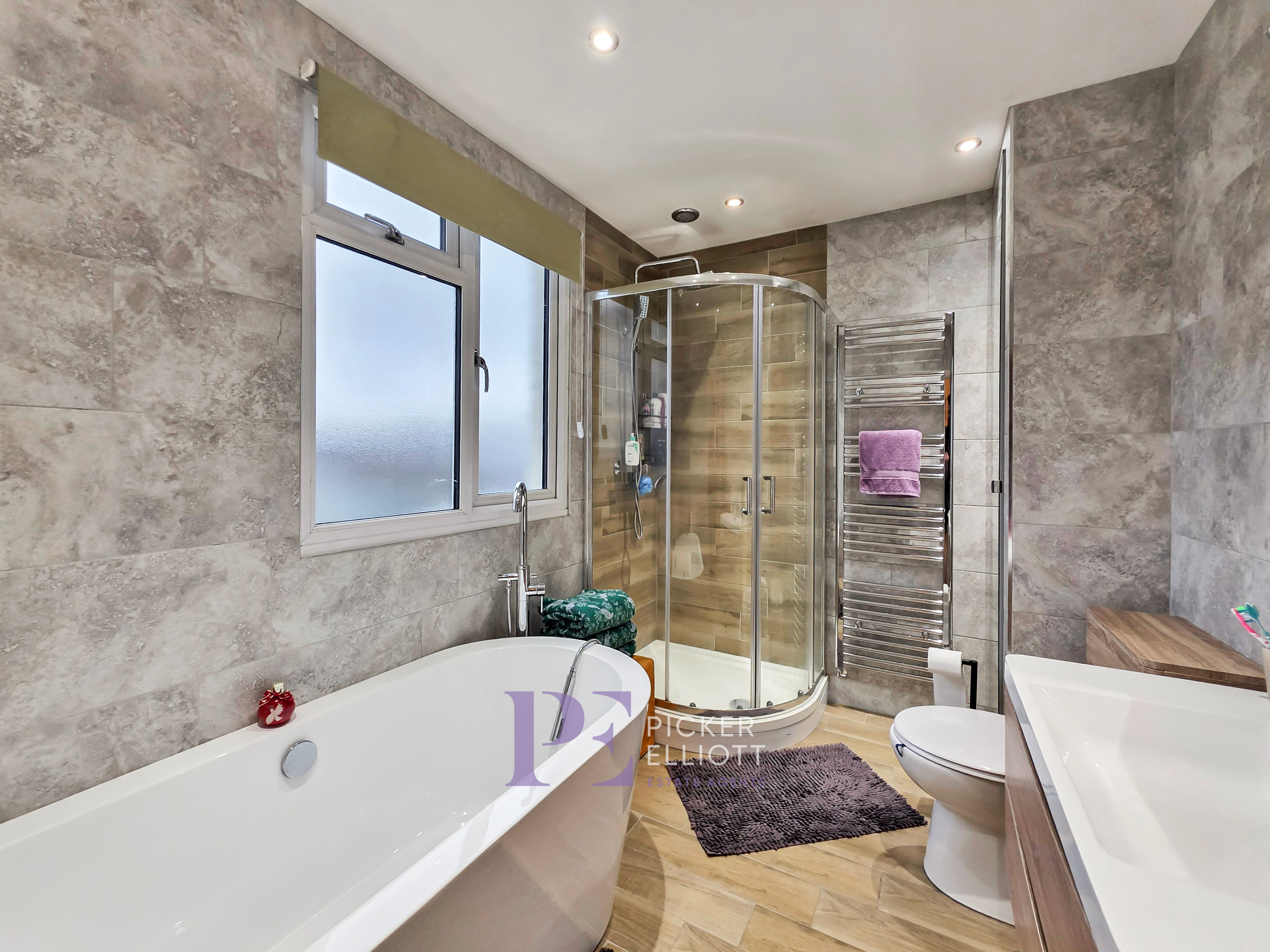 Contemporary four-piece bathroom suite with low level flush to WC, modern freestanding Bath and corner shower cubicle, with a rain effects shower head contemporary vanity sink unit, inset spotlights, radiator, extract fan, a peak double glazed window, tiled flooring, and into spotlights
