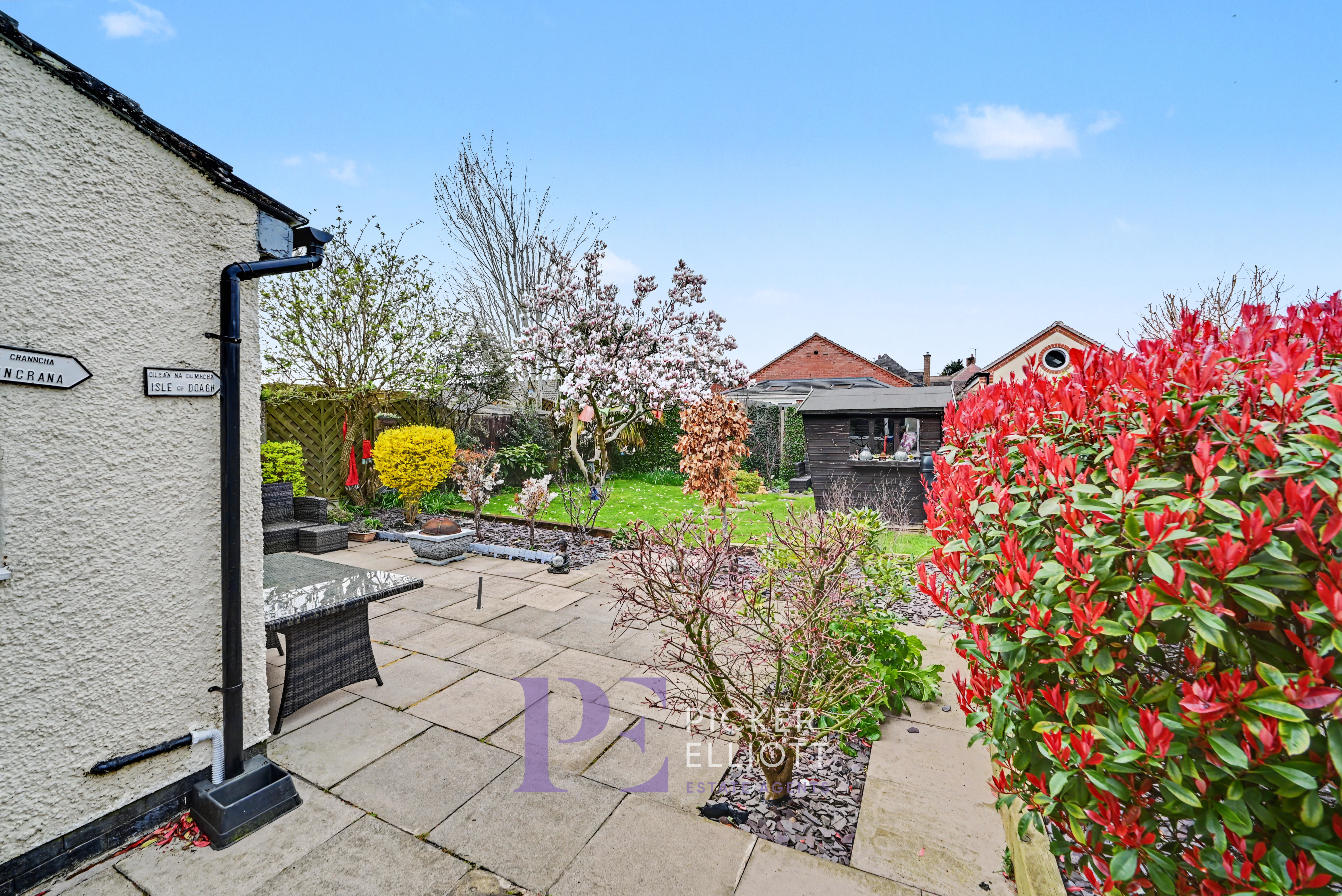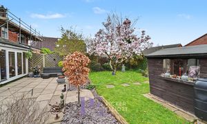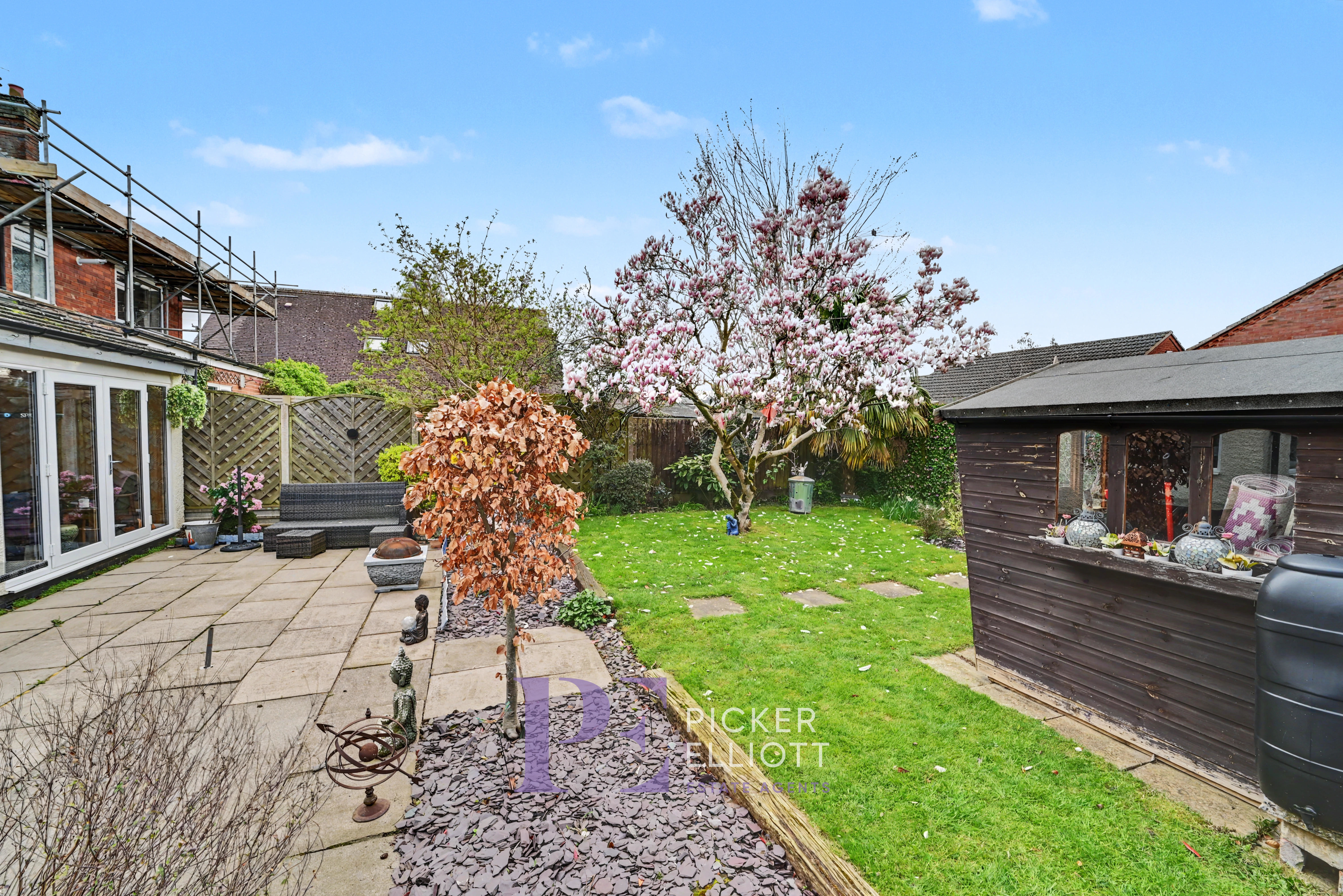 Step outside and you will find a patio area, surrounded by decorative borders featuring broken slate, mature plants, and vibrant shrubs. The garden is mainly laid to lawn and enclosed by well-tended borders, hedging, and timber fencing, ensuring privacy and a sense of tranquillity. Practical touches include a garden shed for storage, an outside water tap, and security lighting for peace of mind. The large asphalt driveway to the front provides parking for several vehicles, with decorative borders adding a welcoming touch. Gated side access leads seamlessly to the rear garden, making this outdoor space both functional and inviting.