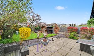 Large patio area with surrounding decorative borders laid with broken slate and various plants and shrubs, mainly laid to lawn enclosed by surrounding borders, hedging and timber fencing. Garden shed, outside water tap and security lighting.