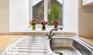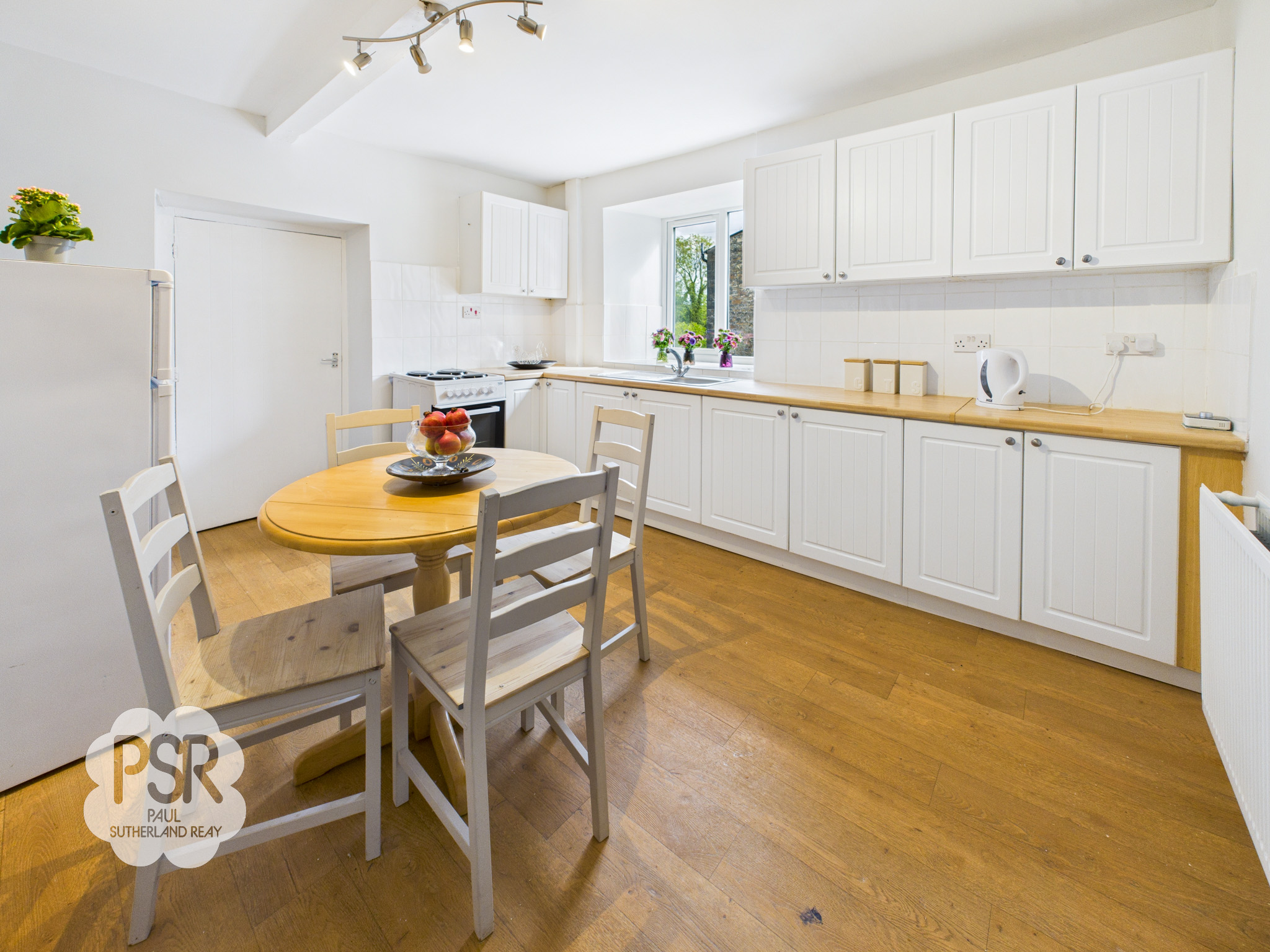 Double glazed uPVC window to the side elevation of the property, oak effect linoleum flooring, ceiling mounted spotlighting, double radiator, white tiled splashbacks, matching white wall and base units with laminate worktops, stainless steel kitchen sink and drainer with chrome mixer tap over, under stairs storage cupboard. Space for a fridge freezer, electric cooker with dedicated supply, stairs to lower ground floor.