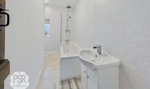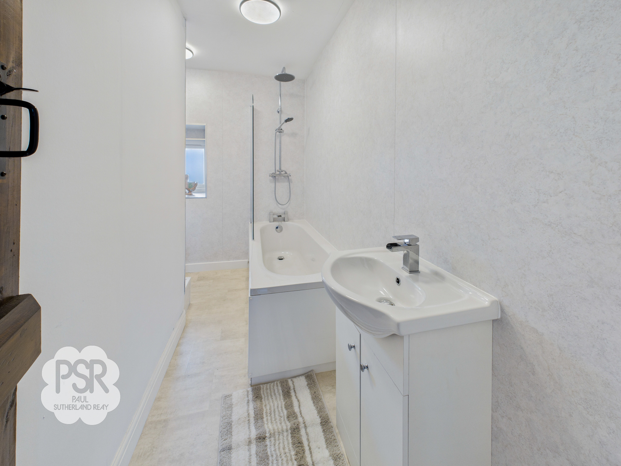 Double glazed uPVC window with privacy glass to the rear elevation, newly fitted white bathroom suite comprising low level push flush WC, panelled bath with rain and handheld shower attachment, vanity basin with cupboards below, marble effect wet walls and grey linoleum flooring.