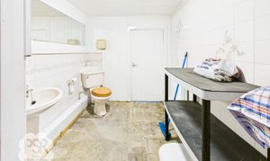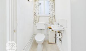 A single glazed window of timber frame construction with privacy glass to the rear elevation of the property with a window extractor fan, tiled flooring, wall mounted fluorescent light, wall hung hand basin with chrome taps over, low level WC.