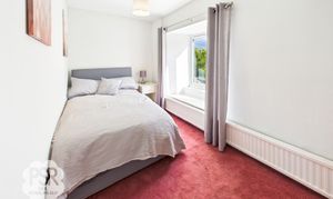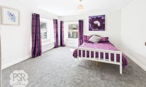 Large double bedroom, double glazed uPVC windows to the front and side elevations, double radiator, oak farmhouse style latch door, newly carpeted floor, ceiling pendant light.