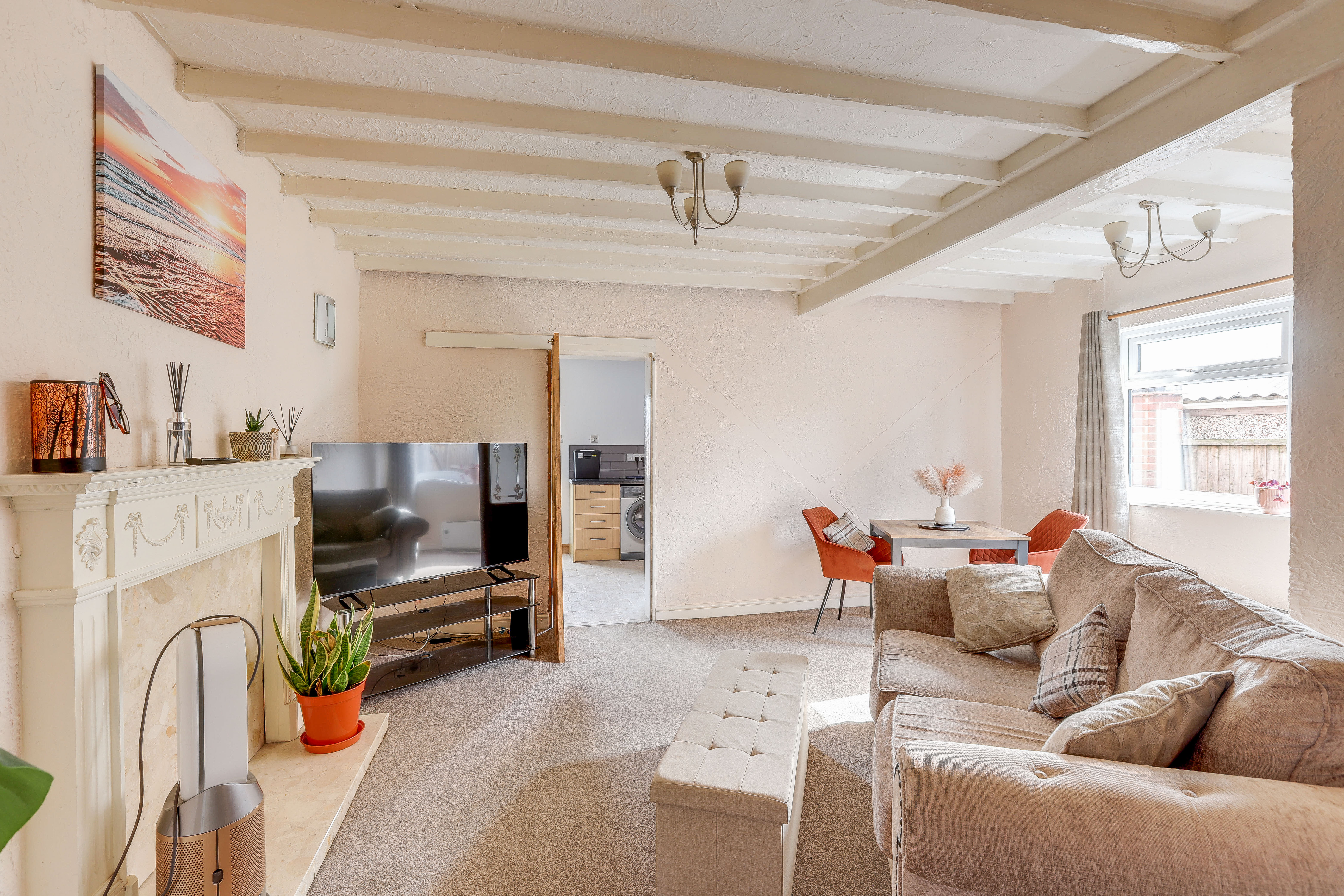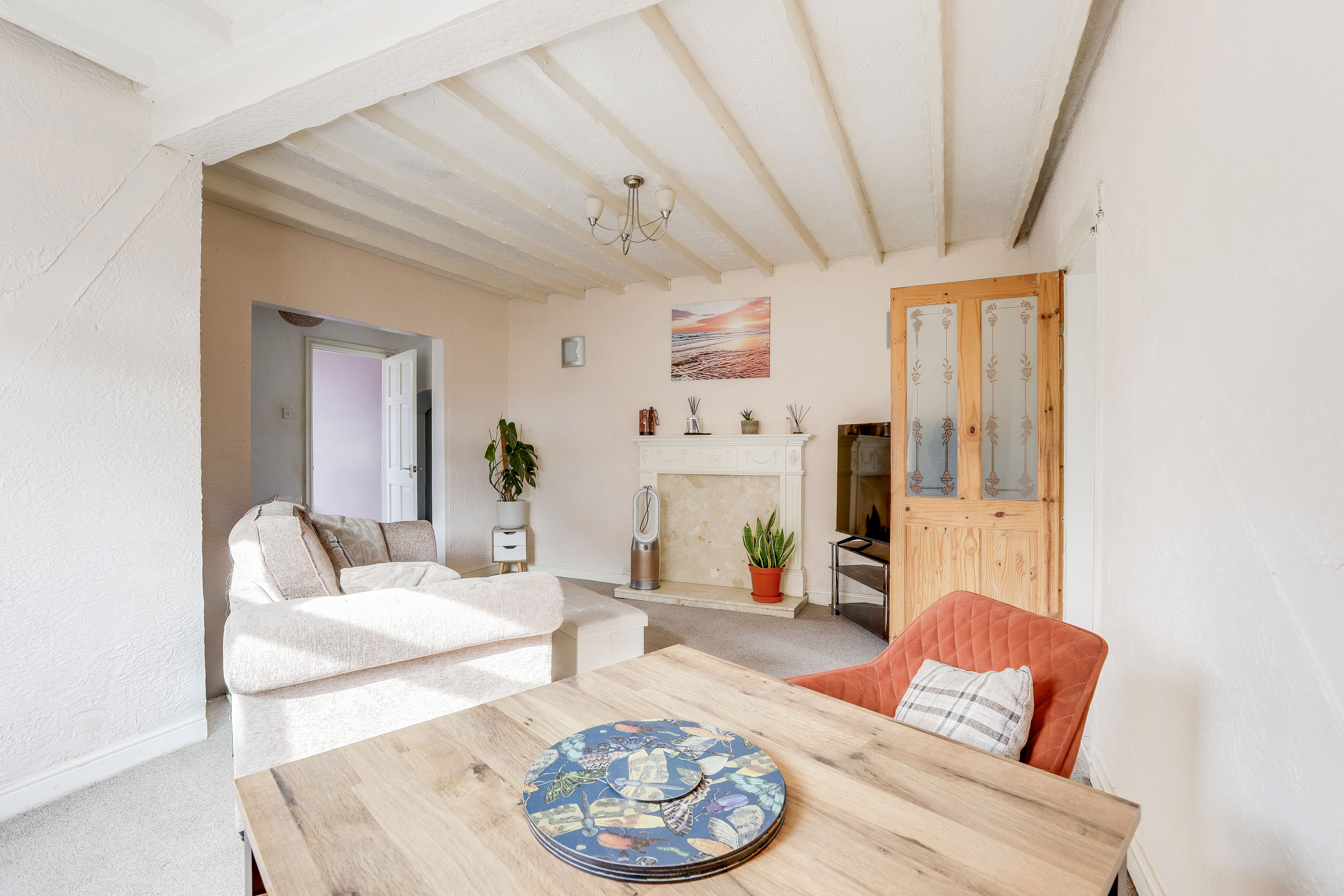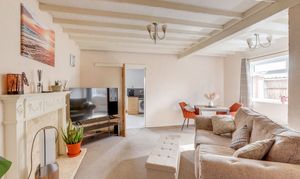 The living room has carpeted flooring, exposed ceiling beams, a feature mantelpiece and a UPVC double-glazed window to the side elevation.