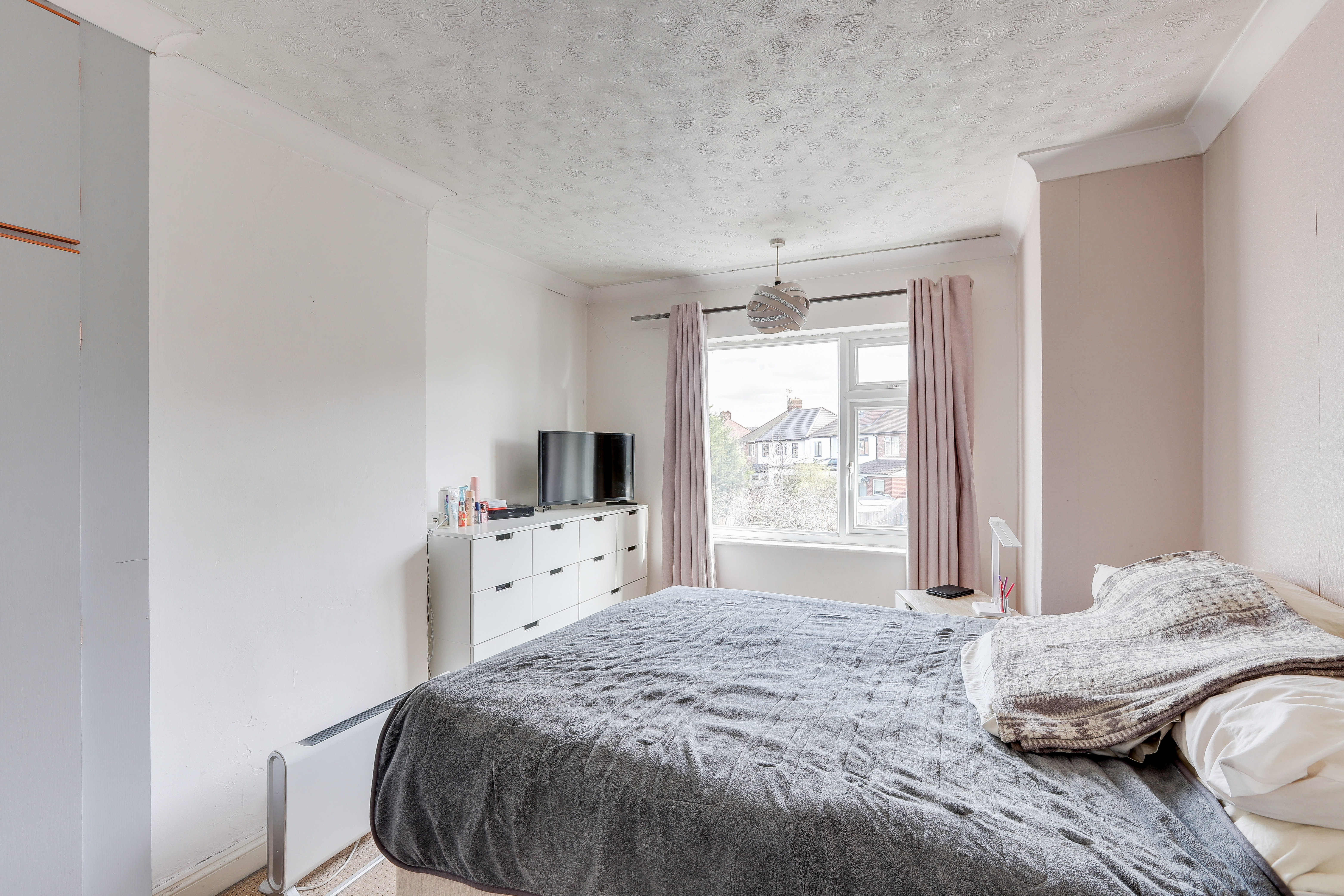 The main bedroom has carpeted flooring, ceiling coving, an in-built cupboard and a UPVC double-glazed window to the rear elevation.