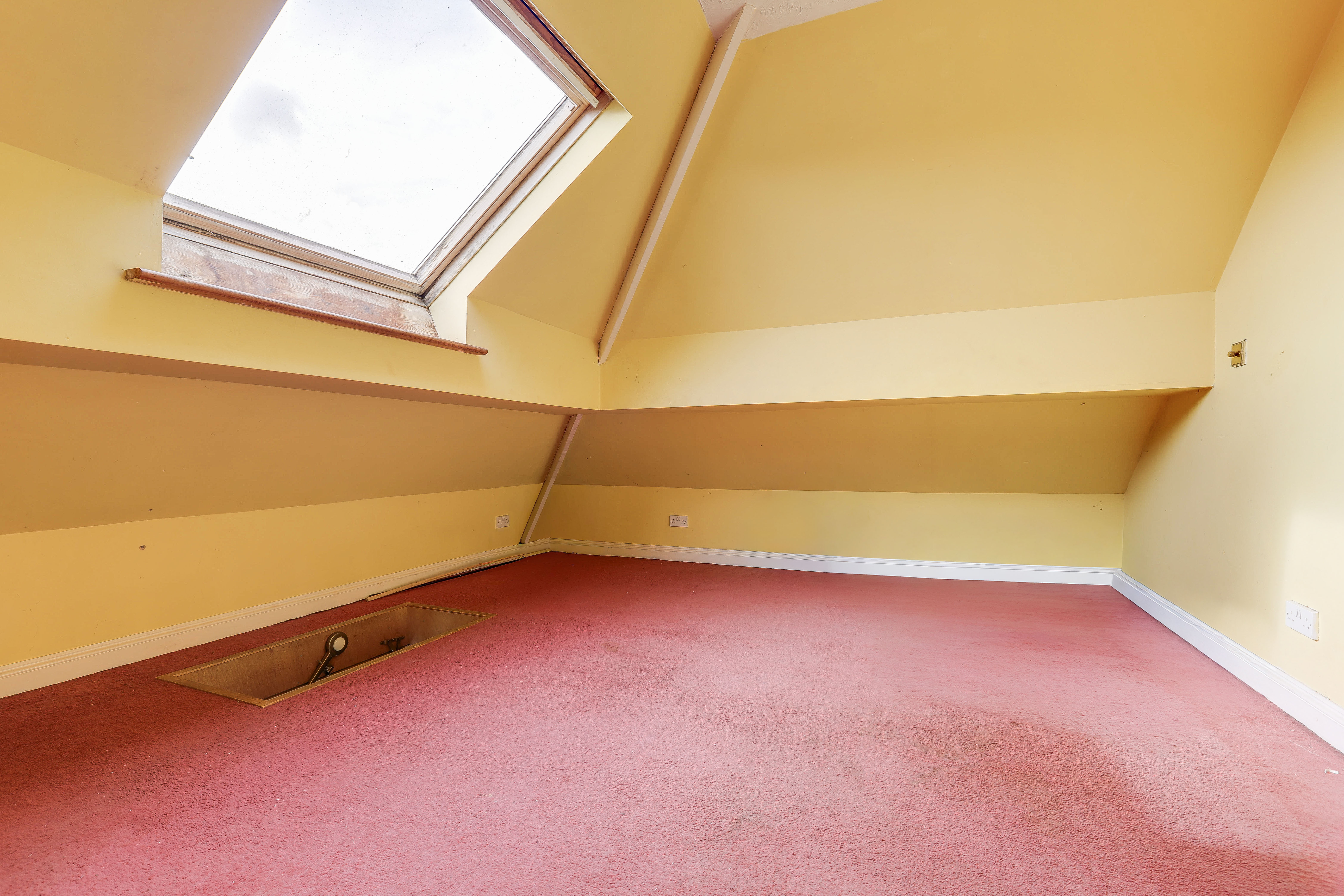 This space has carpeted flooring and a skylight window.