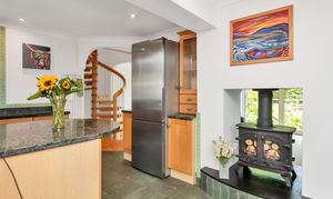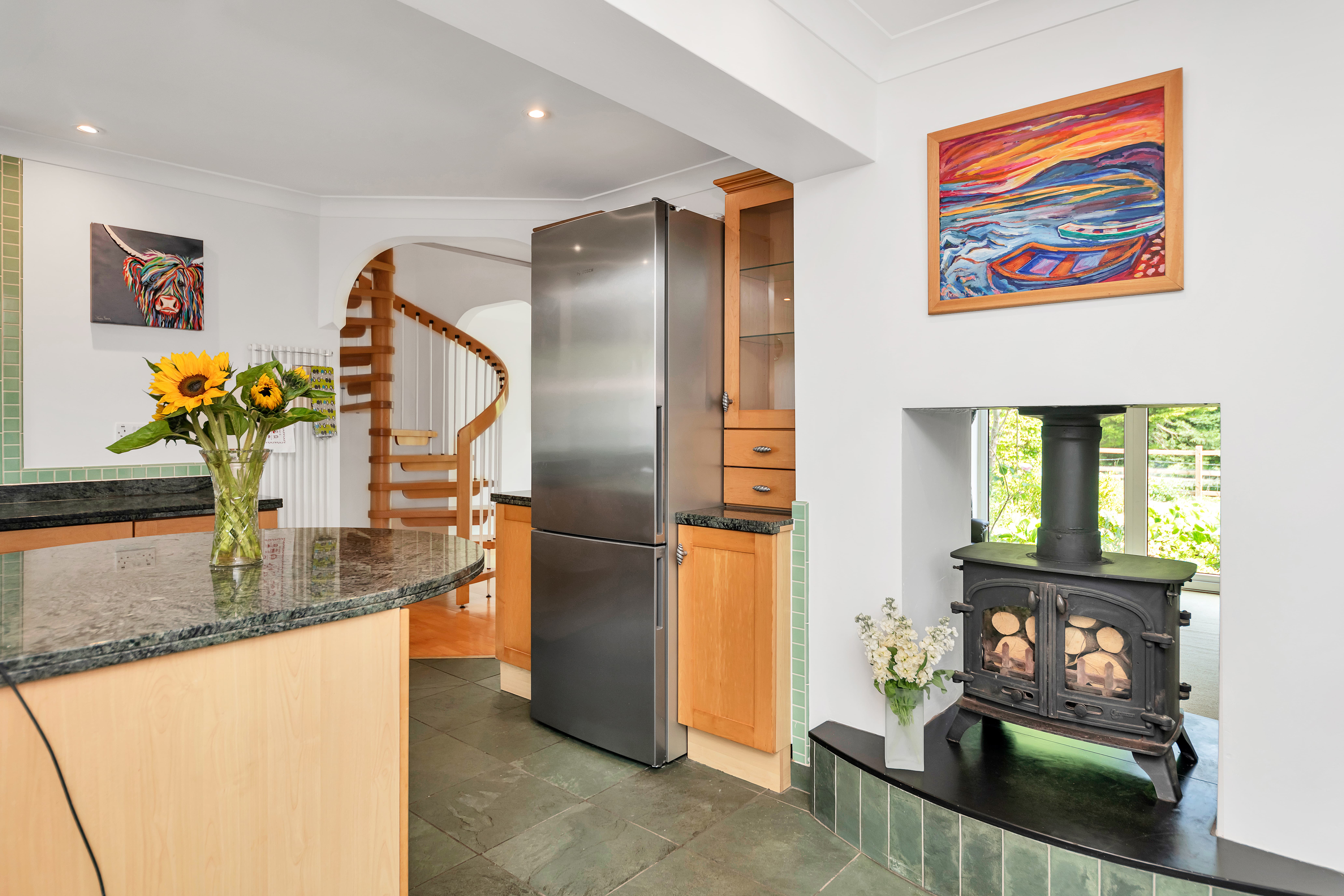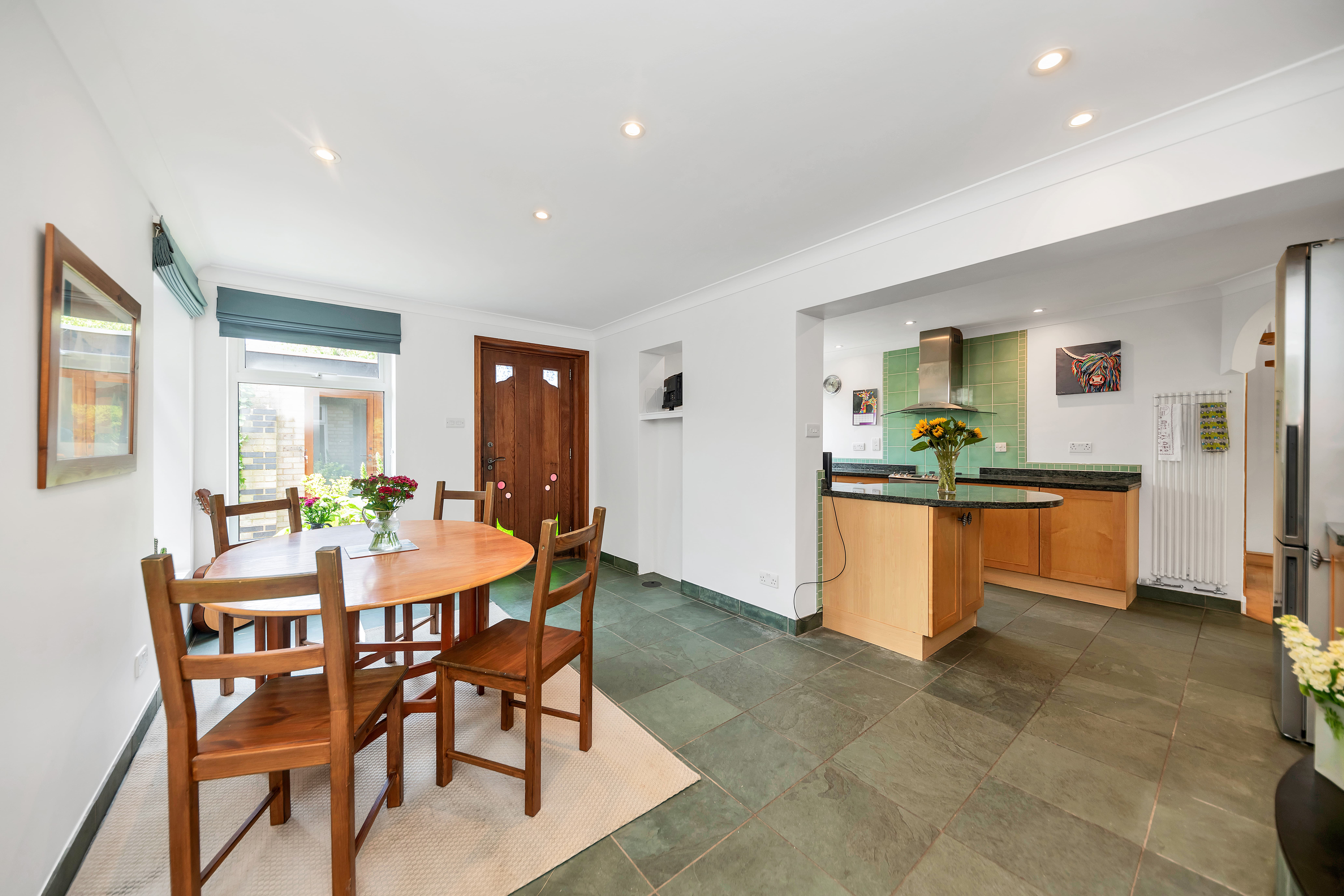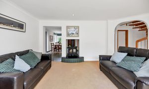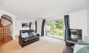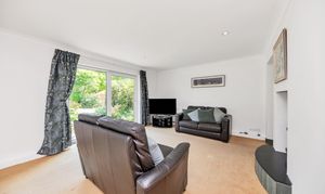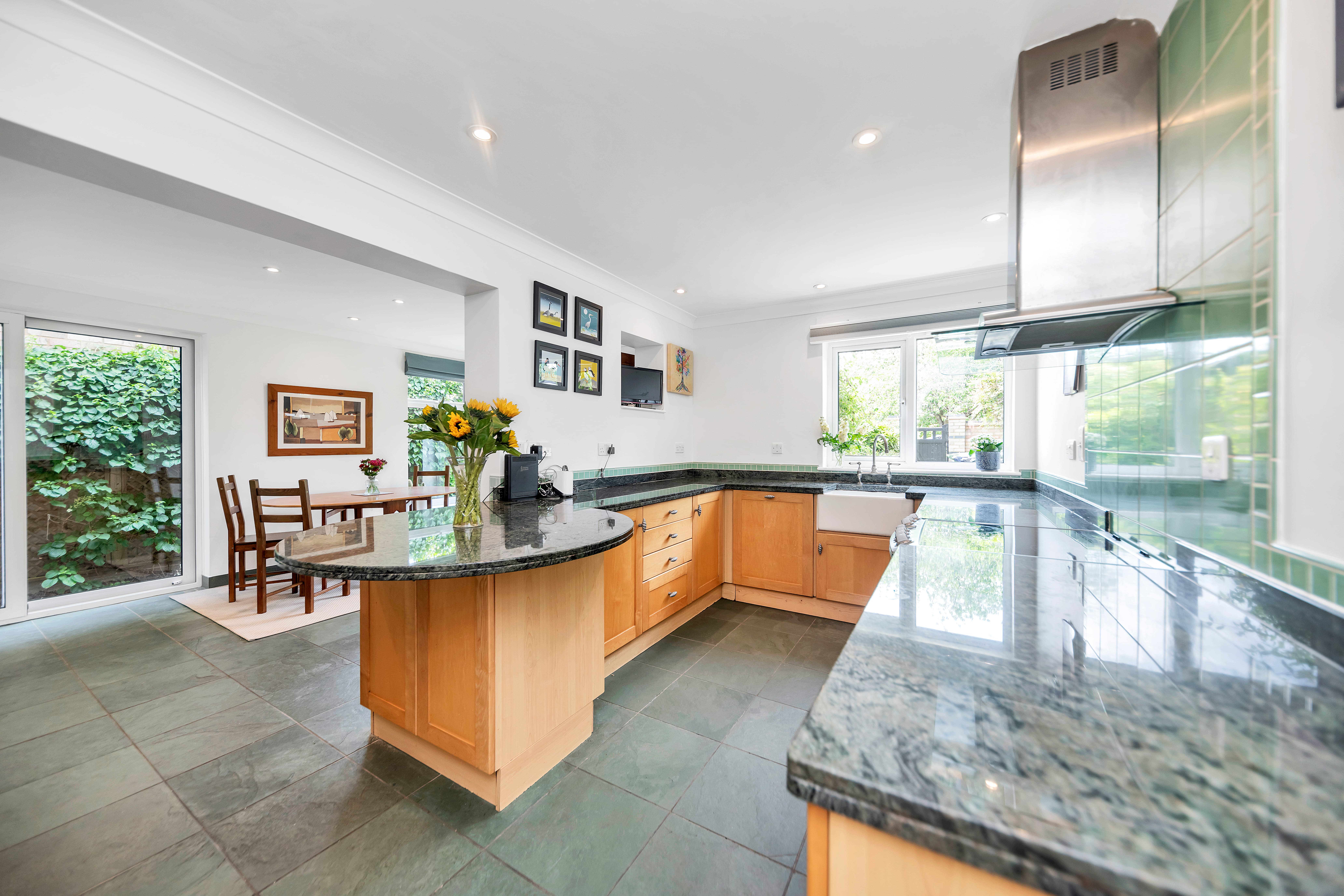 Upon stepping inside you enter the dining room which enjoys an open-plan atmosphere with both the kitchen and lounge spaces, perfect for entertaining. The dining room itself enjoys tiled flooring, windows and double French doors to a side access, inset lighting, and space for a large dining setting. Moving into the kitchen space, there is a breakfast bar, granite worktops, a range of base units, tiled flooring and splash backs, a window to the front aspect, a butler sink, an integrated dishwasher, an extractor hood, cooker, space for a fridge/freezer and flexible, inset lighting. The adjacent utility room offers further storage, space for large laundry appliances, a shower and access to the downstairs WC. The lounge is a bright and very spacious room benefitting from large windows and double sliding doors to the rear aspect, with a stunning view through the garden to the trees and meadow beyond.